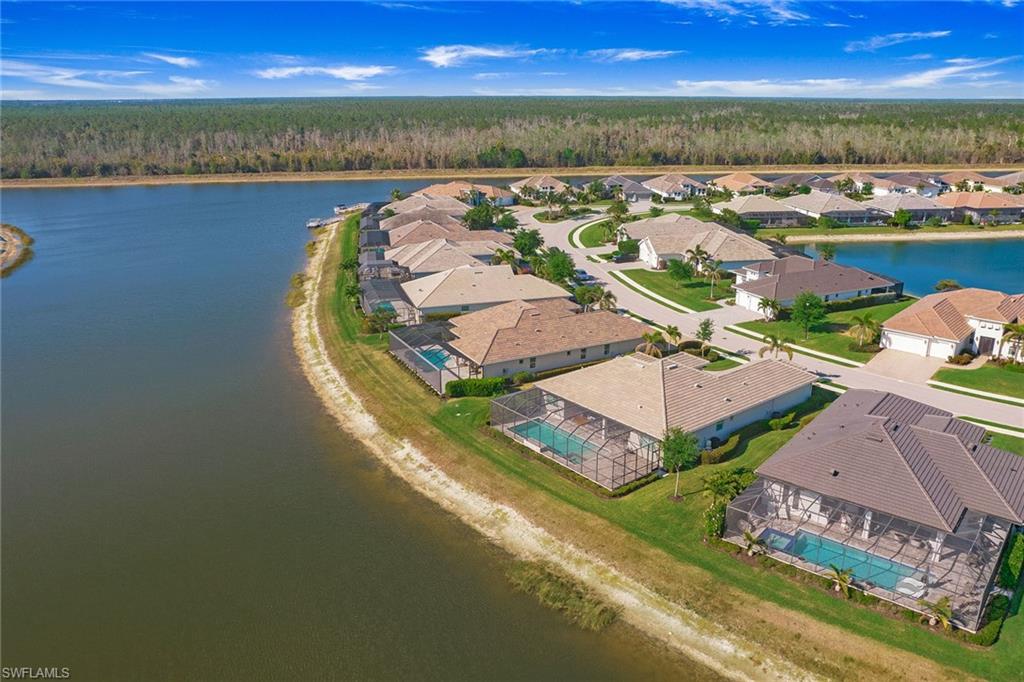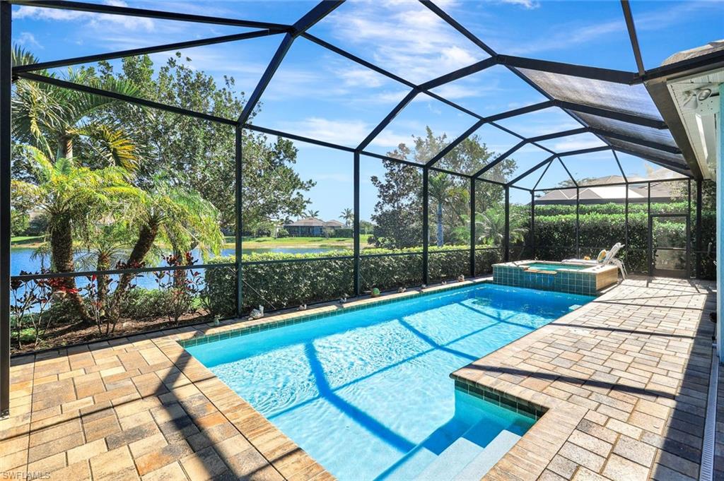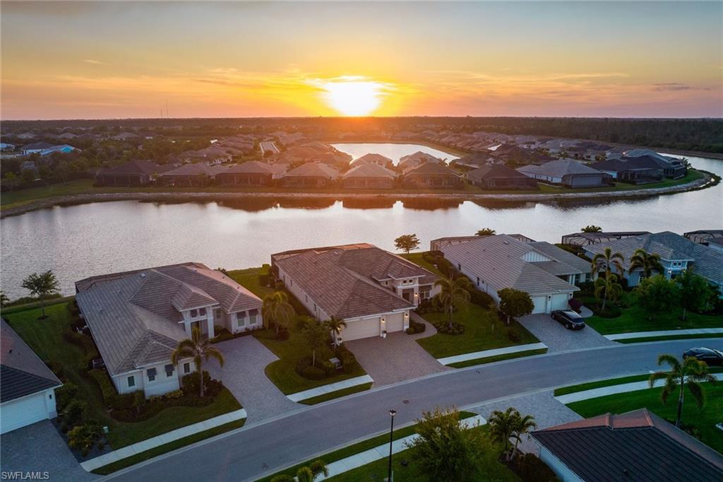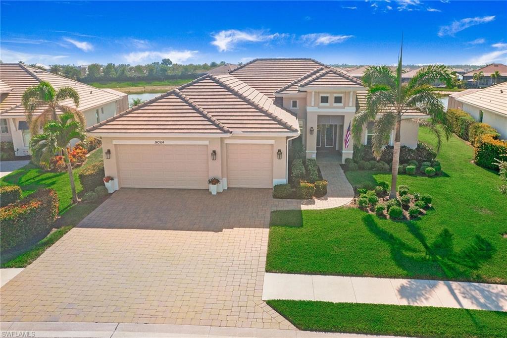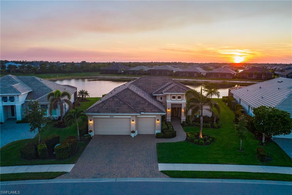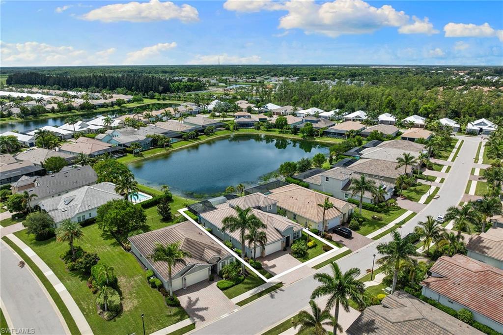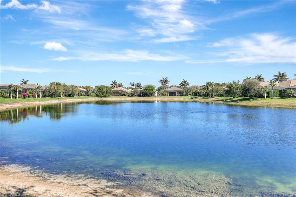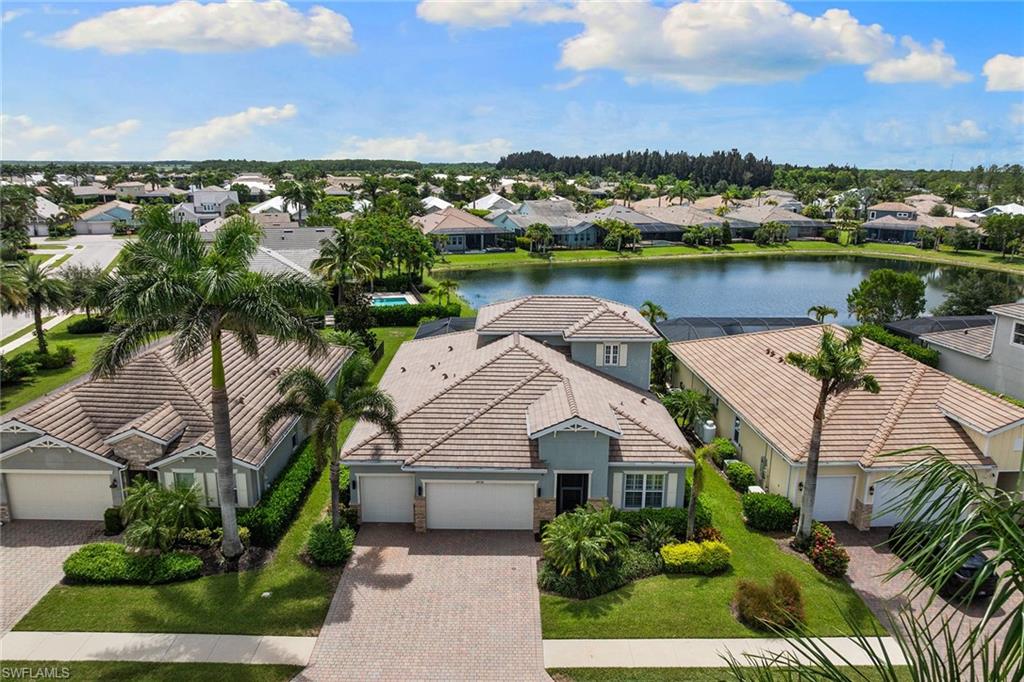 Welcome to 14714 Leeward Drive, a beautifully upgraded 3-bedroom, 3 1/2-bath lakefront residence offering 2,542 square feet of elegant living space with true southern exposure. This meticulously maintained home built by Ashton Woods features unobstructed lake views from the living room and primary suite, professionally landscaped grounds, and a rare wrap-around paver patio that extends along the side and rear of the home, creating exceptional outdoor living and entertaining space. The exterior enhancements include two remote-controlled lighted water fountains, programmable Lutron lighting around the home, a Blink security system with cameras at the front door, driveway, and rear, a summer kitchen and an outdoor ceiling fan. Inside, the home showcases natural stone flooring in the main areas and plush carpeting in the bedrooms. Each of the three bedrooms offers the privacy of its own bathroom. Storm-rated 7.5-foot French doors in the living room frame expansive lake views and lead to the outdoor patio. The kitchen features custom Italian cabinetry by Veneta Cucine with soft-close hardware, a large five-by-ten-foot island with extensive storage, a Whirlpool Gold Series built-in oven and microwave, and a 36-inch KitchenAid induction cooktop. Additional interior highlights include abundant storage throughout, a spacious laundry room with upper cabinets and under-counter storage, upgraded Minka Aire Raptor ceiling fans, wooden plantation shutters with 2.5-inch louvers, light dimmers throughout, flush-mounted dimmable LED lighting, a newer water heater, sliding glass shower doors in the front guest suite, and large flat-screen televisions with Sonos soundbars in both the living room and primary bedroom. Located in one of Naples’ most desirable communities, residents enjoy resort-style amenities including a clubhouse, fitness center, resort and lap pools, tennis, pickleball, walking trails, lakes, and gated security. With its premium southern exposure, extensive outdoor enhancements, high-end interior finishes, and peaceful lakefront setting, this home offers the ideal blend of comfort, design, and luxury living close to Naples beaches, shopping, dining, and Marco Island.