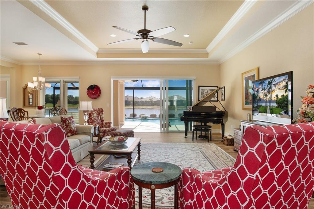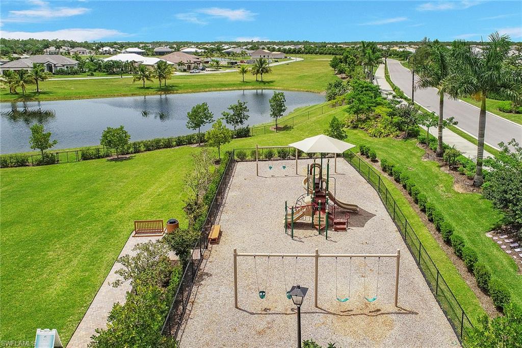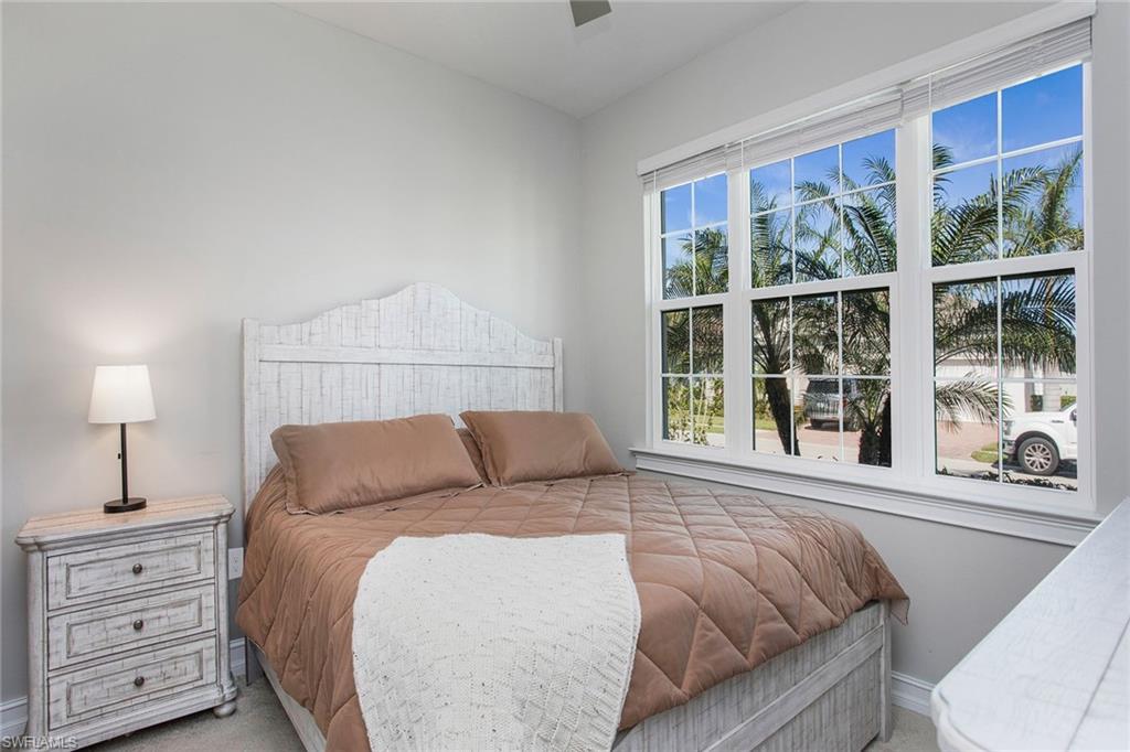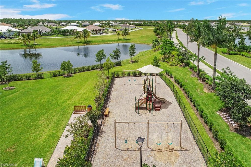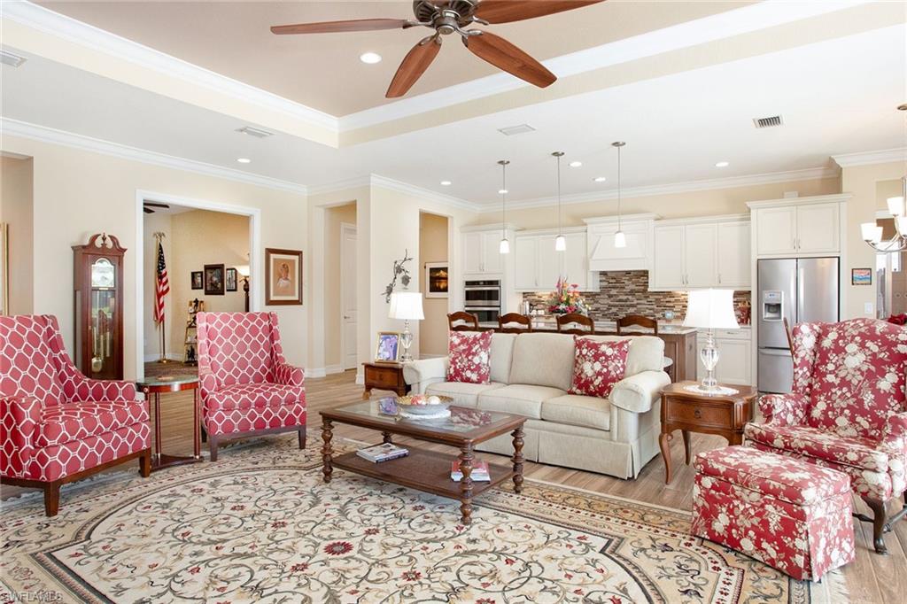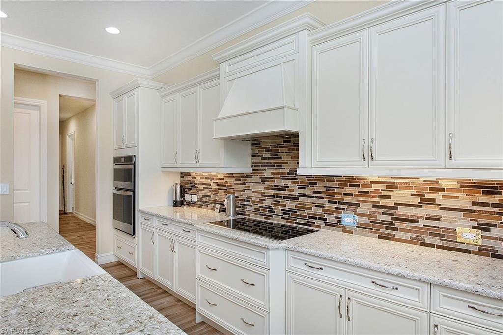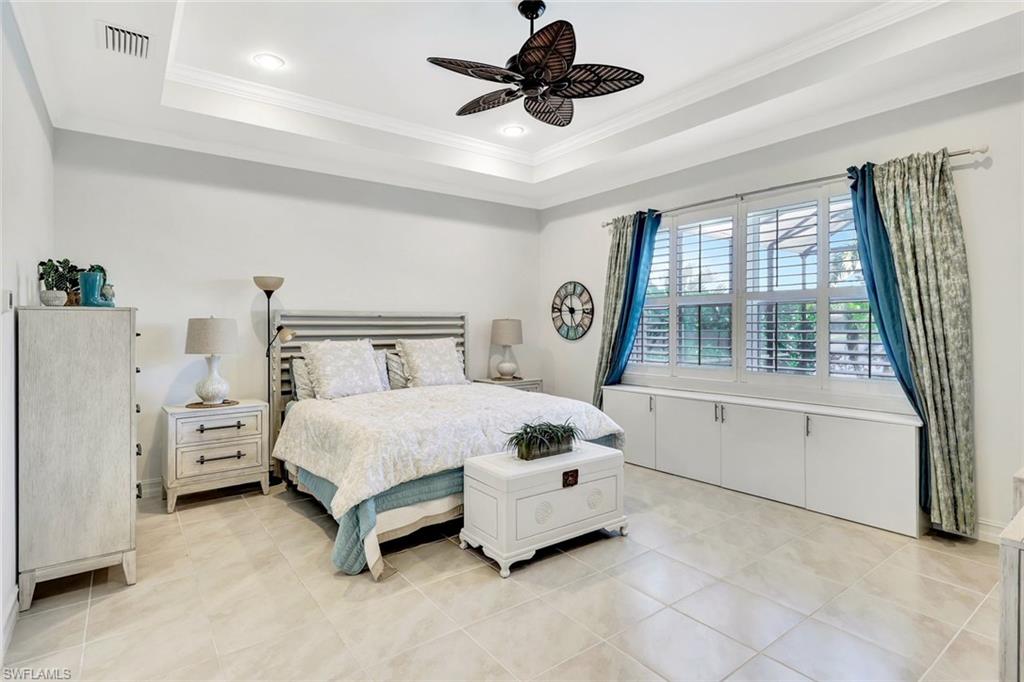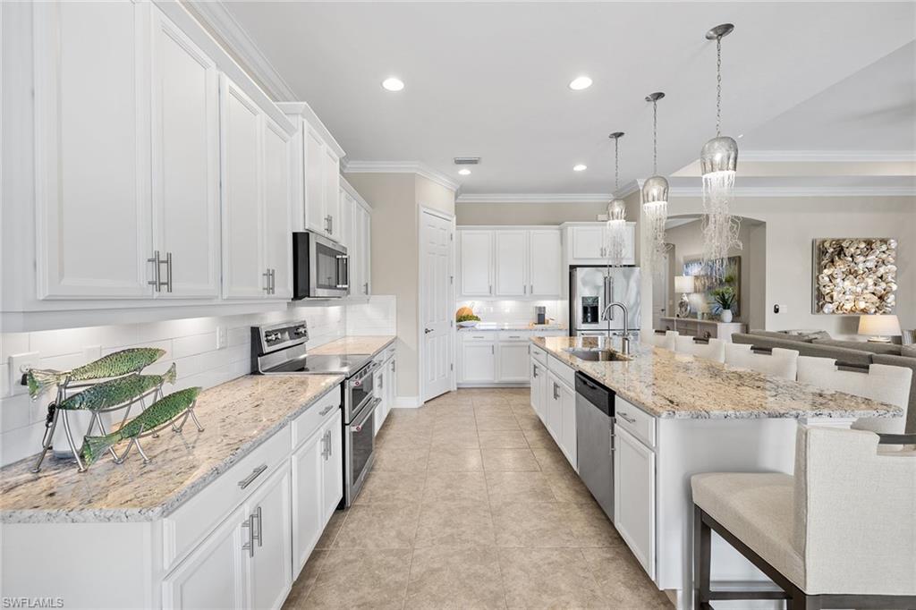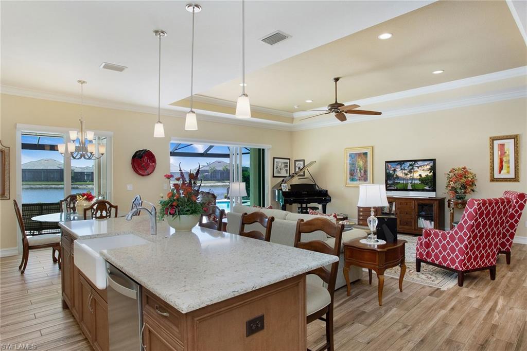 Welcome to 14714 Leeward Drive, a beautifully upgraded 3-bedroom, 3 1/2-bath lakefront residence offering 2,542 square feet of elegant living space with true southern exposure. This meticulously maintained home built by Ashton Woods features unobstructed lake views from the living room and primary suite, professionally landscaped grounds, and a rare wrap-around paver patio that extends along the side and rear of the home, creating exceptional outdoor living and entertaining space. The exterior enhancements include two remote-controlled lighted water fountains, programmable Lutron lighting around the home, a Blink security system with cameras at the front door, driveway, and rear, a summer kitchen and an outdoor ceiling fan. Inside, the home showcases natural stone flooring in the main areas and plush carpeting in the bedrooms. Each of the three bedrooms offers the privacy of its own bathroom. Storm-rated 7.5-foot French doors in the living room frame expansive lake views and lead to the outdoor patio. The kitchen features custom Italian cabinetry by Veneta Cucine with soft-close hardware, a large five-by-ten-foot island with extensive storage, a Whirlpool Gold Series built-in oven and microwave, and a 36-inch KitchenAid induction cooktop. Additional interior highlights include abundant storage throughout, a spacious laundry room with upper cabinets and under-counter storage, upgraded Minka Aire Raptor ceiling fans, wooden plantation shutters with 2.5-inch louvers, light dimmers throughout, flush-mounted dimmable LED lighting, a newer water heater, sliding glass shower doors in the front guest suite, and large flat-screen televisions with Sonos soundbars in both the living room and primary bedroom. Located in one of Naples’ most desirable communities, residents enjoy resort-style amenities including a clubhouse, fitness center, resort and lap pools, tennis, pickleball, walking trails, lakes, and gated security. With its premium southern exposure, extensive outdoor enhancements, high-end interior finishes, and peaceful lakefront setting, this home offers the ideal blend of comfort, design, and luxury living close to Naples beaches, shopping, dining, and Marco Island.