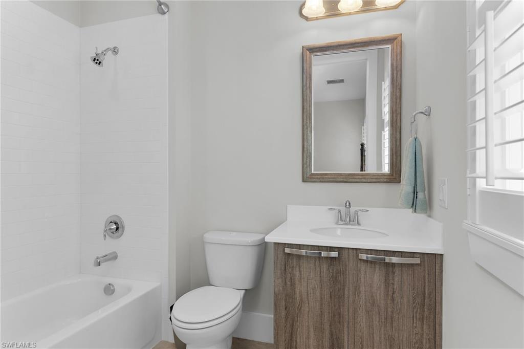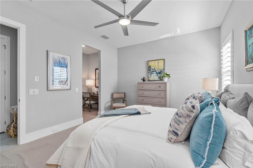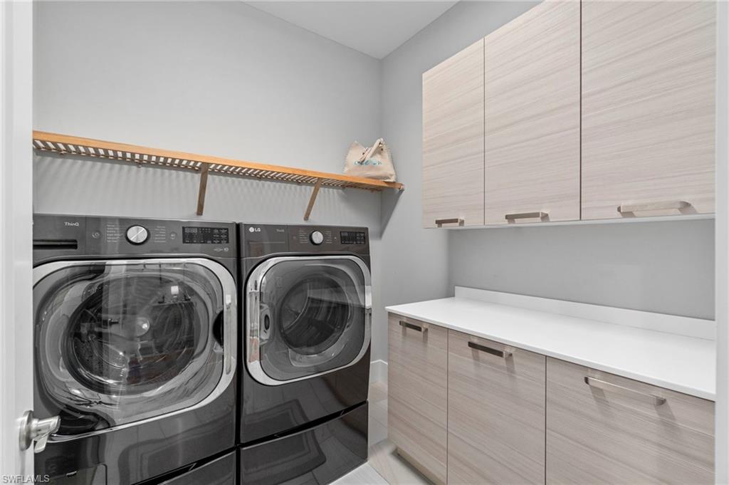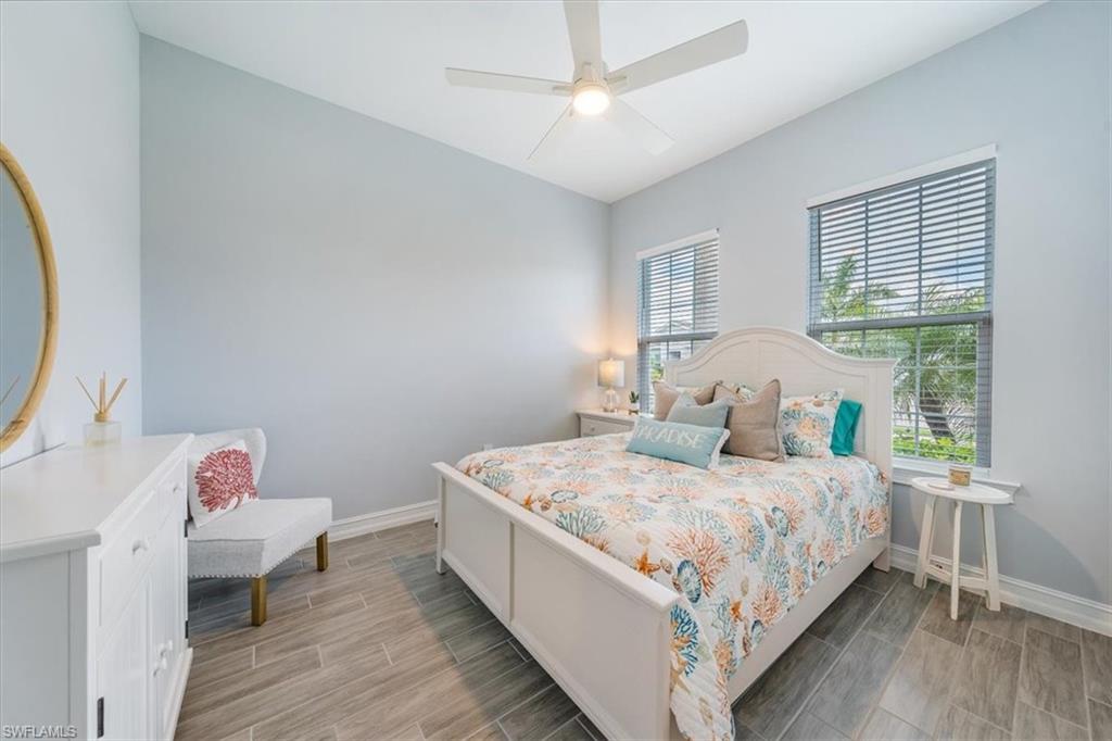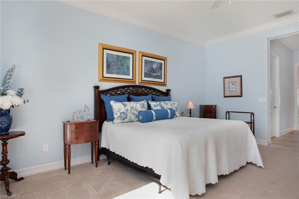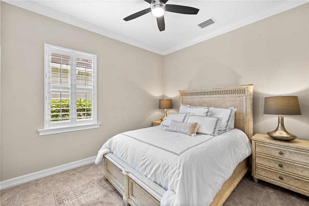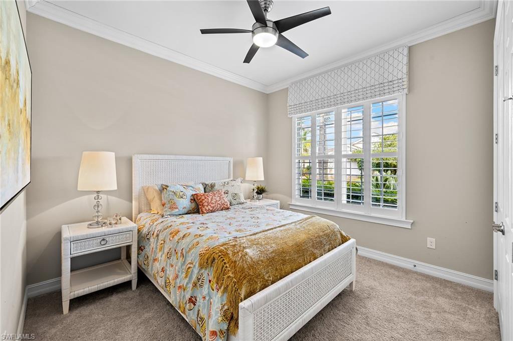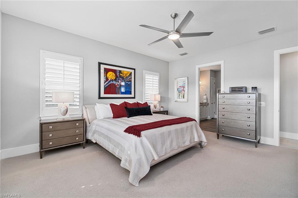 Welcome to 14714 Leeward Drive, a beautifully upgraded 3-bedroom, 3 1/2-bath lakefront residence offering 2,542 square feet of elegant living space with true southern exposure. This meticulously maintained home built by Ashton Woods features unobstructed lake views from the living room and primary suite, professionally landscaped grounds, and a rare wrap-around paver patio that extends along the side and rear of the home, creating exceptional outdoor living and entertaining space. The exterior enhancements include two remote-controlled lighted water fountains, programmable Lutron lighting around the home, a Blink security system with cameras at the front door, driveway, and rear, a summer kitchen and an outdoor ceiling fan. Inside, the home showcases natural stone flooring in the main areas and plush carpeting in the bedrooms. Each of the three bedrooms offers the privacy of its own bathroom. Storm-rated 7.5-foot French doors in the living room frame expansive lake views and lead to the outdoor patio. The kitchen features custom Italian cabinetry by Veneta Cucine with soft-close hardware, a large five-by-ten-foot island with extensive storage, a Whirlpool Gold Series built-in oven and microwave, and a 36-inch KitchenAid induction cooktop. Additional interior highlights include abundant storage throughout, a spacious laundry room with upper cabinets and under-counter storage, upgraded Minka Aire Raptor ceiling fans, wooden plantation shutters with 2.5-inch louvers, light dimmers throughout, flush-mounted dimmable LED lighting, a newer water heater, sliding glass shower doors in the front guest suite, and large flat-screen televisions with Sonos soundbars in both the living room and primary bedroom. Located in one of Naples’ most desirable communities, residents enjoy resort-style amenities including a clubhouse, fitness center, resort and lap pools, tennis, pickleball, walking trails, lakes, and gated security. With its premium southern exposure, extensive outdoor enhancements, high-end interior finishes, and peaceful lakefront setting, this home offers the ideal blend of comfort, design, and luxury living close to Naples beaches, shopping, dining, and Marco Island.