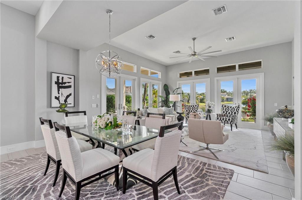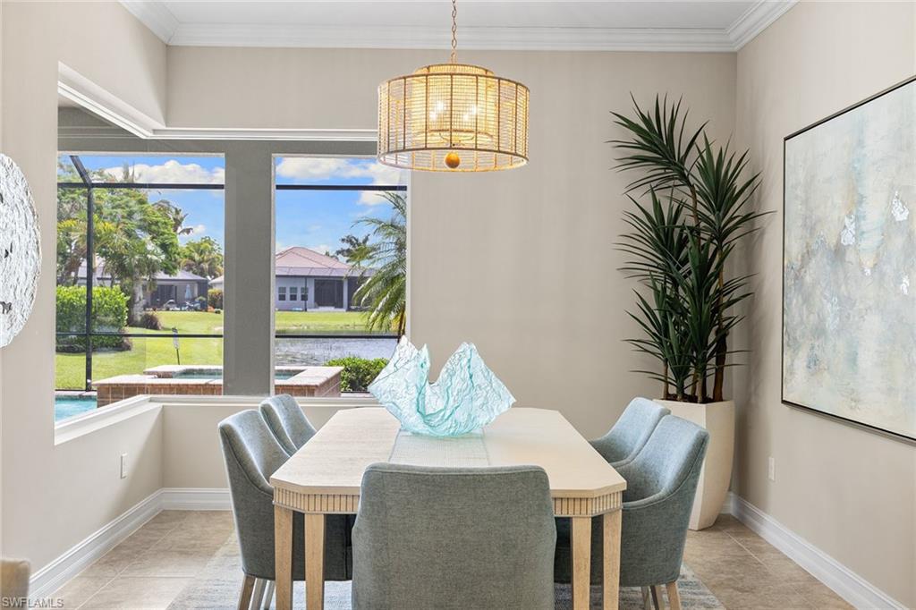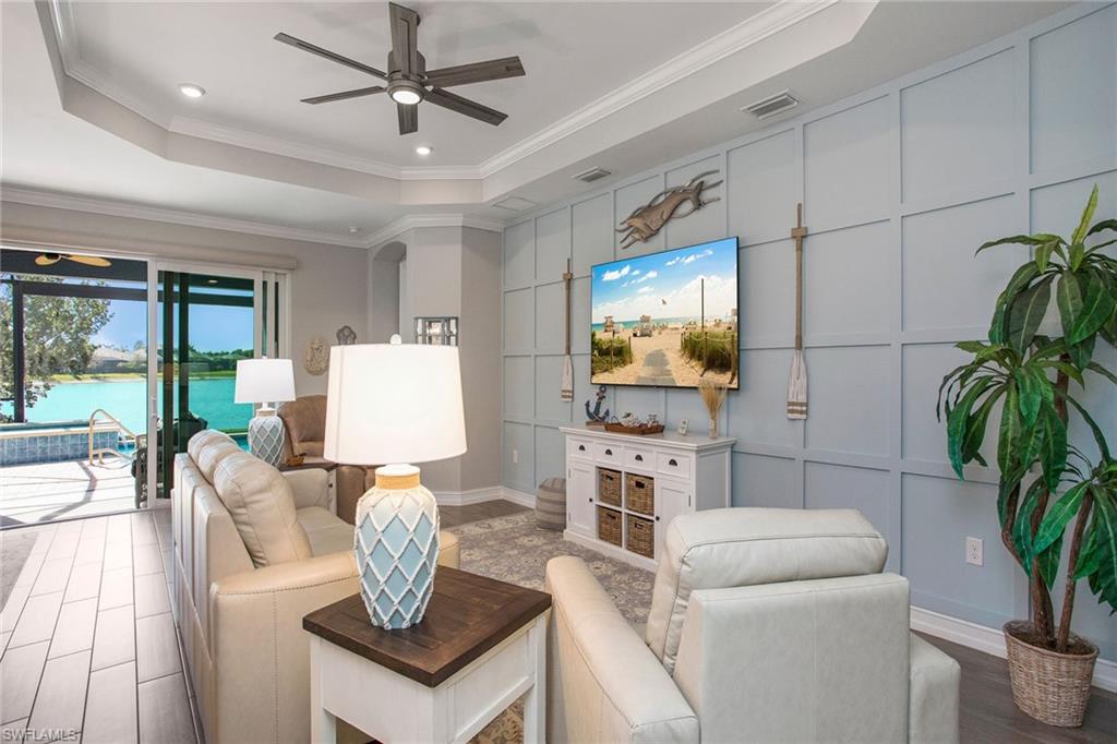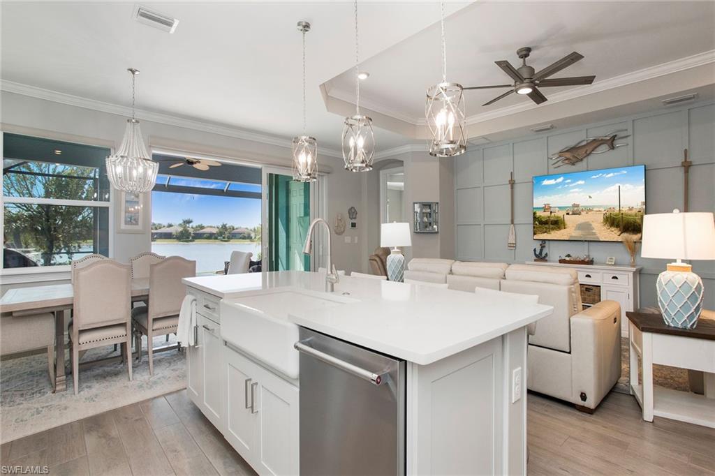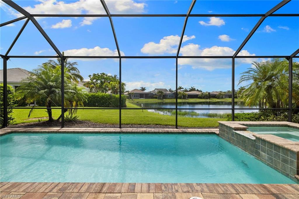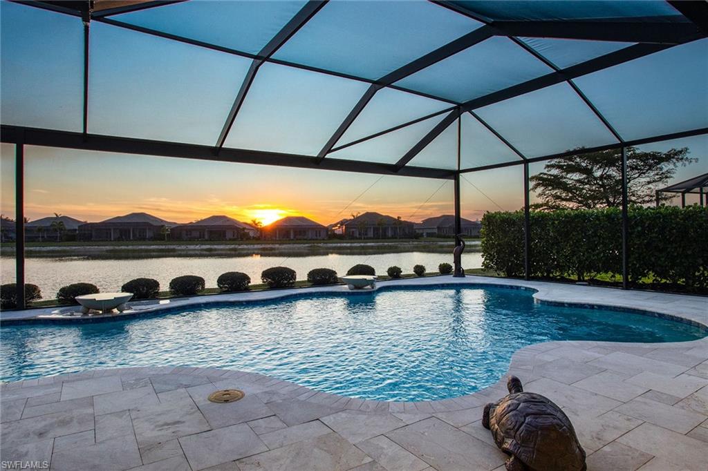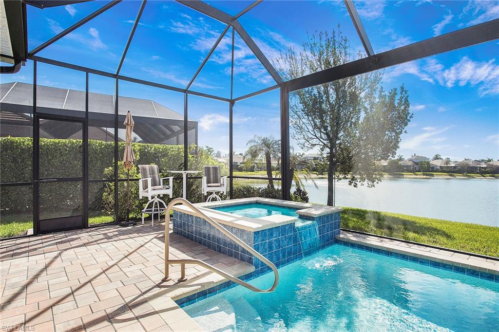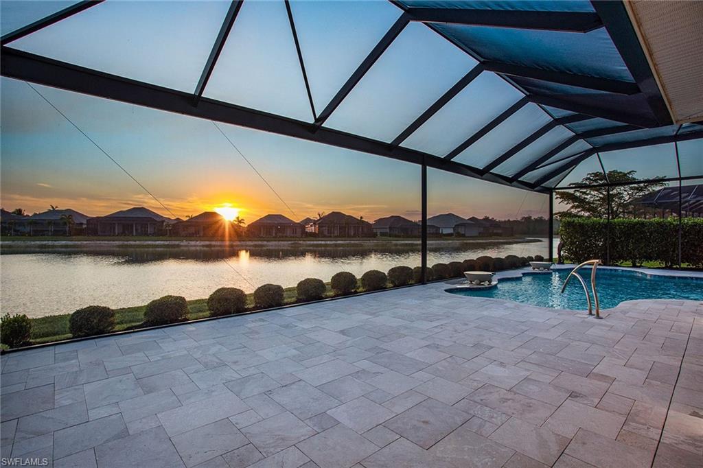 This meticulously designed three-bedroom-plus-den residence offers serene, sunset-facing water views and an exceptional blend of style and functionality. The outdoor living space is a standout feature, showcasing a custom saltwater pool with cascading fountains, an elegant travertine deck, and a ClearView picture-frame screen for unobstructed vistas. Electric rolldown shades provide effortless privacy and shade with the touch of a button. The popular Stock Marathon floor plan highlights open-concept living, ideal for entertaining. Interior features include wood-look tile flooring throughout the main living areas and a chef’s kitchen outfitted with quartz countertops, a farmhouse sink, an induction cooktop, walk-in pantry and sleek, modern finishes. Constructed with impact glass windows and doors, the home offers aesthetic appeal and added storm protection. The property includes the opportunity to add a private boat dock, enhancing its waterfront lifestyle appeal. In the amenity-rich Naples Reserve, residents enjoy a resort-style clubhouse, pool, private island, tiki bar, fitness center, tennis, pickleball and more. Just minutes from Naples pristine beaches and upscale dining, this home offers a blend of luxury and lifestyle. This residence is a rare offering, blending luxury, convenience and the peaceful elegance of a sunset waterfront location.