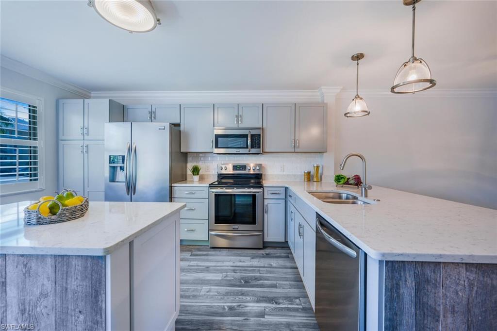 Are you able to recognize a great deal when you see it? Don't Miss This One! Impeccable and Move-In Ready! If you are looking for a Naples Pied A Terre or an Overflow Guest Home, this might be it! Completely remodeled with quality finishes throughout, this End-Unit condo has lots of natural light and offers an open floor plan, 2 bedrooms, 2 bathrooms, an enclosed lanai with a tranquil preserve view and a spacious laundry room with extra storage. The kitchen features a breakfast bar, center island, quartz counter tops, tiled backsplash, stainless steel Frigidaire Gallery appliances, 5 burner range, double sink and new wood "Merillat Masterpiece Cabinetry" with soft closed, convenient pull-out drawers in pantry and waste and recycle bins. The owner's and guest's bathrooms have been updated with spacious showers, quality glass shower doors, new wood vanities with three drawers, soft close cabinets and quartz countertops and the owner's bedroom offers a spacious walk-in closet. Other upgrades include modern tile in bathrooms and showers and engineered laminate flooring, crown moldings, IMPACT RESISTANT WINDOWS & SLIDERS, automatic slider shades on remote, plantation shutters on all windows, fans and lights, TV brackets already installed in living room and bedrooms. This 1st floor condo is a corner unit with parking right in front of the unit and is located just steps to the BBQ area and one of the two heated community pools, just a short walk to the club house, main pool and boat docks. Enjoy living in a tranquil community located 5 min to Historic Olde Naples offering activities, events, superb dining and shopping, Naples Pier, renown white sandy beaches and nearby the newly developed 15-acre Baker Park offering outdoor fitness, sunrise terrace, bike paths, 1.3-mile trail with view of the Gordon River, pedestrian bridge, splash pads and more!