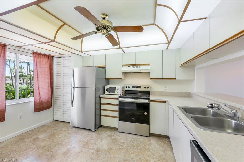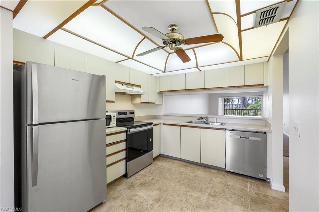 This updated 2 bedroom, 2 bathroom condo is located in the quiet and private community of Naples Sandpiper Bay Club, just minutes from downtown Naples and the beaches. The unit features an open layout with abundant natural light throughout. The kitchen has been updated with stainless steel appliances and modern finishes perfect for a Florida condo. The primary bedroom includes a large walk-in closet and a spacious en-suite bathroom with a separate shower and toilet area. Situated on a raised first floor, the condo offers easy access while providing added peace of mind, it has never flooded. Naples Sandpiper Bay Club spans 13 acres along Haldeman Creek and offers a peaceful setting with beautifully landscaped grounds. Community amenities include two swimming pools, a clubhouse with regular social activities, an outdoor BBQ deck with dining tables, and plenty of parking. Onsite management is available for added convenience. Gulf access is available via community boat docks, which can be leased or purchased when available.