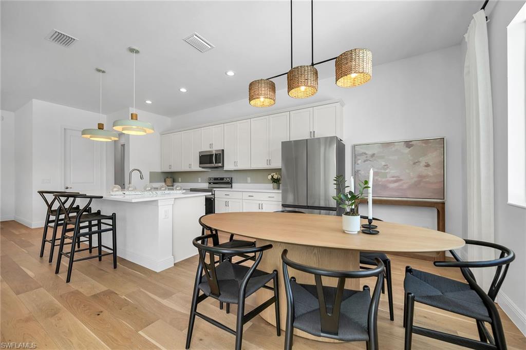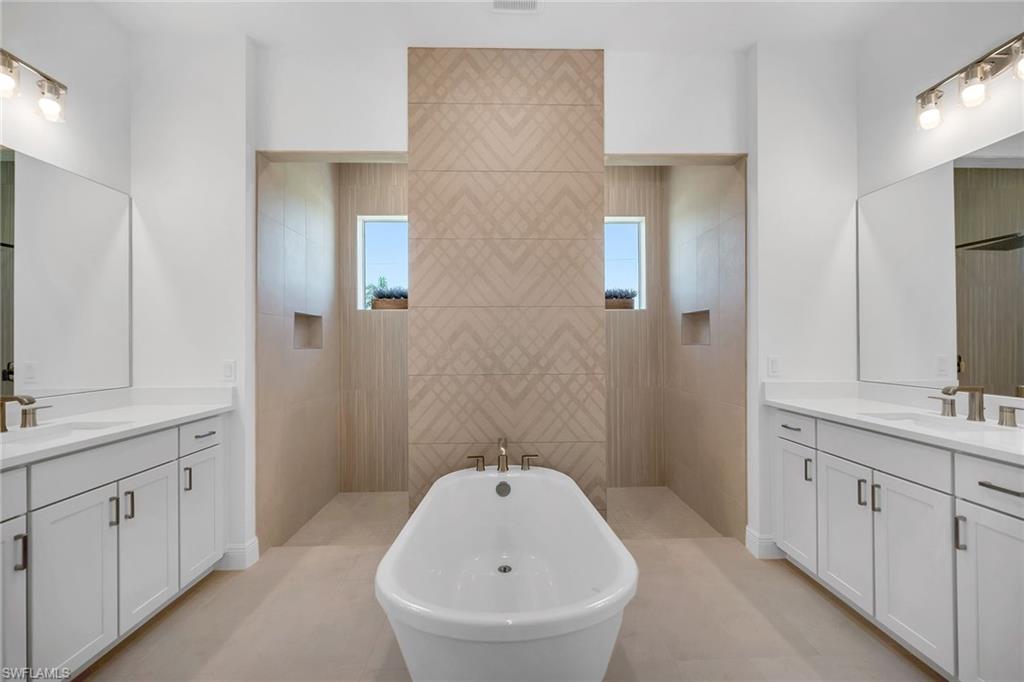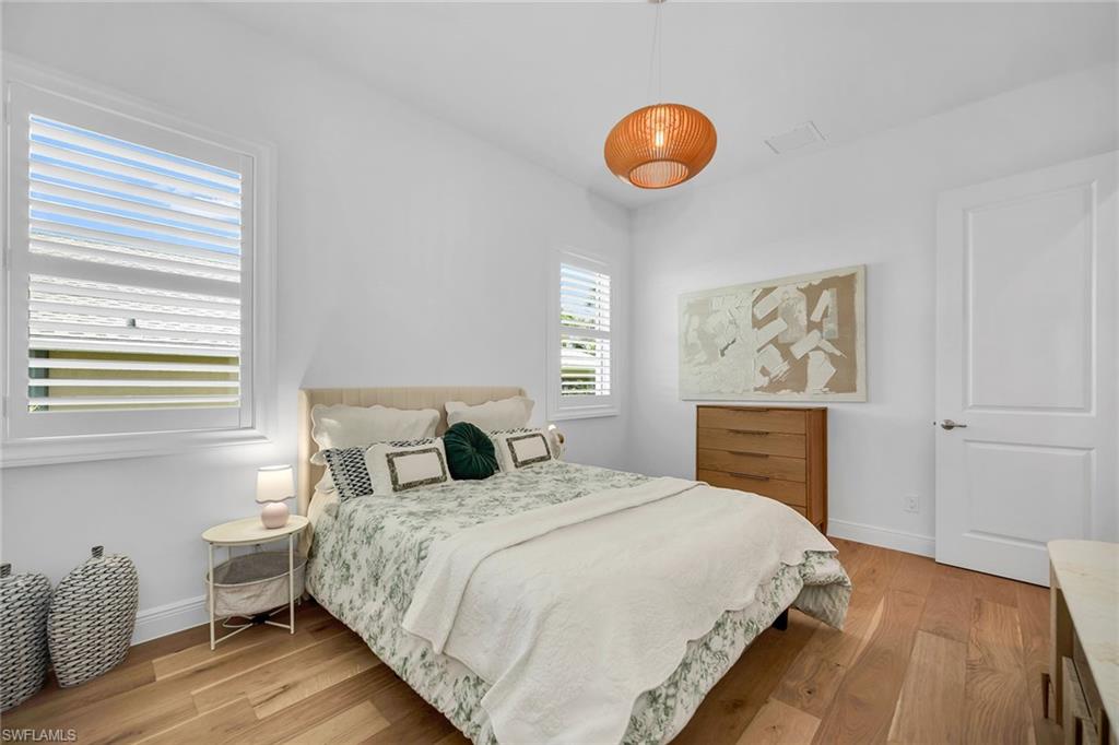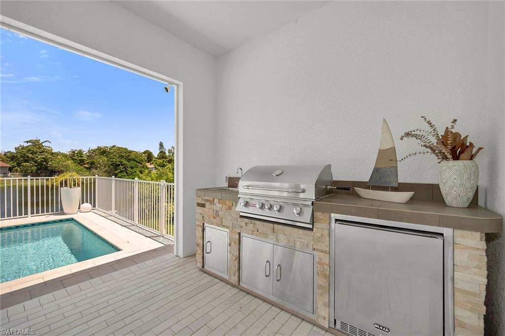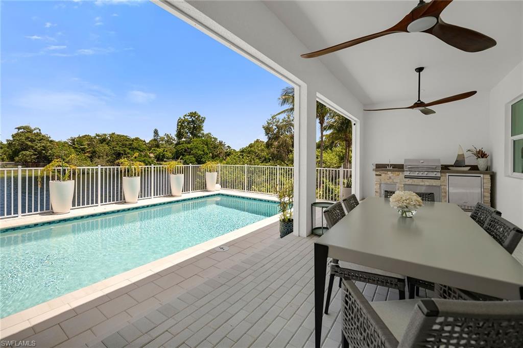 Enjoy the ultimate in luxury coastal living with this new, never-lived-in single-family pool home offering a rare combination of modern design, lakefront views, and a prime central Naples location with no HOA fees. Sitting at a high elevation of 14.8 feet, this property provides peace of mind and added security. Just minutes from world-renowned beaches, shopping, dining and top attractions, this stunning residence was custom-built in 2025 by Kaye Lifestyle Homes and professionally furnished, with furnishings negotiable. Designed for full-time living and high-end investment potential, this open-concept four-bedroom, three-bath home features a flat tile roof, soaring 12-foot tray ceilings, wide-plank hardwood floors, and hurricane-impact glass windows and doors throughout. The great room impresses with custom wall detailing and glass sliders opening to tranquil lakefront views. The gourmet kitchen offers white soft-close cabinetry, quartz countertops, a tile backsplash, pendant lighting and a large island with bar seating. A spacious walk-in pantry and new stainless steel appliances, including range, refrigerator and freezer, microwave, and dishwasher, complete the space. The adjacent dining area overlooks the water and provides direct lanai access. Go outside to a private, resort-style lanai featuring covered outdoor living with two modern ceiling fans and a custom outdoor kitchen complete with a built-in stainless steel barbecue, mini refrigerator and sink. The open heated pool and spa, built by Summit Pools, are surrounded by a fully fenced brick paver deck with unobstructed lakefront views, allowing you to enjoy stargazing nights without a cage. A dedicated pool bath provides added convenience for outdoor living. The luxurious owner’s suite offers peaceful lake and pool views, a 3D textured accent wall, two walk-in closets with built-ins and a spa-inspired bath with dual vanities, quartz counters, soaking tub and a walk-in shower with textured tile, rain head, niches and private windows. One guest bedroom has its own en-suite bath with a walk-in shower that also functions as a pool bath, while the remaining guest bedroom is served by a full bath with a custom tile shower and tub combination. The spacious layout includes a versatile fourth bedroom that can also serve as a den, office or study, complete with a closet, modern light fixture and double door entry. Additional upgrades include white plantation shutters throughout, custom trim and baseboards, washer and dryer with utility sink, epoxy garage flooring, Ring doorbell, Arlo camera system and pre-wiring for a generator. Seller offers transferable flood insurance, along with a 10-year builder warranty and 2-10 Home Buyers Warranty coverage for added peace of mind. In desirable Twin Lakes, this lakefront home offers exceptional convenience with no HOA, ideal as a luxurious residence or smart investment.