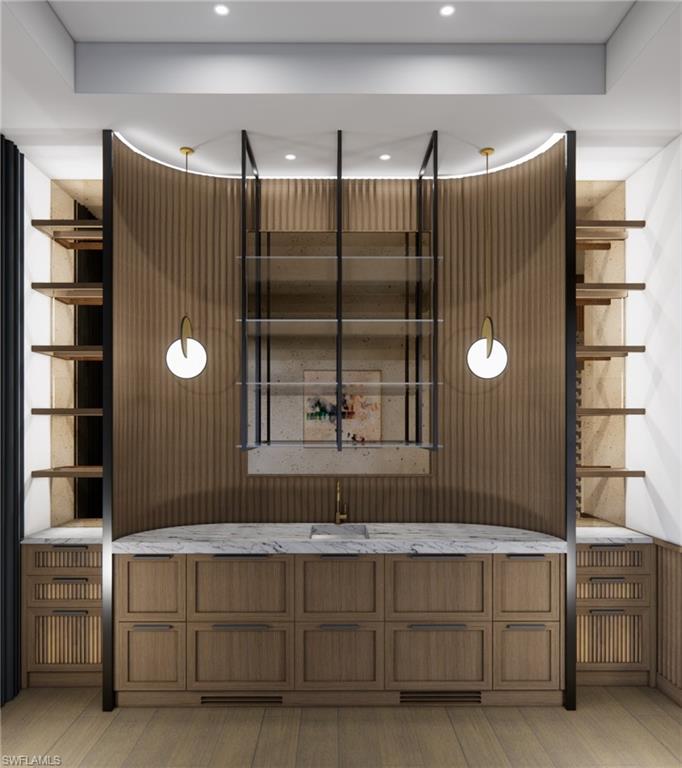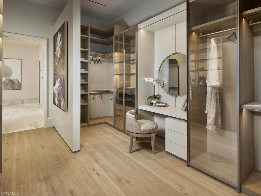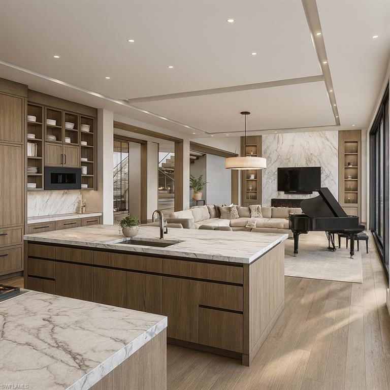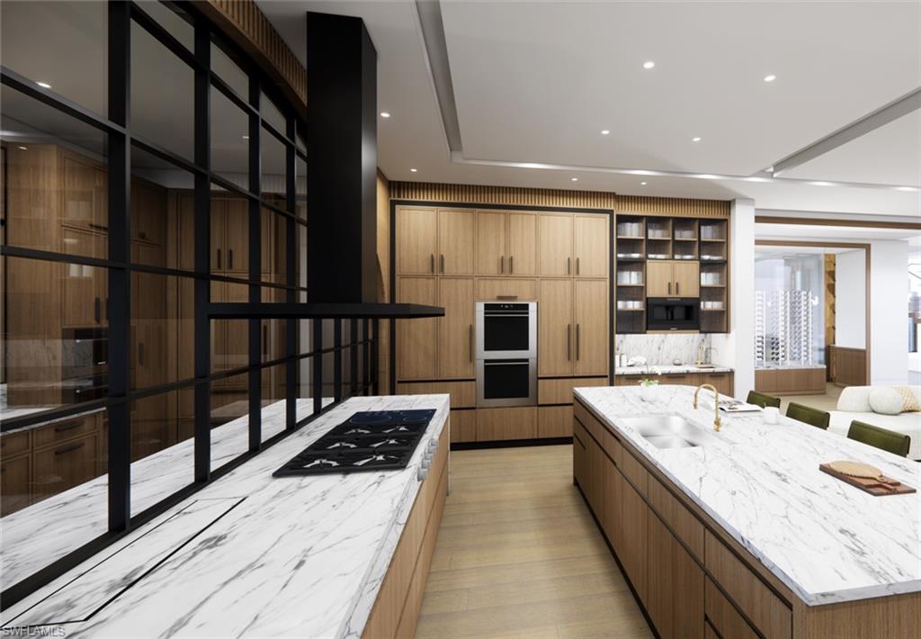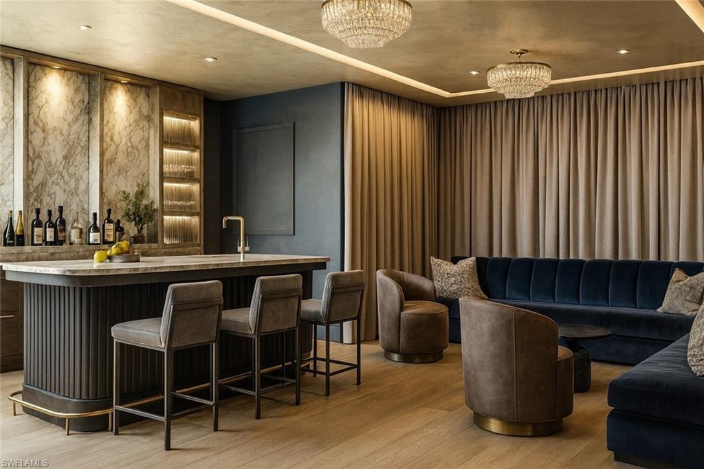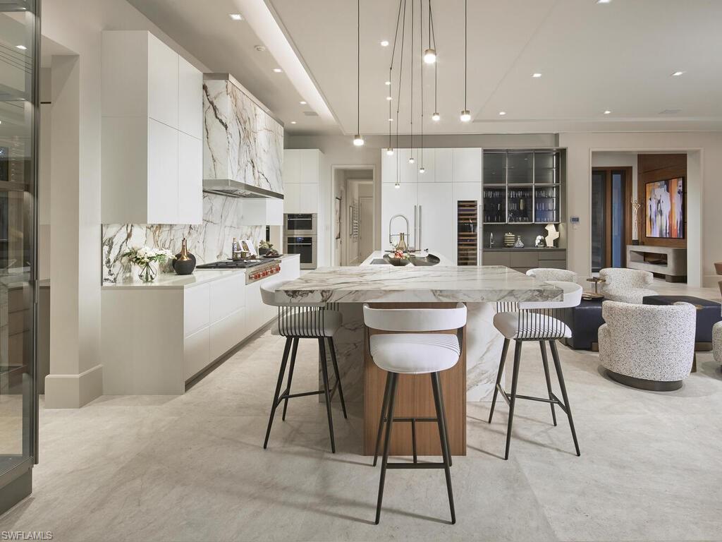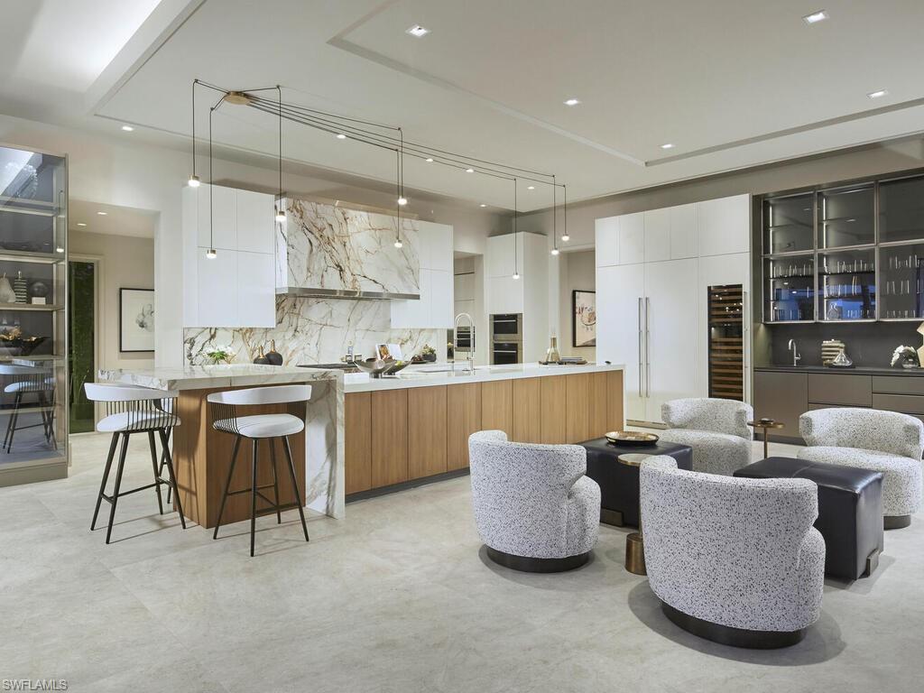 Commanding a rare, western lakefront view in Old Naples, this new construction estate redefines scale, craftsmanship, and architectural clarity. Encompassing over 9,400 square feet of interior living space, the home was conceived as a private resort - where every element supports both the grand and granular aspects of daily living. Twin infinity-edge reflecting pools frame the entrance, opening into a dramatic two-story great room with precision millwork, architectural symmetry, and a sculptural floating staircase. Adjacent, a formal dining room is anchored by a custom, glass-enclosed wine wall integrated into bespoke cabinetry. The kitchen, defined by a curved steel-and-glass partition, includes Wolf/Sub-Zero appliances, dual Miele coffee stations, and a concealed butler’s pantry equipped for large-scale entertaining. Subtle finishes and architectural restraint elevate the overall atmosphere. The first-floor primary suite is entirely self-contained, featuring a private study, two oversized dressing rooms, a discreet laundry center, and a marble-clad bath with indoor/outdoor showers. Upstairs, five additional bedroom suites are complemented by a media lounge and a concealed club room with full bar and humidor. Outdoor architecture is equally refined. A 60-foot negative-edge pool extends across the rear elevation, interrupted by a series of stepping-stones that lead to a sunken firepit lounge surrounded by water. An elevated spa, covered loggia, and summer kitchen complete the space. Above it all, a detached fitness pavilion with breath-taking wide lake vistas, introducing a compelling architectural counterpoint. Additional features include 13x Toto Neorest toilets, three laundry stations, a commercial-grade sheet ironer, full-home generator, elevator, and a five-car split garage designed for collectors. A comprehensive smart home system governs all functions discreetly. Realized by New England based developer EMB Custom Homes, and executed by MHK Architecture, Lotus Construction, and Freestyle Interiors, this fully furnished residence is a singular opportunity in the Naples luxury market. An unrivaled legacy property. Completion is scheduled for October 2025.