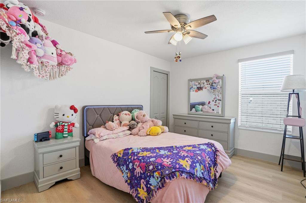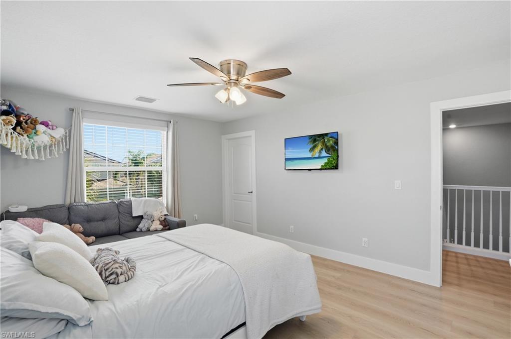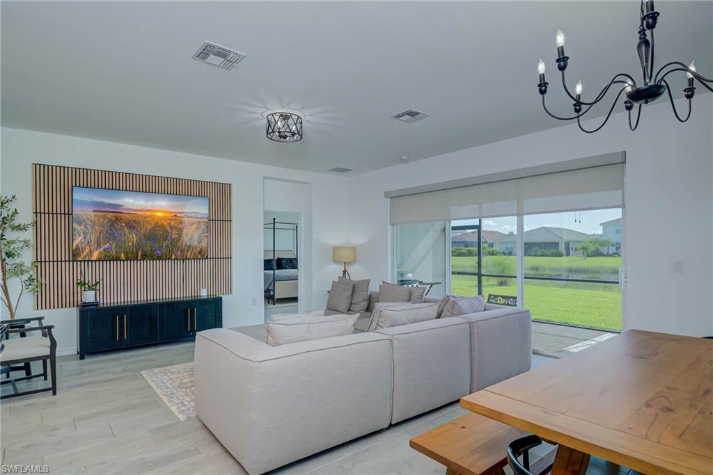 Step into one of the most exciting opportunities in Orange Blossom Ranch. This upgraded Amalfi model is now a true five bedroom plus private den home with one of the largest backyards in the entire community and incredible long lake views with glowing rear sunset exposure. This is the lifestyle people move to Naples for. The moment you walk in, the home feels open, upgraded, and inviting. Upstairs, the loft was fully enclosed to create a spacious fifth bedroom that transforms the flow of the home. The entire upper level was professionally leveled and finished with soundproof underlayment and new waterproof life proof flooring, giving the space a smooth, quiet, modern feel. Downstairs, the private den with its pocket door creates a flexible separate living area that feels like a little retreat. Use it as a media room, office, lounge, or formal dining. The living area itself features a custom TV wall that instantly elevates the space and adds to the modern appeal. Step outside and you instantly notice why this property is so special. The extended driveway gives the home a wide, comfortable arrival experience. The backyard is enormous, offering the kind of outdoor space that lets you truly enjoy Naples weather all year long. The covered lanai is perfect for relaxing in the shade while taking in the peaceful lake views and beautiful sunset sky every evening. Orange Blossom Ranch offers an unmatched lifestyle with multiple resort style pools, fitness center, sports courts, social areas, and wide open spaces. The surrounding area is one of the most rapidly developing corridors in Naples with a brand new Publix, several restaurants, and daily needs retailers coming right outside the community. A private road will connect directly to these new businesses, making it incredibly convenient. Another private road is being built to link Orange Blossom Ranch straight to the regional park, creating even more access to outdoor recreation. If you want a modern upgraded home with five bedrooms plus den, an oversized backyard, sunset views, and a location that is becoming one of the most exciting places to live in Naples, you will not want to miss this one. It is a rare find in one of the most sought after communities in Southwest Florida!