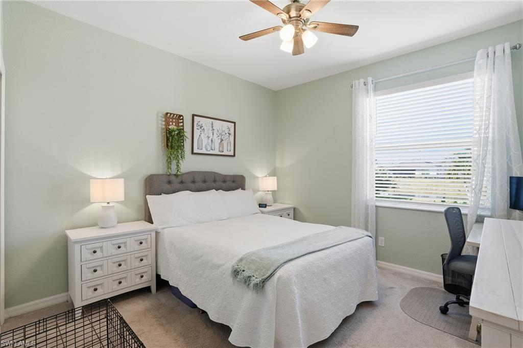 Step into contemporary Florida living at 1996 Parson St Naples, FL, nestled within the sought-after gated community of Orange Blossom Ranch. Built in 2018, this move in ready one-level gem offers approximately 2,186 sq ft of thoughtfully appointed space with 3 bedrooms, a den, and 2 bathrooms. From the moment you arrive, you're greeted by the curb appeal of a modern home with clean lines, a widened driveway and low-maintenance landscaping. Inside, an open-concept layout invites you into a bright living area that flows seamlessly into a kitchen designed for both function and style. The kitchen boasts brand new GE Profile appliances and a custom built solid wood panty, ready for entertaining family and guests. Adjacent to the kitchen, custom built-in cabinets with a desk create an ideal space for work, study, or organization. The master suite includes new flooring and is complete with a generous en-suite bath and walk-in closet. The additional two bedrooms are ideal for family, guests or a dedicated home office, with new flooring and paint throughout. Through the oversized glass sliders, the outdoor living space becomes an extension of your home where you can sip your morning coffee, grill at sunset, or just enjoy the Naples breeze, all while overlooking the lake. The backyard is a tropical retreat featuring banana trees, pineapples, and a fire-pit creating a touch of paradise right at home. This home is equipped with a 6.5KW solar system, offering energy efficiency and cost savings year-round. Beyond the home, Orange Blossom Ranch elevates every day with resort-style amenities: to include sparkling community pools, tennis and pickleball courts, a gym and a welcoming clubhouse that fosters neighborly connection. Located just minutes away: area shopping, dining, top-rated schools, a newly built county park and the Gulf's famed white-sand beaches. Whether you're looking for a full-time residence, seasonal sanctuary, or investment opportunity, 1996 Parson St. is poised to deliver Florida living at its finest.