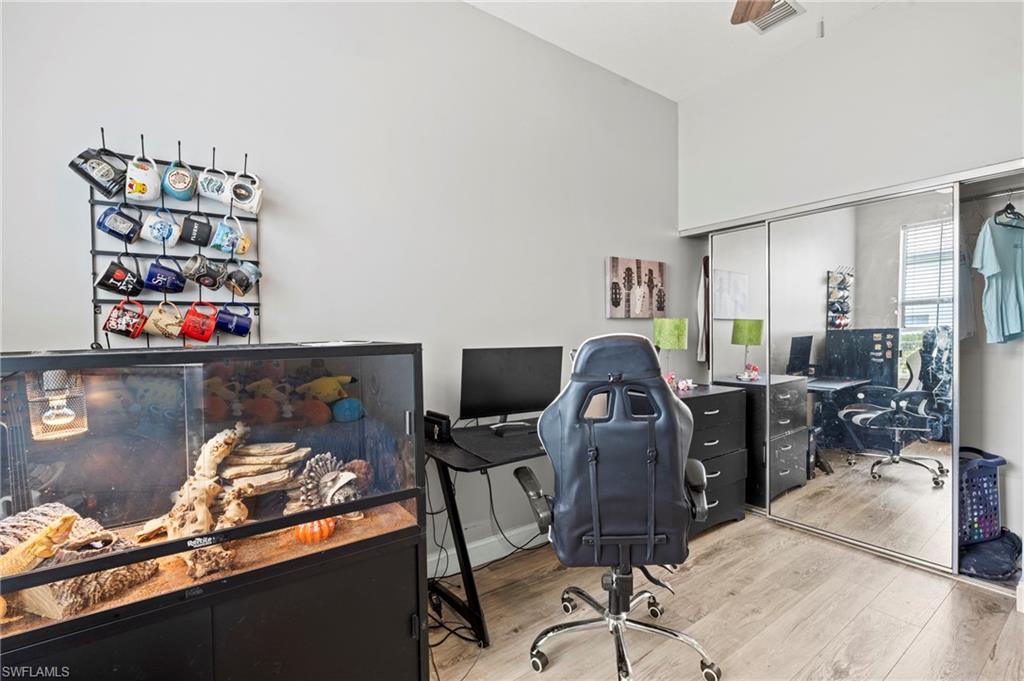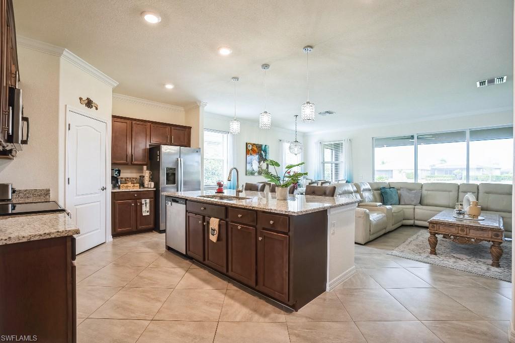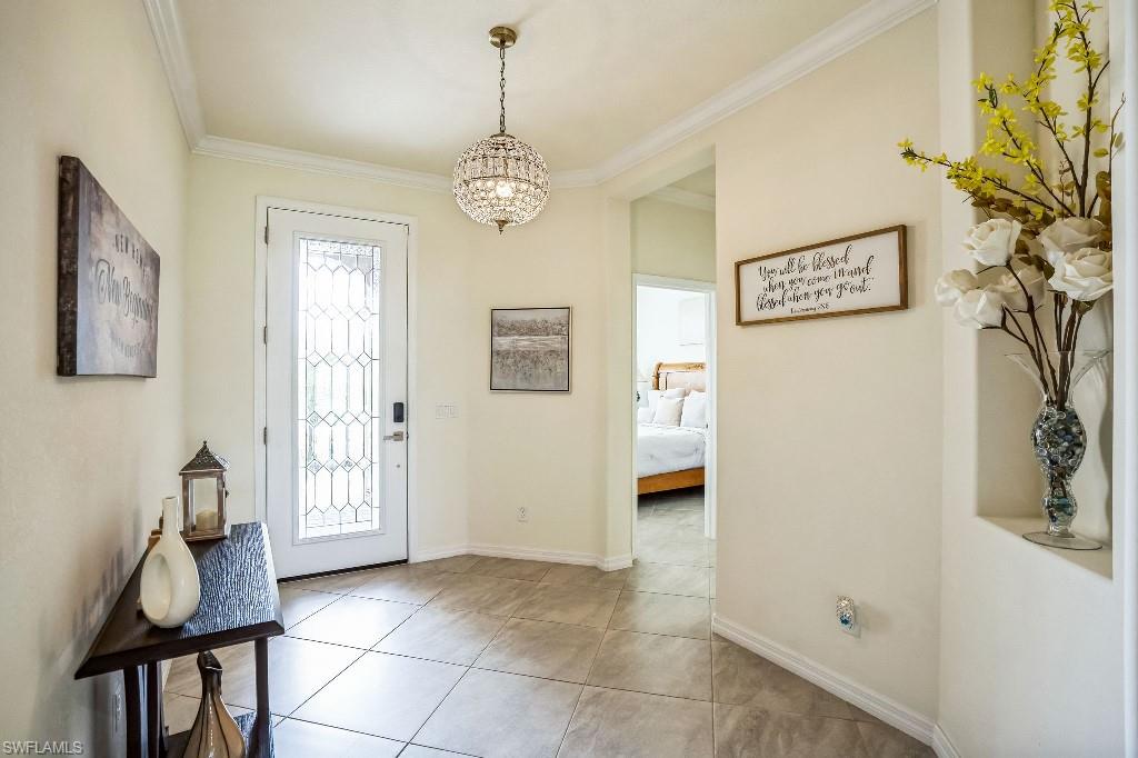 Welcome to Orange Blossom Ranch, a warm community with newer construction, plenty of amenities for an active lifestyle, and a Naples address. This bright and airy 3 bedroom plus den, 3 bath home has it all! From the minute you enter this home you will notice the attention to detail. High ceilings, beautiful lighting choices, crown molding, plantation shutters and a custom-built office space let you see that this home is move in ready! The great room, open to the kitchen, dining area and extended lanai is the perfect place for a gathering of family or friends. The kitchen area, with breakfast bar, pendent lighting, roll out cabinet shelves, quiet Bosch dishwasher, and a walk-in pantry has plenty of counterspace and cabinet space for even the most discerning chef! As it opens to the great room, being in the kitchen doesn't keep you away from the action! A formal dining area in the great room gives you plenty of seating space. The beautiful and functional custom-built cabinetry in the office makes this room perfect of those working from home or just for quiet computer time. The generous primary bedroom, with view of the lake behind the house, has his and hers ample sized walk-in closets, room for a seating area and can be your sanctuary for reading or relaxing. A split bedroom floor plan offers privacy for you and your guests with each bedroom having its own en-suite bathroom. The extended lanai, with picture screen, offers serene sunset and lake views. The two-car garage, with two large overhead storage racks, provides plenty of extra storage room. Orange Blossom Ranch amenities include resort style pools, playground, tennis/pickleball, basketball, and sand volleyball courts. A fully equipped Fitness Center and Clubhouse provide multiple places for your enjoyment and community activities! The community has easy access to Naples, fining dining, shopping and is a short distance to I75 with easy access to RSW airport. Brank-New Publix just outside of the gate, New Aldi, ACE Hardware, Gas Station and Car Wash in just a few minutes' drive.