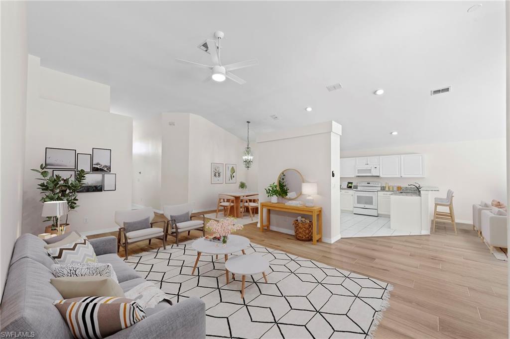An open-concept great room with vaulted ceilings enhances the spacious and inviting ambiance of this home. Designed for entertaining, the reimagined floor plan features an elevated chef’s kitchen with top-of-the-line appliances, sleek quartz countertops, an 8-foot statement island, double-wall ovens and marble backsplash. A formal dining area and welcoming foyer flow seamlessly for effortless gatherings. Luxury vinyl plank flooring, new recessed lighting and modern fixtures elevate the interiors. A family room off the kitchen offers an additional retreat, with both spaces opening to a private outdoor oasis. The saltwater pool, therapy bench, shaded lounge and dining area create a resort-style setting. The oversized primary suite includes a remodeled en-suite bath with a glass-walled shower, soaking tub and dual vanities, plus lanai access and a flex space for work or hobbies. Three guest rooms and two baths ensure privacy and comfort. Additional highlights include a full-size laundry room and an epoxy-finished two-car garage. In The Orchards, a gated community with premier amenities, this residence is minutes from Mercato, top-rated schools and pristine beaches. Updates include a new roof (2019), new water-heater and whole-house water filtration (2024), upgraded electric panel for EV charging (2024) and more.