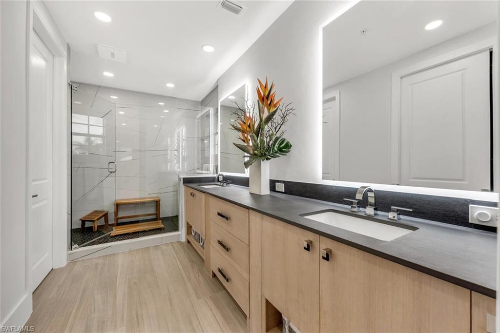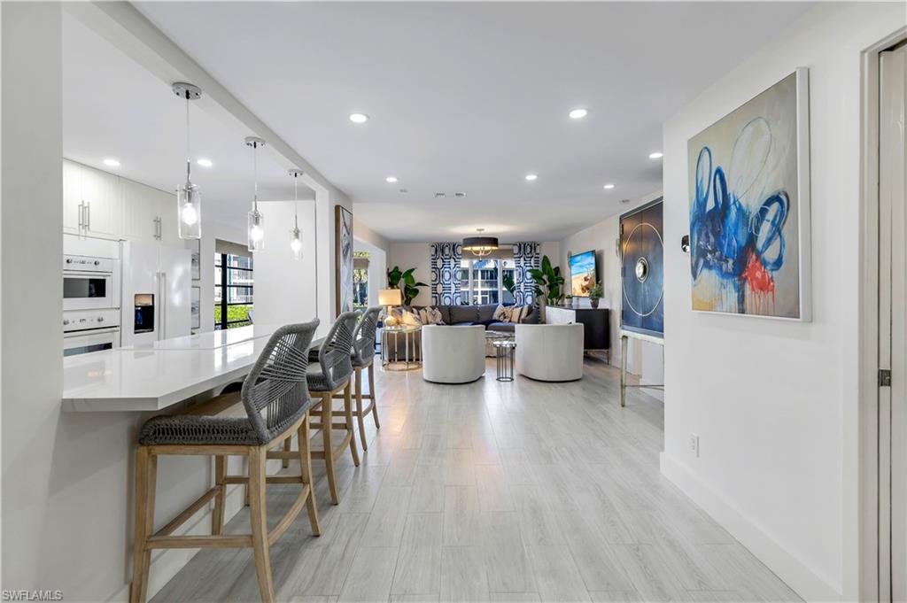 COMPLETELY RENOVATED 2/2, end unit condo with beautiful views located in Oyster Bay!!!! Boat Slips available for lease from the community for only $300.00 per year!!!!! Brand New Seawall, Dock and Roof installed in 2025!!! You can walk to Olde Naples or enjoy time out on the dock. Extremely peaceful! Low density! The newly added and updated Florida room with new windows under air allows you to enjoy breakfast/lunch or dinner overlooking the pool and canal. Blue Point allows up to 12 rentals a year with a minimum 30 day lease, providing flexibility for personal use, investment or both!! Over 53k in rental income in 2023!! Renovations include but not limited to - ALL NEW - gourmet appliances, washer/dryer, wine cooler, stand alone icemaker, under cabinet lighting, quartz countertops, fixtures/hardware throughout, doors interior & exterior, light Oak hardwood flooring throughout, bathroom vanity's, tile, toilets, custom shower doors, Samsung tv's, Sonos system, Nest thermostat, Ring doorbell, recessed LED can lighting, ceiling fans, all furniture! 100% TURNKEY!!! Don't miss out on this opportunity to buy in Royal Harbor/Oyster Bay before completion of Metropolitan Naples on the corner of 41 and Davis Blvd!!!