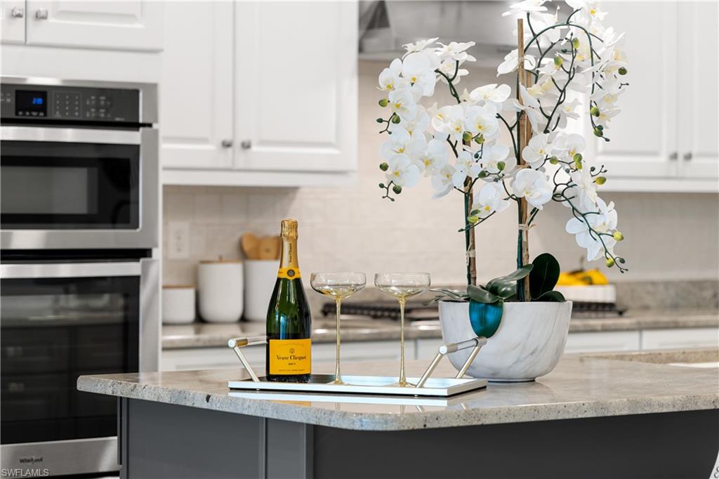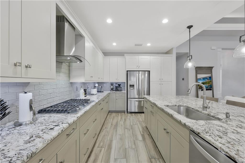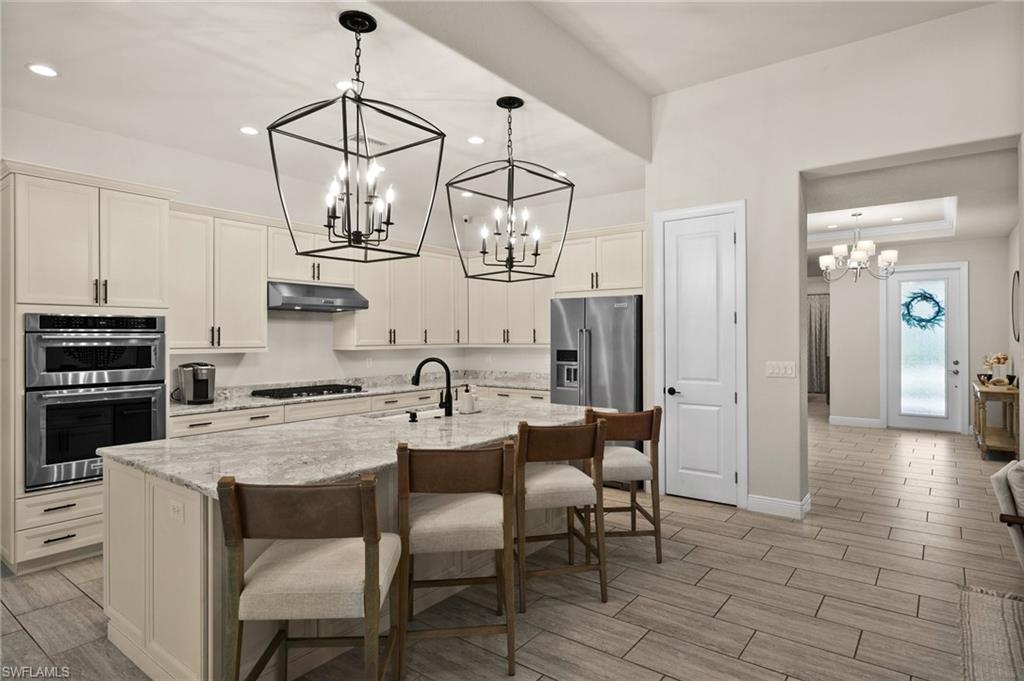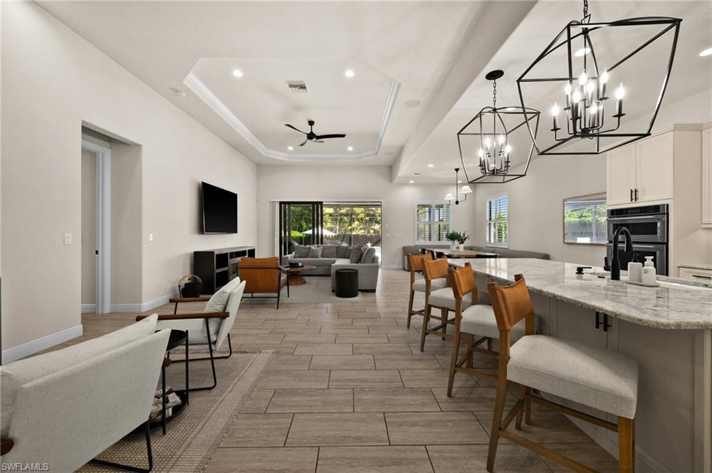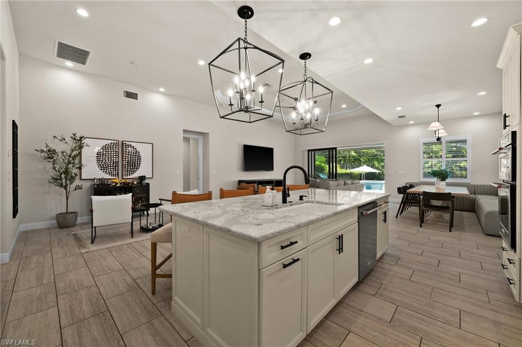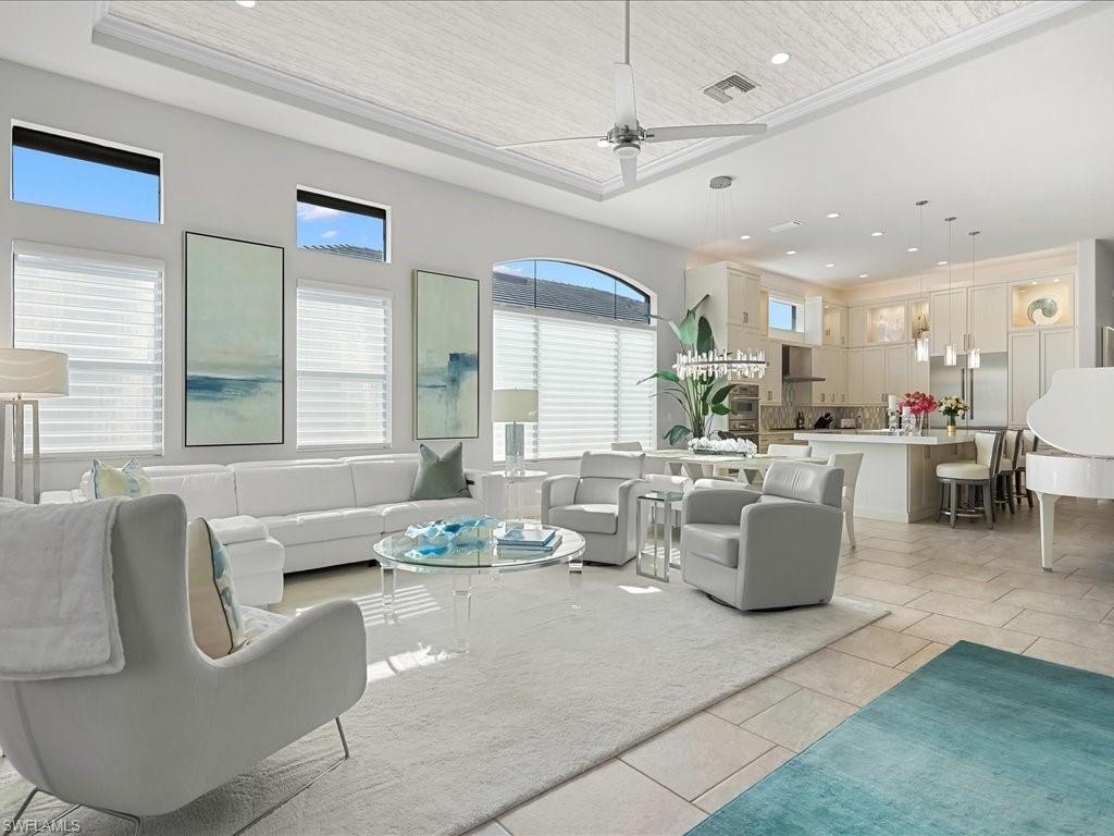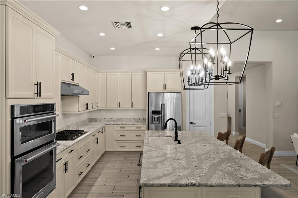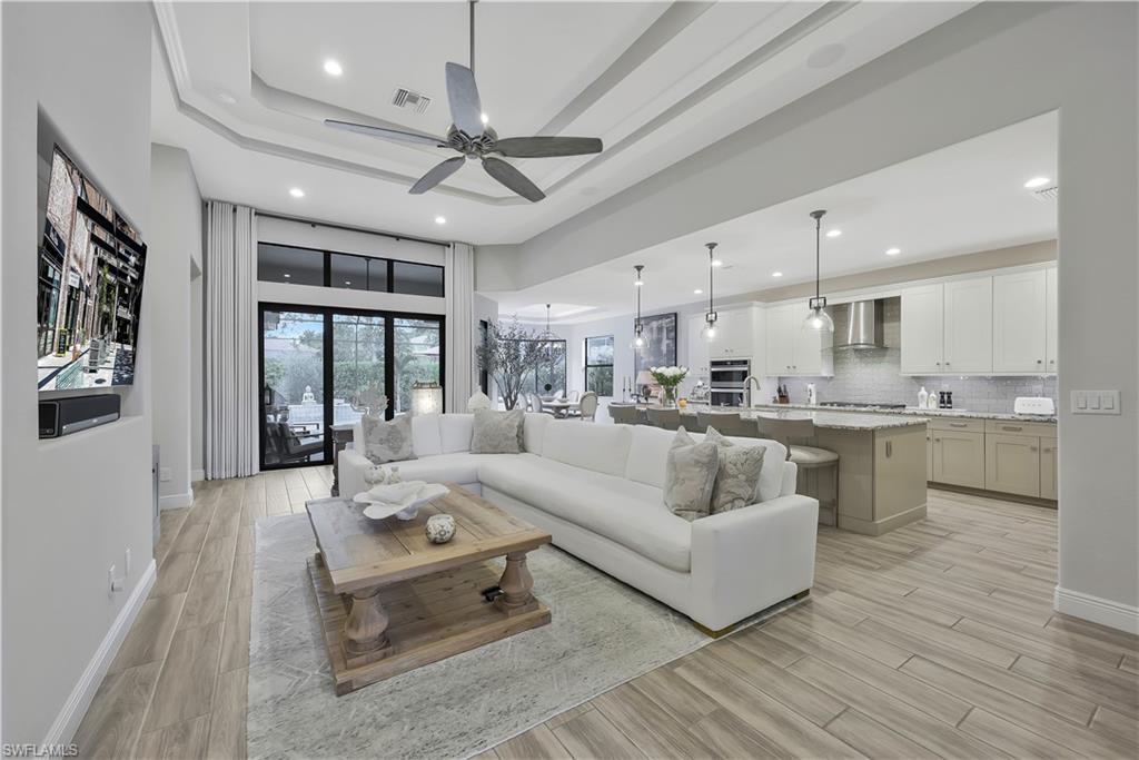Opportunity awaits at 10046 Florence Circle, where sophistication meets comfort in the coveted gated community of Palazzo. This exquisite El Paso floor plan offers nearly 2,600 square feet of luxurious living, a rare 3-car garage, and sits proudly on an oversized lot—delivering the space and features discerning buyers’ demand. From the moment you enter, the attention to detail is unmistakable. Custom light fixtures, crown molding, designer wall coverings, and remote-control Hunter Douglas shades set a tone of understated elegance. At the heart of the home, the expansive great room flows effortlessly into the brand-new chef’s kitchen, showcasing 42” cabinetry, gleaming quartz countertops, Thermador appliances, and thoughtfully curated finishes. Every element has been professionally designed and executed to perfection. The primary suite serves as a private sanctuary, featuring dual vanities, custom walk-in closets, and an oversized shower that elevates the spa-like ambiance. Each secondary bedroom and bath have been designed with equal care, ensuring both comfort and style. Outdoors, the screened lanai invites year-round enjoyment, overlooking a custom saltwater pool with a tranquil water feature—perfect for unwinding or entertaining. Palazzo residents enjoy low HOA fees, natural gas, and no CDD costs, with optional golf, tennis, and social memberships nearby. Ideally located close to shopping, dining, and the pristine Gulf beaches, this property combines convenience, community, and craftsmanship. Come experience the elegance of 10046 Florence Circle—a home where every detail has been carefully considered and every comfort thoughtfully provided.