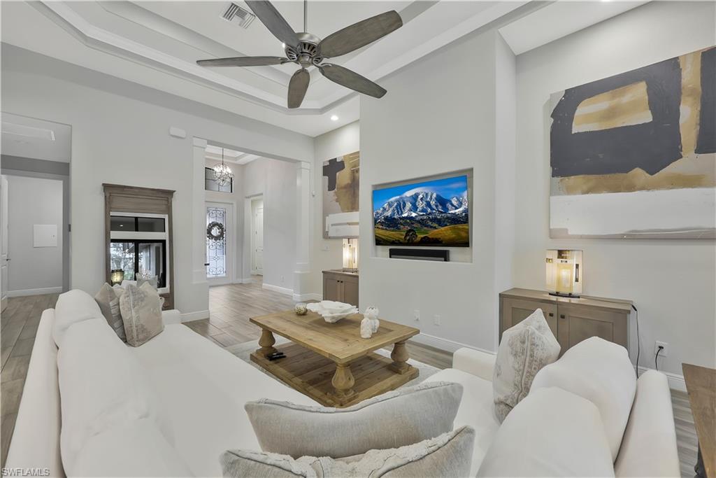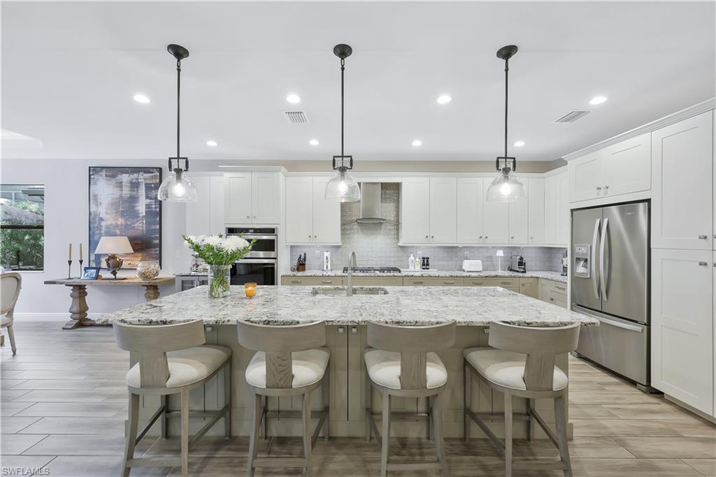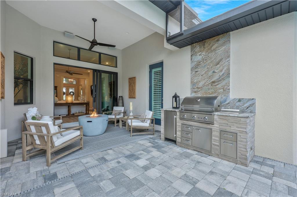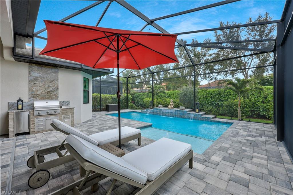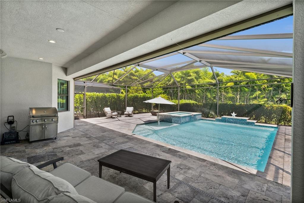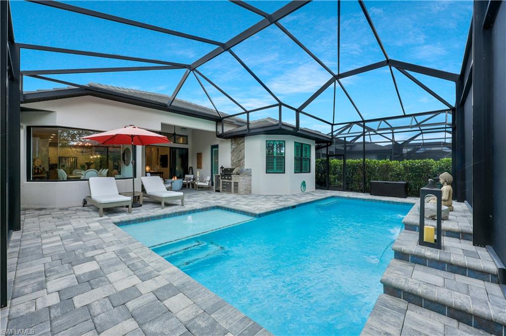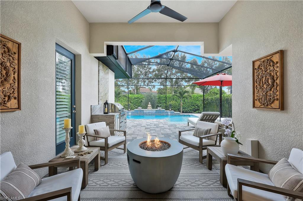 Tucked inside one of Naples’ most exclusive enclaves, this distinguished residence stands out as one of the most extensively upgraded homes ever available in Palazzo at Naples. The beautifully customized Toll Brothers property, built in 2018, welcomes you with impeccable curb appeal, top of the line finishes and fixtures, and impact glass doors and windows. The open concept Serino floorplan features exceptionally high ceilings, a columned entry, and a natural flow between indoor and outdoor living. The private lanai setting is an absolute dream with a saltwater pool, calming water features, an outdoor kitchen fit for a grill master, and covered lanai space complemented by a one of a kind firepit. Palazzo is one of the few communities in the area with natural gas, which fuels this home’s full house Generac generator, an invaluable feature for year round peace of mind. Style and luxury combine to make the perfect owner’s suite complete with dual walk in closets, built ins, floor to ceiling shower tile, gorgeous coffered ceiling work, and upgraded lighting accents. Even more enhancements include (1) a brand new A/C system installed in August 2025, (2) a new 2024 gas pool heater, (3) custom built interior plantation shutters, (4) Delta Heat outdoor appliances, (5) a Sonos indoor/outdoor speaker system, and (6) a new super sized washer and dryer. With no CDD and low HOA fees that cover all landscaping and common area maintenance, this stunning home provides both convenience and accessibility to beaches, shopping, dining, I-75, and top clubs Quail Creek Country Club, Quail Village Golf Club, and the Longshore Lake Club.