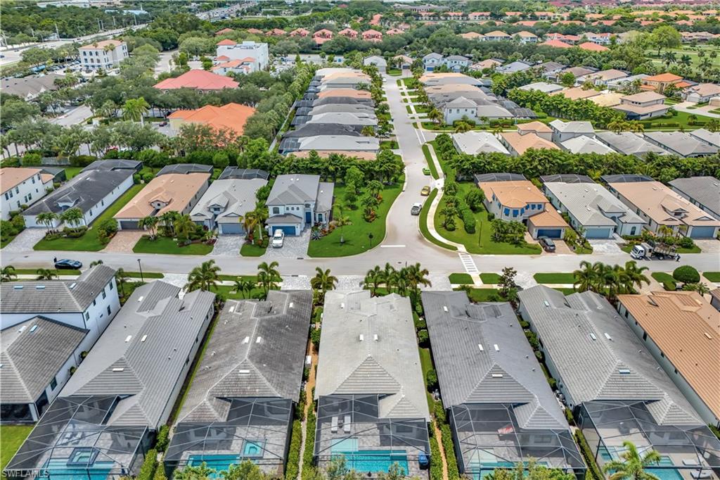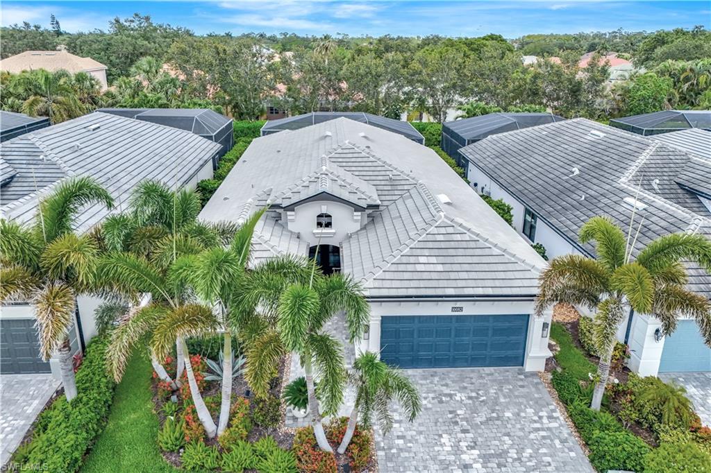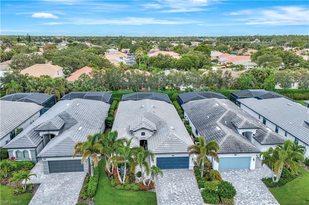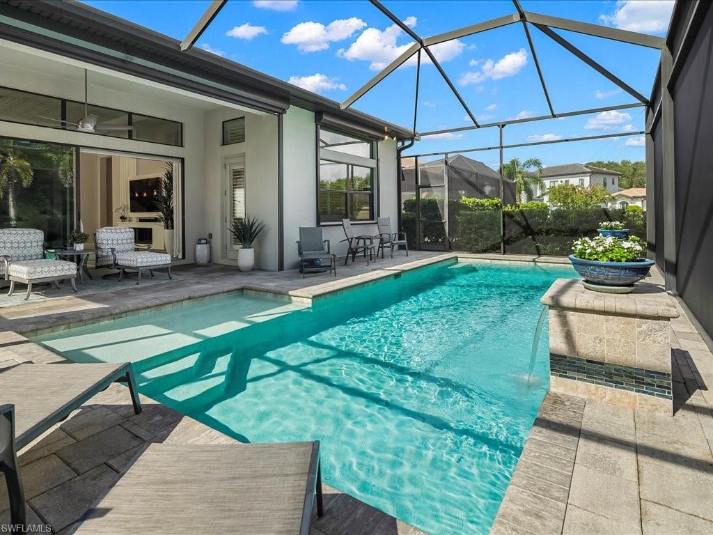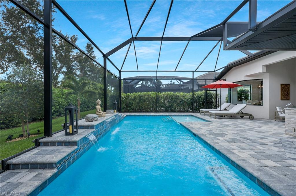 Tucked behind privacy hedges on a desirable corner lot, this residence in Palazzo at Naples boasts the largest lot with a rare rear yard. This beautifully appointed furnished 4 bed 4 bath plus loft home provides an exceptional blend of elegance, comfort, and indoor-outdoor living. Be sure to click on the lifestyle video! The extended screened lanai is a private paradise, showcasing a sparkling pool with a waterfall feature, spa, built-in gas fire pit, and multiple covered and open-air lounging and dining areas—ideal for sunset cocktails or starlit dinners. Inside, Sonos sound system surrounds you, the timeless tile floors flow throughout the open-concept layout. The soaring two-story design includes a great room that seamlessly connects to the gourmet kitchen, complete with a gas range, sprawling island, chic pendant lighting, and a walk-in pantry. Upstairs, a versatile loft/family room convertible to 5th bedroom accompanies a 4th guest bedroom and 4th full bath, while two additional guest bedrooms are downstairs, each of which enjoys its own bath. The spacious primary suite offers serenity and seclusion, featuring two walk-in closets and an ensuite bath with dual vanities, a soaking tub, and a separate glass-enclosed shower for a spa-like retreat. Designed with versatility in mind, this home provides ample space for work, relaxation, and entertainment and a home generator. Located in the gated enclave of Palazzo at Naples, residents enjoy proximity to white sand Gulf beaches, upscale shopping and dining at Mercato, world-class golf, and Southwest Florida International Airport. With only 85 architecturally distinctive homes, Palazzo is a tranquil, low-maintenance community that defines upscale Naples living. Memberships to nearby country clubs are available & not mandatory, making Palazzo a great choice.