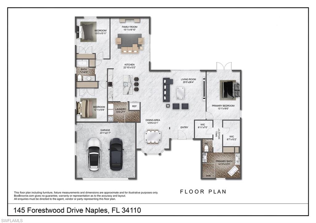 Comfort and convenience are both realized in this spacious residence, tucked away in the established, friendly, HOA-free neighborhood of Palm River Estates. The expansive 14,374 square foot cul-de-sac lot features a well for irrigation and a private setting on the La Playa Golf Course. Inside, you'll find a beautifully maintained interior with a new 2022 roof, recently replaced AC, and fresh paint. The open floor plan provides four large bedrooms, three full baths (one guest bedroom provides en-suite), a large laundry room, and a screened lanai with a private heated pool. The home spans an impressive 2,682 square feet and has two living rooms providing ample space for entertaining, making it perfect for a variety of lifestyles and growing families. Easy access to Naples’ renowned beaches, medical care, Seed to Table market, parks, and Mercato for world-class entertainment come free with this location. With top-rated schools nearby, this home is ideal for families seeking a vibrant and welcoming community.