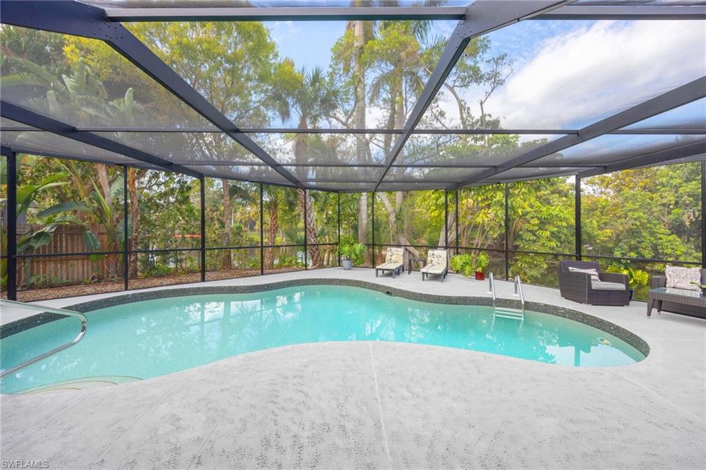 Move-in ready single-family, furnished pool home in the highly desirable Palm River community of North Naples! This single-story residence sits on a private, tree-lined .23-acre lot, offering a rare combination of privacy, tranquility, and room for expansion. The open-concept floor plan includes 3 bedrooms, 2 bathrooms, and a spacious 2-car garage with new epoxy flooring and extra storage. Inside, the updated kitchen features a waterfall island, modern cabinetry, and stainless steel appliances, flowing seamlessly into the living, dining, and great room. The primary suite offers a spa-style bathroom with a rain shower and custom jets, plus a large walk-in closet. Step outside to enjoy true Florida living on the screened lanai with a heated pool—perfect for year-round relaxation and entertaining. Recent updates include interior paint throughout, new window treatments, new landscaping, updated irrigation, and newer pool equipment. Offered fully furnished, this home is ideal for personal use or as a prime North Naples rental opportunity. With low HOA fees, coveted X flood zone (no flood insurance required), and just minutes to Vanderbilt Beach, Wiggins Pass, dining, shopping, and medical care—this Palm River pool home is hard to resist.