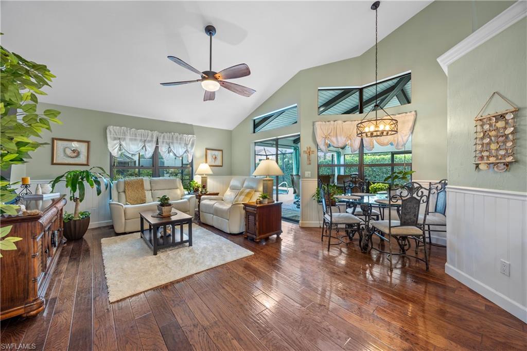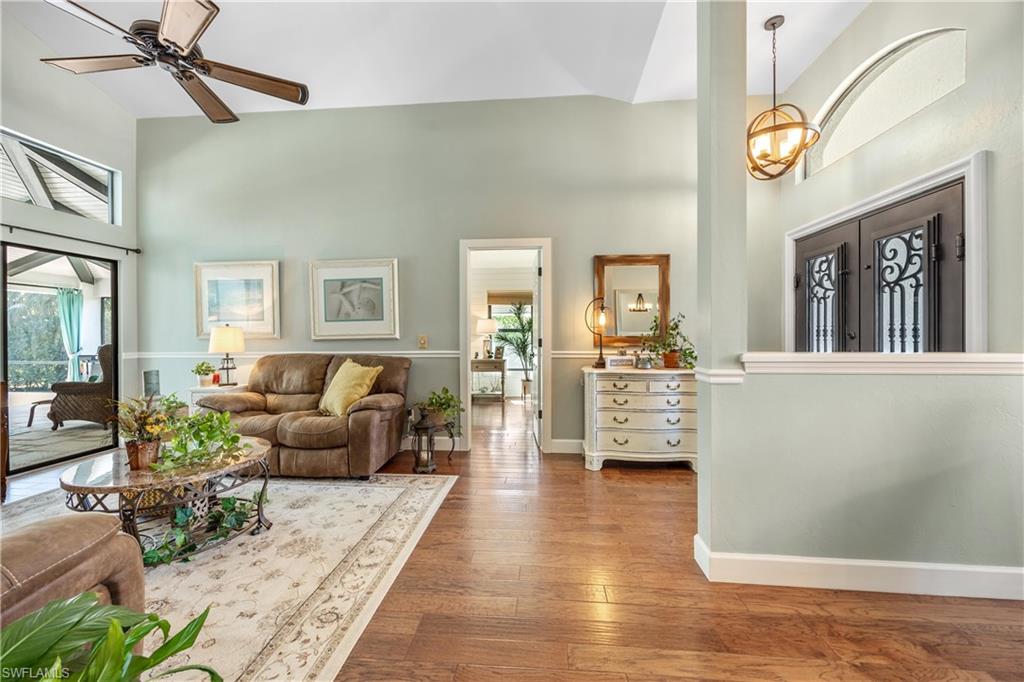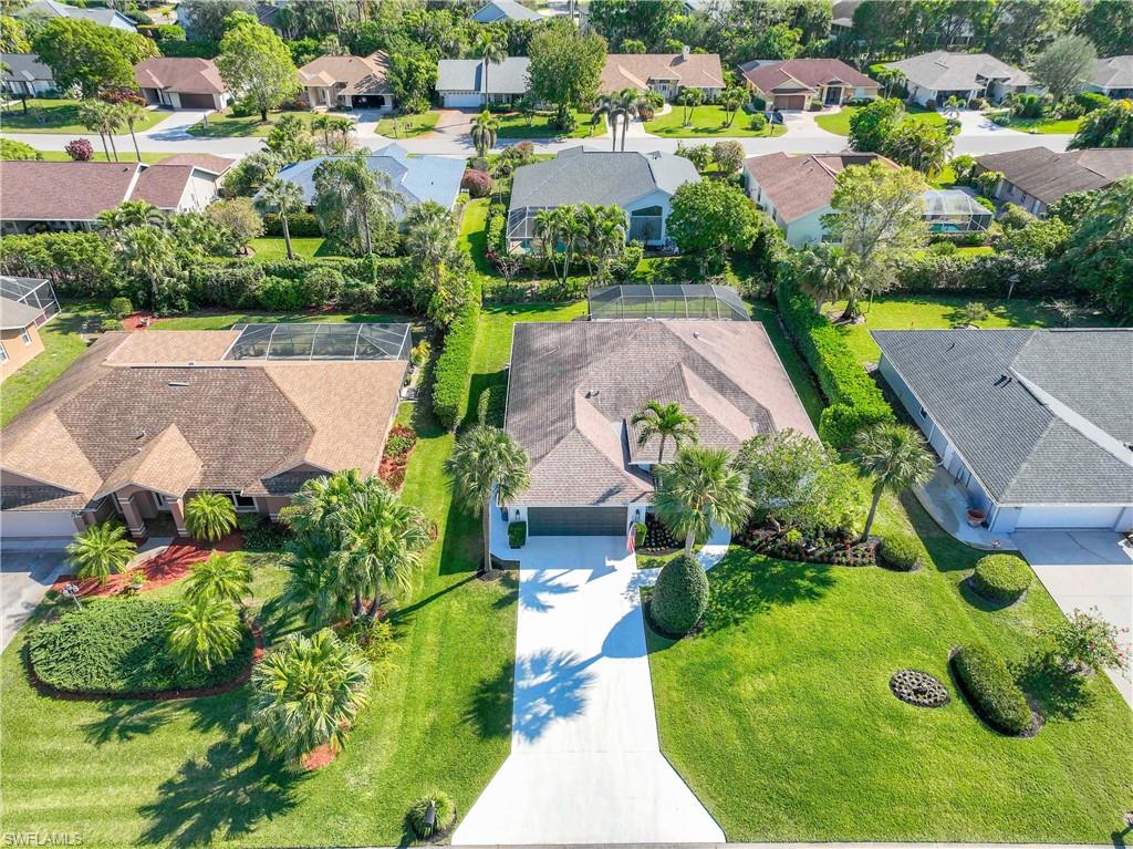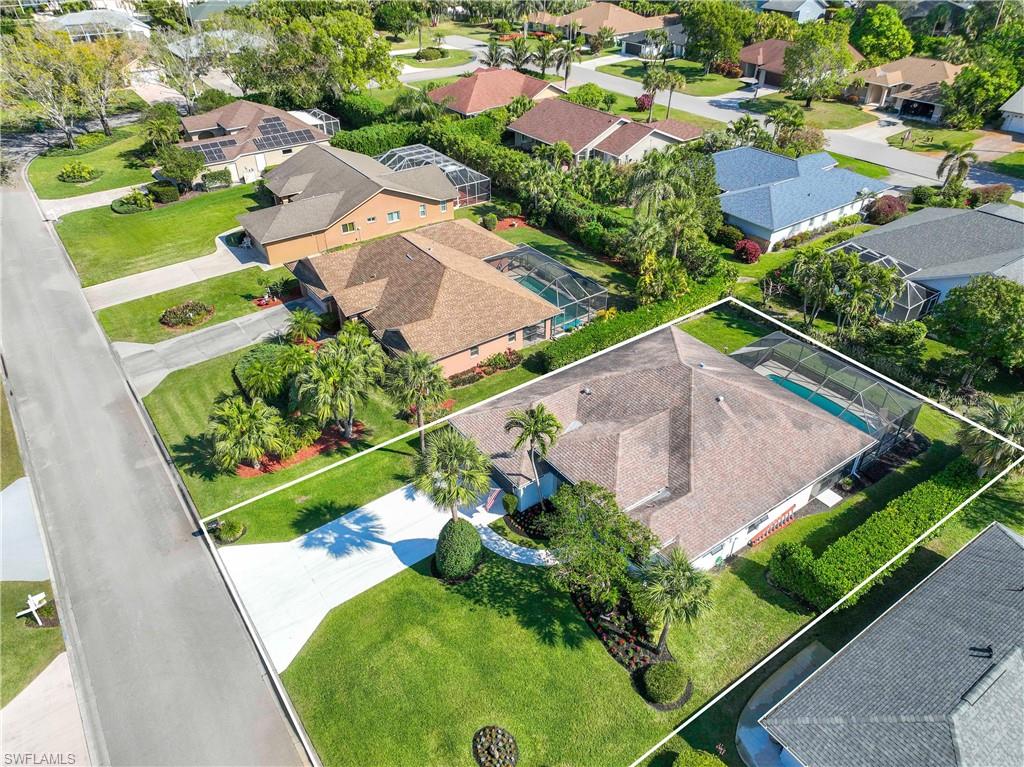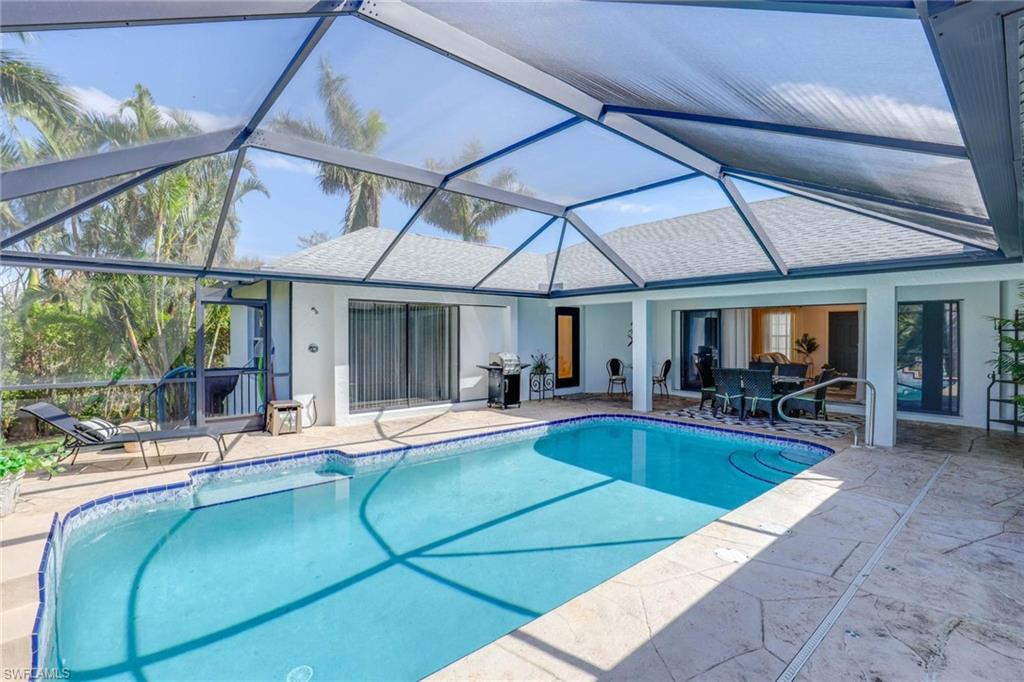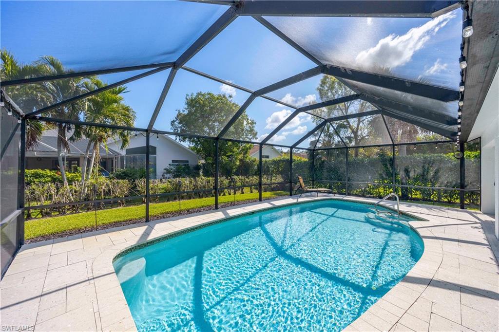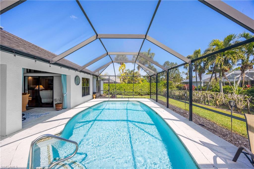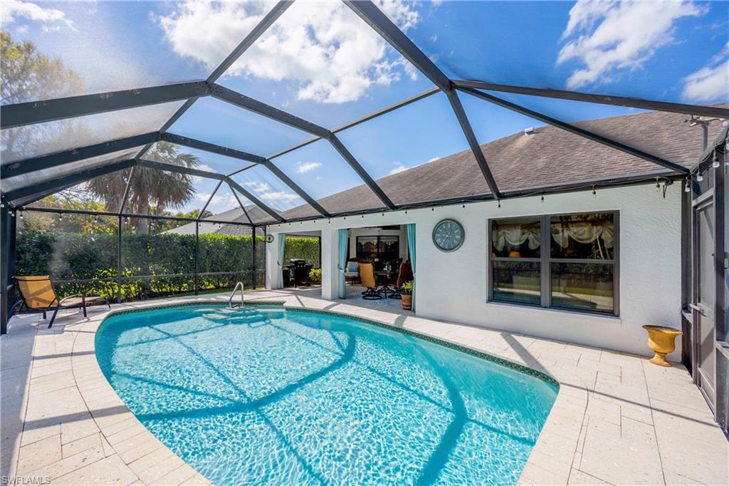 Discover this spacious four-bedroom-plus-den, three-bath single-family home offering 2,614 square feet of living space, one of the larger homes and lots in the community with .49 acres! The thoughtfully designed split floor plan provides privacy and flexibility for everyday living and entertaining. Recent updates include a new roof (2025) and a beautifully appointed travertine-tiled screened lanai with a sparkling pool featuring a sun-shelf and soothing water feature. The lushly landscaped yard is maintained with a well-fed irrigation system, adding efficiency and cost savings. On a quiet street in desirable North Naples, this property combines space, comfort and prime location. Close to shopping, dining and top-rated schools. A rare find offering exceptional value and lifestyle!