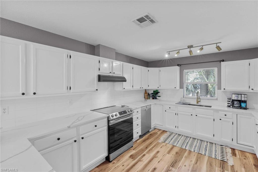 Welcome to your dream oasis in the heart of North Naples! This exquisitely renovated 3-bedroom, 2-bathroom ranch-style home in the sought- after Quail Crossing community seamlessly blends luxury, comfort, and modern sophistication. From the moment you arrive, lush tropical landscaping and a custom wrought iron double front door invite you into a world of refined elegance. Inside, hand-scraped wood floors flow throughout the open floor plan, leading to wraparound sliders and windows that bathe the space in natural light and offer serene views of the newly resurfaced and re-tiled pool. The expansive covered lanai, featuring brand-new pavers and a striking shiplap ceiling, creates the perfect outdoor retreat for relaxation and entertaining. The designer kitchen is a chef’s dream, boasting stainless steel appliances, under-cabinet and toe-kick lighting, and luxurious leather-washed granite countertops. Both bathrooms have been meticulously updated with high-end finishes, adding to the home's sophisticated charm. Additional upgrades include spray foam insulation in the house and garage attic, a newer multi- speed 4-ton AC unit, a NEST smart thermostat, and PEX plumbing. Every detail has been thoughtfully considered—from crown molding throughout to multi-colored accent lighting, beadboard wainscoting in the family room, and even a serene butterfly garden. Situated on a 0.23- acre lot, this 1,855 sq ft home offers a tranquil lifestyle with low HOA fees and proximity to Naples' pristine beaches, top-rated schools, and vibrant dining and shopping destinations.
