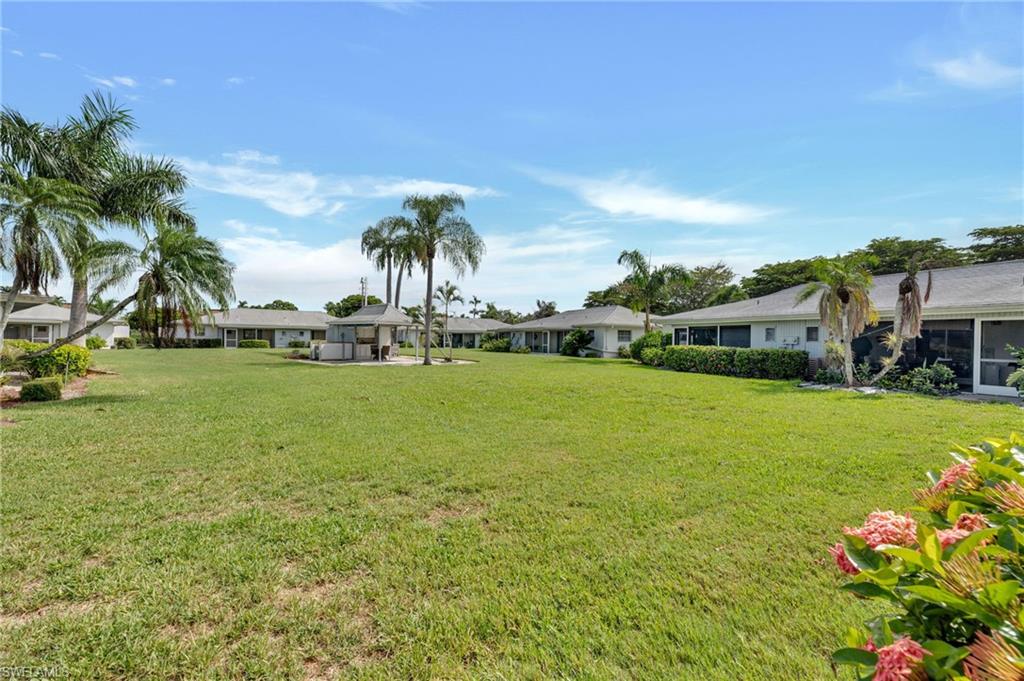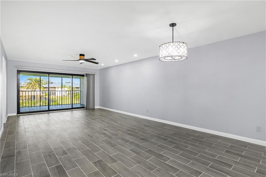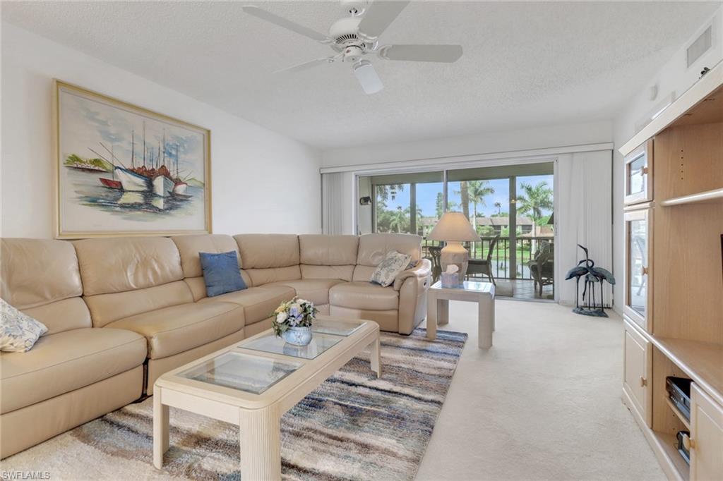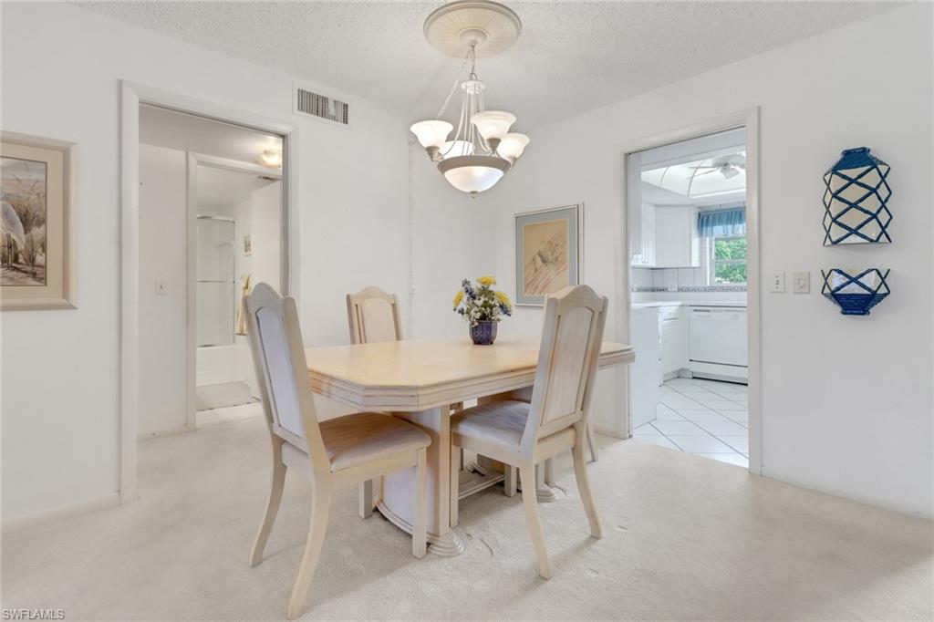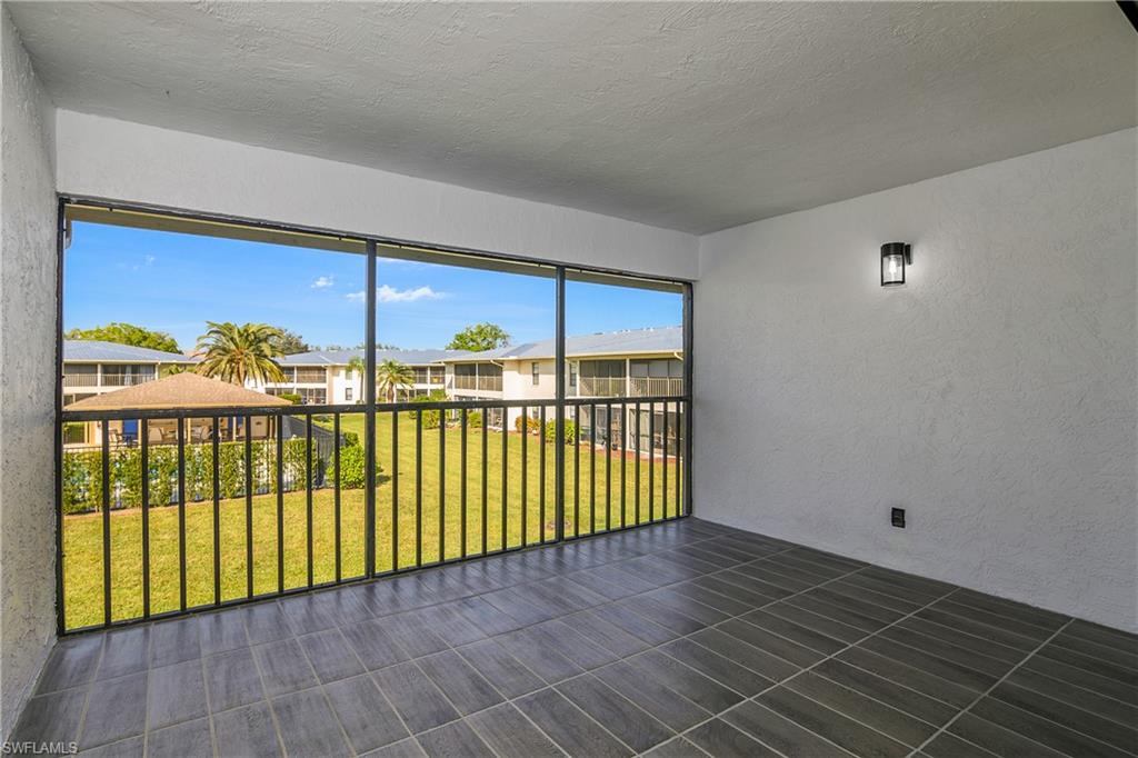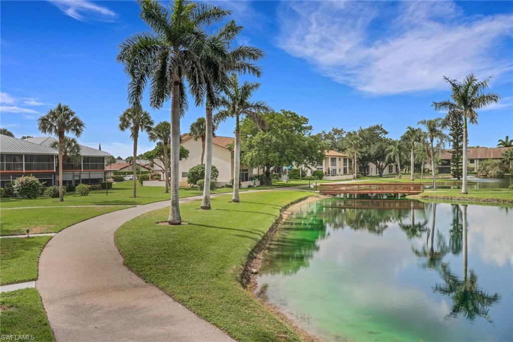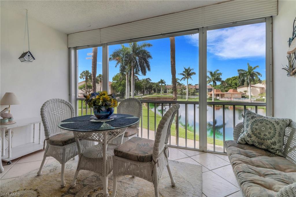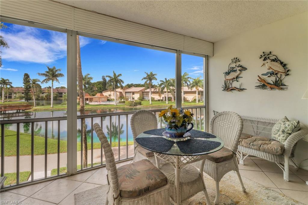 Bright and inviting condo in Palm River, a 55+ North Naples Community! Discover your perfect Florida lifestyle home in this sunny first-floor 2-bedroom + den, 2-bathroom condo that offers a welcoming and spacious layout and is beautifully updated to combine modern comfort with timeless style. Step inside to find luxury vinyl flooring, an expansive kitchen with newer appliances, abundant cabinetry, and a generously sized ensuite primary bedroom featuring a walk-in closet. This spacious condo is move-in ready and includes beautiful, newer designer furniture for a seamless transition into to your new lifestyle. Enjoy hosting or relaxing by the wet bar that extends your living space ending with a sliding glass wall that opens to breathtaking lake and fountain views. With generous indoor and outdoor storage, this home offers convenience at every turn. The active and friendly community is designed for a vibrant lifestyle. Residents enjoy a large community pool, bocce ball, shuffleboard courts, and an outdoor grilling area. New roof in 2024, adding to the value and appeal of this community. Ideally located, Courtwood provides easy access to I-75, Mercato for shopping and dining, Trader Joe’s, Whole Foods, top-rated local hospitals, and is less than 5 miles from the Gulf of Mexico’s beautiful beaches. This property also features a covered carport and is situated in a no-flood zone, ensuring peace of mind.