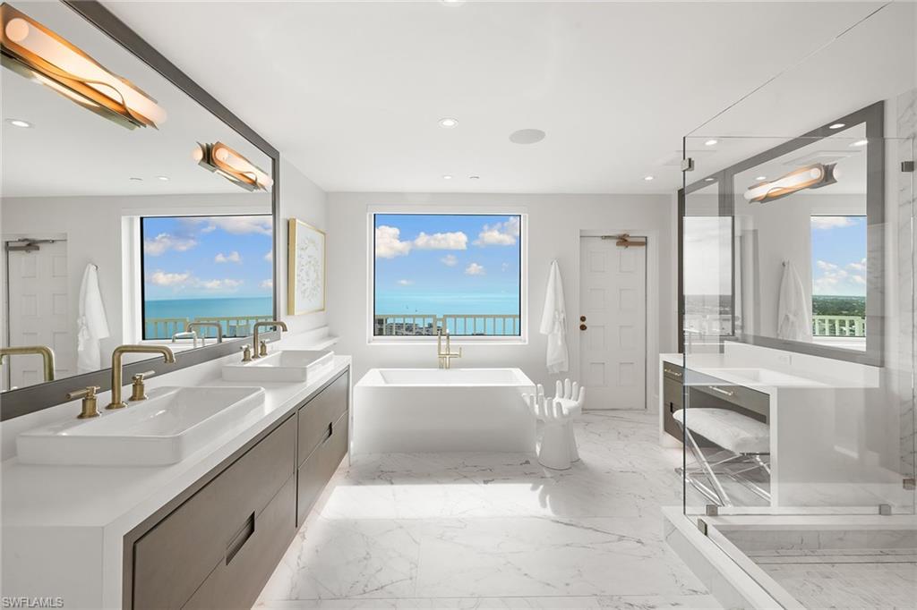 Discover the ultimate luxury lifestyle in this stunning 270-degree panoramic view penthouse with a private rooftop deck. A winner of the prestigious 2024 Sand Dollar Award, this exceptional unit is complete and ready to enjoy. Meticulously renovated to showcase exquisite finishes and unparalleled craftsmanship from Beck Architectural Group, Parker Hudson Homes and Freestyle Interiors, this residence offers a seamless blend of sophistication and comfort. The expansive open concept layout is drenched in natural light, thanks to floor-to-ceiling windows that frame breathtaking panoramic water views. A standout feature is the private rooftop deck, an entertainer's paradise, complete with a spa, outdoor kitchen, stylish bar and lounge seating, all overlooking the gulf, bay and skyline. Offered fully furnished, this one-of-a-kind residence also includes three under-building parking spaces. At the newly renovated Le Ciel Venetian Tower, enjoy resort-style amenities, including a modern luxurious lobby, direct beach access, a stunning pool, spa, fitness center, club room, guest suites, 24-hour security and a resident manager. Just minutes from the vibrant shops and dining of Venetian Village and downtown Naples, this penthouse offers not just a home, but a lifestyle. Don’t miss your chance to make it yours!