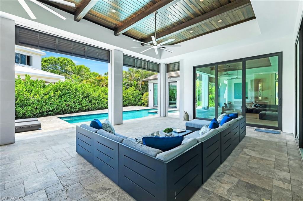 Situated in the heart of prestigious Park Shore on a quiet cul-de-sac street, this residence was beautifully remodeled and refreshed in 2018 by esteemed custom builder A. Vernon Allen Builder, Inc, with an elegant redesign by Herscoe Hajjar Architects, LLC. The result is an impressive, thoughtfully arranged floor plan that blends quality craftsmanship with the relaxed sophistication of coastal living. Designed for both comfortable daily living and effortless entertaining, the home features 4 bedrooms, a playroom, and an office. A spacious, light-filled great room flows seamlessly into a stunning and well-equipped kitchen appointed with a large center island, Wolf and Sub-Zero appliances, and an expansive butler’s pantry/prep kitchen. The large covered outdoor living area is conveniently accessed either from the great room or from an intimate sitting room also adjacent to the kitchen— a charming, relaxed sitting area ideal for quiet moments, watching television, light reading, or seamlessly moving between the kitchen and the outdoor living spaces. Extraordinary for the Park Shore neighborhood, the property offers an incredibly large backyard—an inviting private oasis boasting a resort-style pool, generous pool deck, fire pit, outdoor kitchen, and a charming trellis-covered dining area, all framed by lush, beautifully designed landscaping. Additional modern comforts include retractable screens and shutters, a 24KW generator, security cameras, and more. This property is eligible for membership to the Park Shore Association Beach Park.