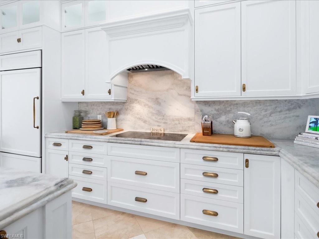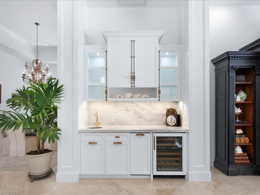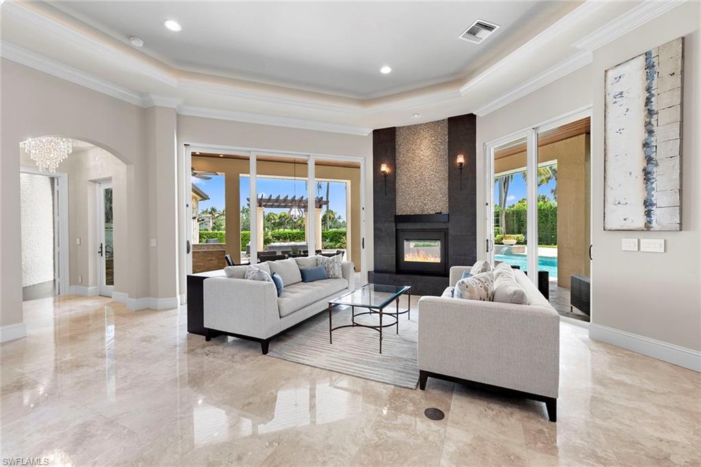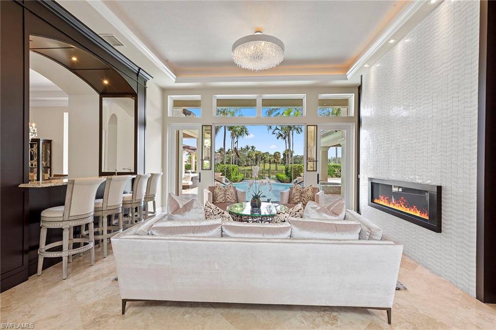 This exquisite, fully furnished home blends timeless sophistication with everyday comfort. From the moment you step inside, you’ll be greeted by soaring ceilings, custom details, and an inviting open flow. The living room features a beautiful stone fireplace and a sleek wet bar—perfect for entertaining. A 500+ bottle, temperature-controlled wine room elevates every gathering. The gourmet kitchen features a classic stone backsplash, a designer hood, and ample storage. Two ensuite guest rooms and a private owner’s suite provide space and serenity. The main suite includes a luxurious bath, vanity, dressing area, and three closets. Outside, the expansive lakefront lanai sets the stage for relaxed living, complete with multiple seating and dining areas, a fireplace, a summer kitchen, and a sparkling pool and spa framed by peaceful fountains. Immaculate, elegant, and move-in ready—this home is an exceptional opportunity to enjoy Naples living at its finest.