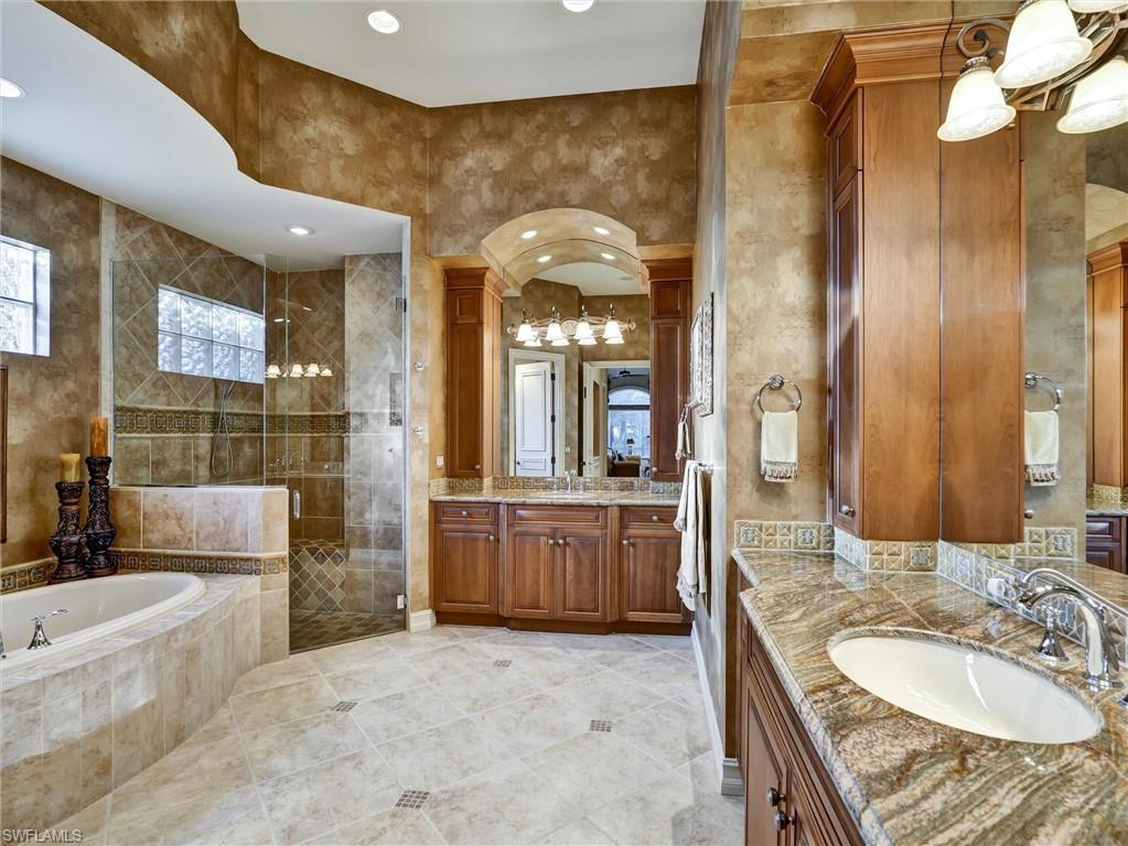 The Estates at Bay Colony, a community definable by no other statement than "Naples' most luxurious estate homes," now offers a residence so special that by comparison on any level, there is no equal. Secluded on a double lakefront estate site, this palatial estate incorporates only the finest materials and artisanship across the 15,247 sq. ft. of living area and exudes a rich European aesthetic. The residence is distinguished by a total of eight-bedroom suites, His and Her studies, a gourmet kitchen, a handsome hidden pub / billiards room, home theatre, and endless views of the lake and golf course from nearly every room. Ideally located on the ground-level, the master suite is nothing short of lavish with His and Her Dressing rooms, a sprawling bathroom befitting of royalty, as well as an adjacent sitting room that could serve a multitude of functions. Offering an impressive landscape for entertaining and relaxing, the exterior living environs host a sprawling logia with motorized screens, a fully-equipped outdoor kitchen, a magnificent pergola, as well as a 50' lap pool with water-lounge and spa - all of which is surrounded by Ritz Carlton styled cabanas. Additionally encompassed on site is a two-bedroom guest house complete with a full kitchen and living room, as well as a six-car capacity four-bay garage plus golf cart bay. It is without a doubt that this home exceeds all expectations and is a "must see" for the most discerning prospects.