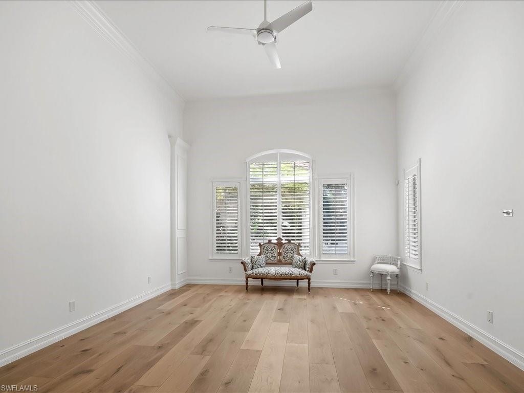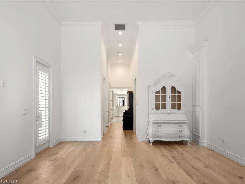 Behind the gates of Bay Laurel Estates, a highly sought-after enclave within Pelican Marsh secured by two manned entries, 8732 Purslane Drive offers a rare blend of elegance and sophistication. Poised on nearly half an acre, the residence features five bedrooms, a den and five and a half baths across 6,650 sprawling square feet of living space. Soaring ceilings and custom finishes create a sense of grandeur, while multiple fireplaces and refined details add warmth. The chef's kitchen, outfitted with Wolf appliances, a butler's pantry and an oversized island, opens to the stunning living and dining areas. Entertaining is effortless with a climate-controlled wine room, illuminated bar and private fitness studio. Outdoors, the resort-style lanai includes a summer kitchen, fireplace, fire pit and electric screens. Surrounded by lush landscaping, a pergola-shaded lounge frames the pool and spa for privacy and relaxation. With a three-car garage, screens and shutters for hurricane protection, and Pelican Marsh amenities including golf, tennis and dining, this residence captures the essence of Naples living.