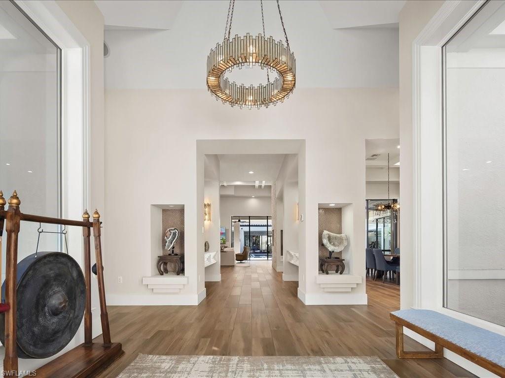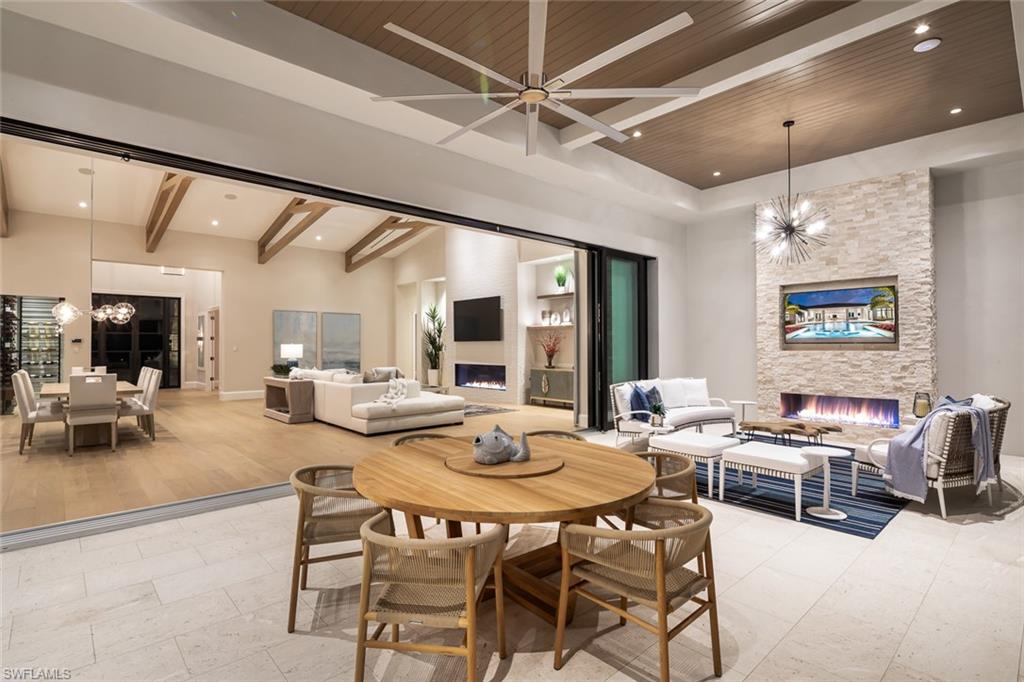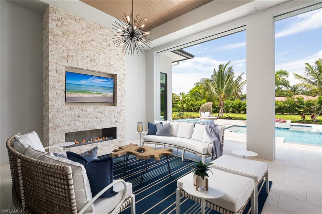 2024 Sand Dollar Winning Custom Home built by Platinum Custom Homes and furnished by Clive Daniel Homes, nestled on an idyllic 1 acre lot only minutes from the beach, this 4BR/5.5BA, 5,824 sqft executive residence emanates coastal elegance and immaculate tropical landscaping. Thoughtfully designed with both beauty and function, the sundrenched interior mesmerizes with soaring vaulted ceilings, an oversized great room with fireplace, and a gourmet kitchen featuring premium stainless-steel appliances, quartz countertops, gas range and a butlers pantry. Evoking luxe indoor/outdoor vibes, the entertainment-ready backyard includes a covered lanai, an outdoor kitchen, a fireplace, a swimming pool, and a spa. Blissful evenings are discovered in the primary suite which has huge dual closets and an opulent en suite with dual vanities, a soaking tub, a walkthrough shower. Three additional bedrooms have walkin closets and en suites. Other features include: 4-car garage, bonus room, exercise room, Collier County water, lighting control in main areas, Sonos speakers, generator, roll down screens & shutters, water softener, airconditioned garages, entry columns and gates are underway and so much more.