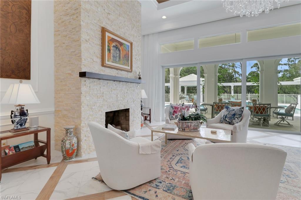 Welcome to an extraordinary residence...a masterfully renovated Classic House infused with modern elegance and Florida charm. Ideally positioned just minutes from the vibrant dining, shopping, and entertainment of North Naples, this home offers unrivaled convenience and sophistication. From its majestic facade, the expansive front porch and balcony provide seamless outdoor living space, matching the rear structures that overlook exquisite views of the pool, the lake, and a lush golf course. The interior boasts a sophisticated foyer with a dramatic staircase and mezzanine, setting the stage for effortless entertaining alongside an exquisitely decorated bar, a chic living room, and a luxurious yet welcoming dining room. Gourmet chefs will delight in the no-expense-spared kitchen flaunting high-end features such as B&B Custom Cabinetry, dual islands, a farm sink, White Carrara marble countertops, a Thermador range, Vent A Hood range hood, a Sub Zero integrated refrigerator, plus two under-counter refrigerator drawers and a beverage center, while preserving stunning original elements. Elevate to the master suite spanning 1,300 sq ft, where a reimagined master bath and a coveted closet await behind elegantly framed French doors that open to the front and rear balconies for panoramic vistas. On the third floor, guest quarters promise privacy and spacious accommodations. Experience timeless elegance and modern living in a location that offers everything at your doorstep. Indulge in this remarkable listing today!