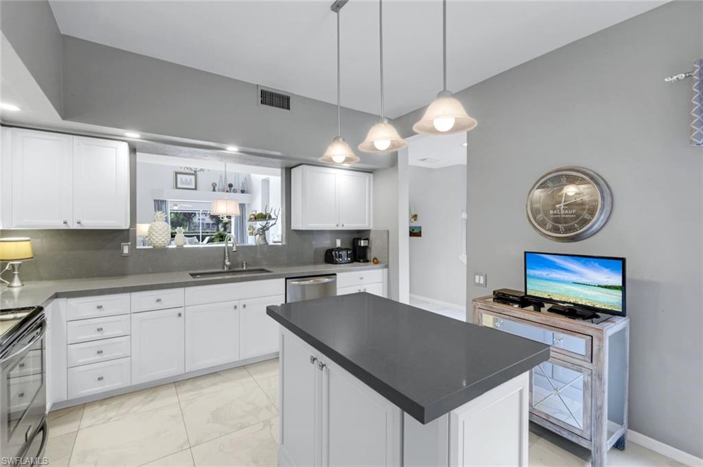 Gorgeous End Unit Villa in Boutique Community. Spacious Ranch Home completely updated and open floor plan! "New" throughout includes, plumbing, updated electrical, appliances, cabinetry, remodeled kitchen and baths, added 15" insulation along with Major Cosmetic updates and upgrades! Lighting, fans, freshly painted, quartz and huge island. Complete with Coffee Bar and Glass Cabinetry. Large Primary Suite with Private Updated Garden Tub and Extra Large Walk-in Shower. Dual Sinks and Loaded with New Cabinets, Walk-in Custom Closet and Beautiful Sliding Door Plantation Shutter leading to Private Patio off Primary Suite. Custom Plantation Shutters throughout and Triple Wide Sliding Glass Door to Open, enclosed, lanai! Facing East to enjoy the Gorgeous Sunrises over the 16th hole of the Golf Course Lake! Front Faces The Quail Creek where you can watch the birds and wildlife fly overhead to nest for the evening. This home is meticulously maintained and simply beautiful throughout! Wonderful Community with Updated Clubhouse, Pool Restaurant Area, Bocce Ball and Working on New Pickle Ball Courts! May Consider Leasing Unit!! Call for Details!!