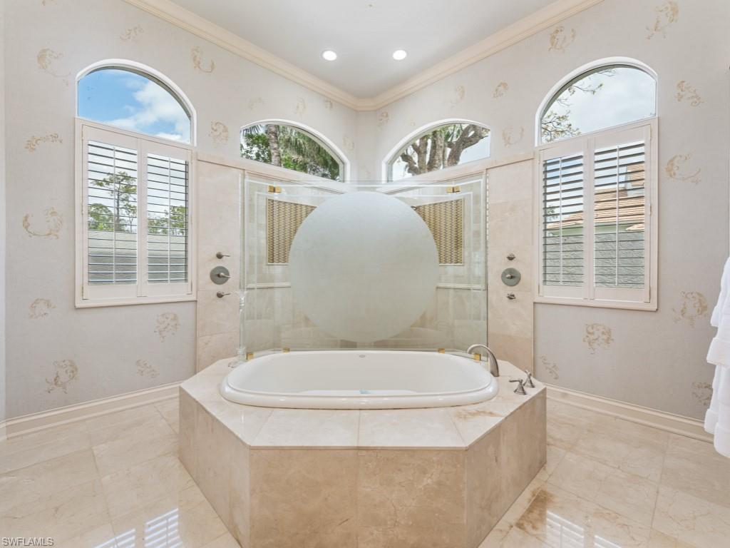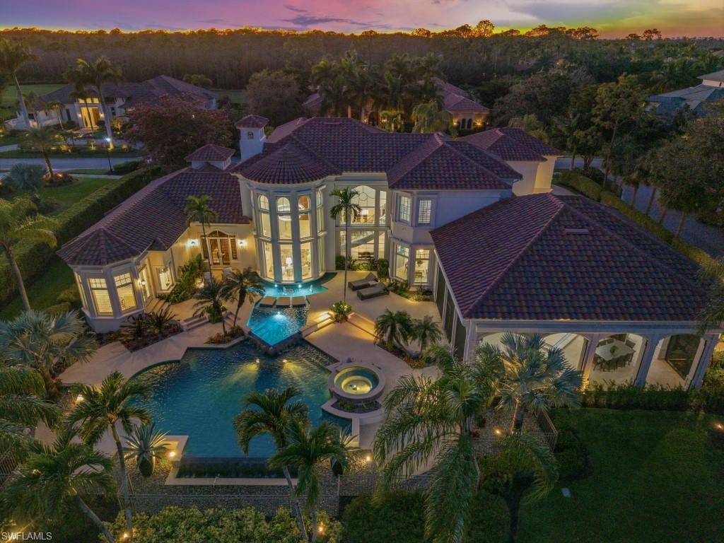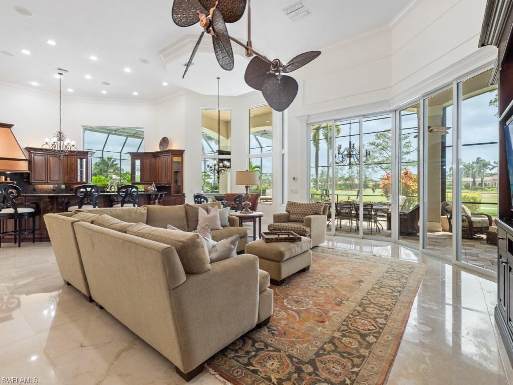 IMMEDIATE GOLF MEMBERSHIP AVAILABLE. Experience breathtaking views overlooking the 13th hole of The Lakes Golf Course from this exquisite residence, where every bedroom features its own en suite. Step through elegant double glass and metal-accented doors into a grand foyer that immediately showcases the home’s fine craftsmanship from the tumbled tile flooring to the soaring coffered and tray ceilings. The spacious living room centers around a gas fireplace and dramatic floor-to-ceiling windows that frame the picturesque outdoor living area .An entertainer’s dream, the residence features a stylish wet bar and a beautifully appointed office with custom built-in cabinetry. The gourmet kitchen seamlessly flows into the family room, showcasing dual islands, premium finishes, and expansive zero-corner sliders that open fully to the lanai—blurring the lines between indoor and outdoor living. Outside, enjoy the ultimate alfresco experience with a fully equipped outdoor kitchen, bar, and generous covered seating areas. The sparkling saltwater, gas-heated pool and integrated spa create a private resort setting, perfect for relaxing or entertaining against the backdrop of sweeping golf course vistas. Notable upgrades include spray foam insulation with an air-conditioned garage, updated HVAC systems, a whole-house generator, electric hurricane shutters, impact-resistant windows, a metal roof with a 50-year warranty, and 17-inch gutters.A perfect harmony of elegance and liveability, this remarkable residence embodies the very best of luxury golf course living in Southwest Florida.