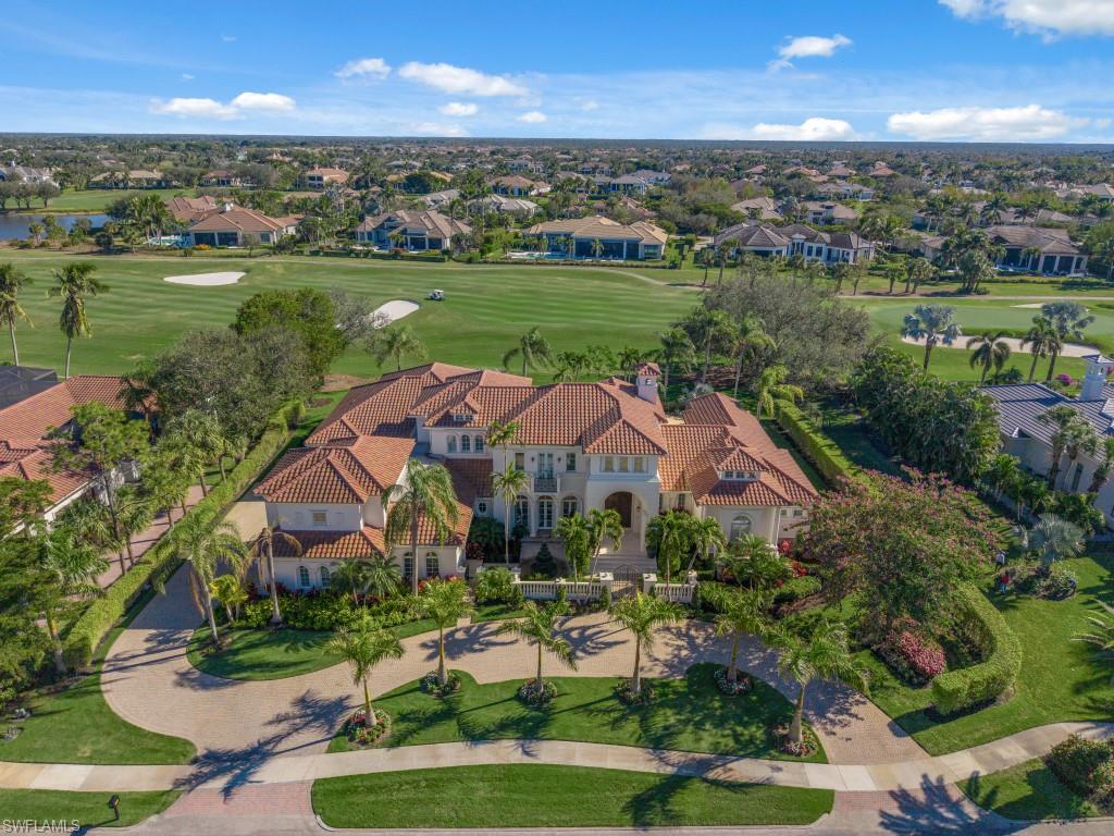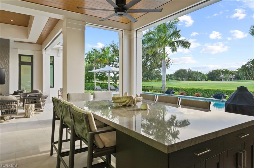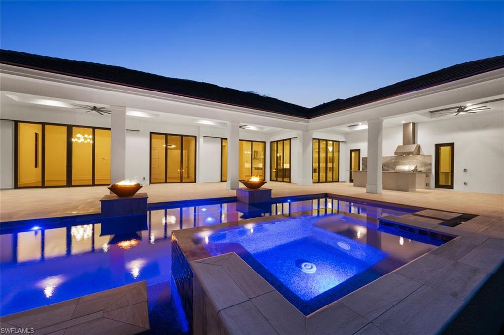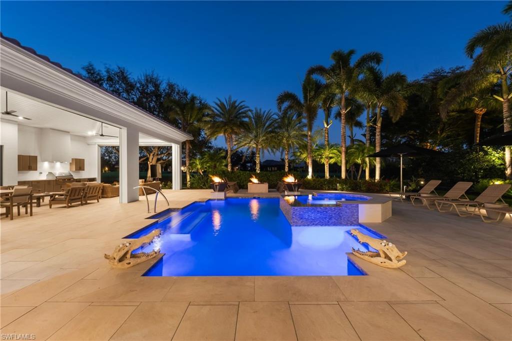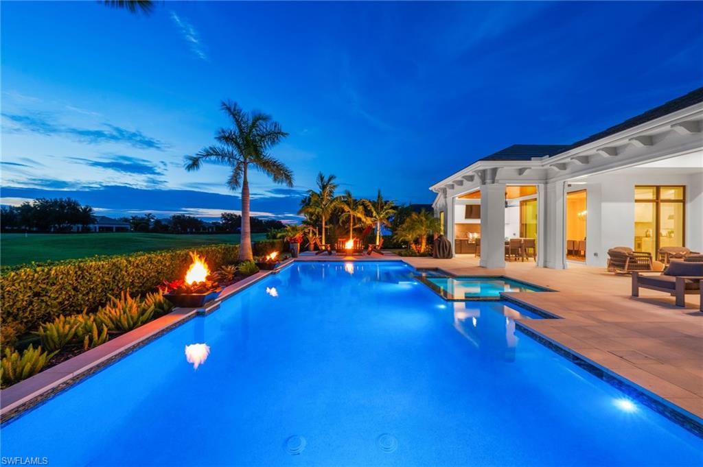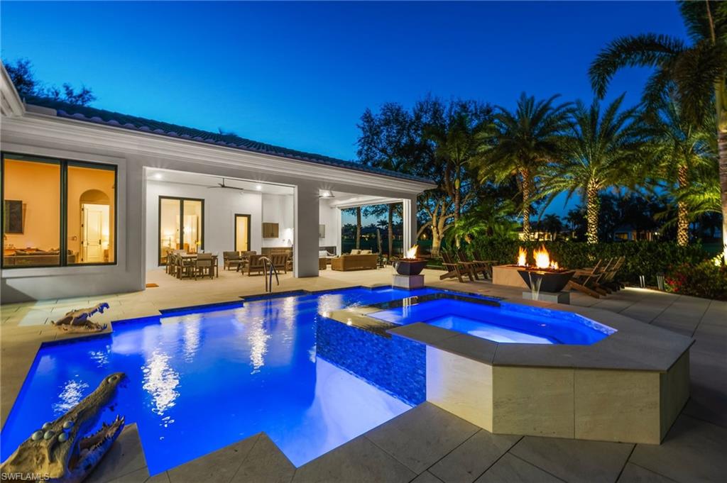 Exquisitely designed with soaring, coffered ceilings as you enter the double, glass paned front doors to the beautiful foyer offering stunning views of the craftsmanship details to the fabulous exterior views overlooking your lanai, pool/spa and to the golf course and lake beyond. Inside, you will be immersed in luxury as you enjoy a gas fireplace flanking the formal living room to the fabulous kitchen detailed with an abundance of workspace, island, and Wolf appliances and overlooking the breakfast nook and family room with zero corner sliders leading to the fantastic lanai. There you will appreciate the built in outdoor kitchen, seating area and the lovely, coffered ceiling. The pool/spa and gas fire pit are open for wonderful starry nights and fabulous entertaining. With 4 bedrooms, all ensuite, den and media room, you and your family and guests will appreciate the privacy of personal spaces and the 3-car garage with a portico allows plenty of spaces for your treasured vehicles.