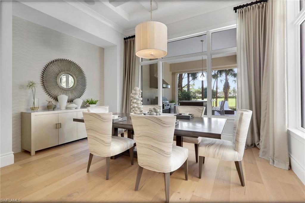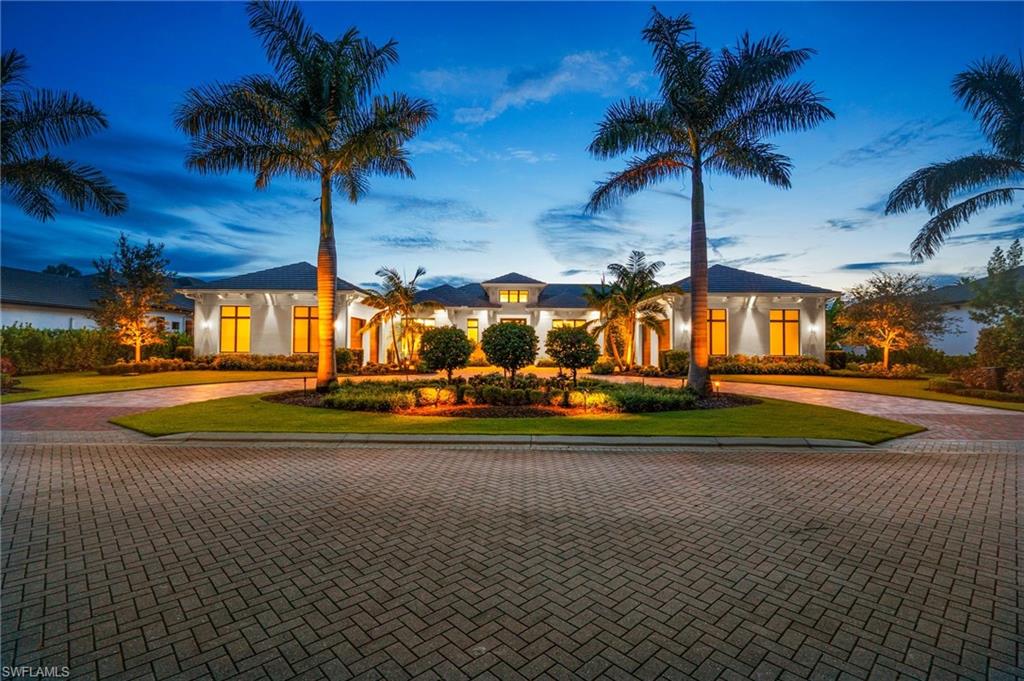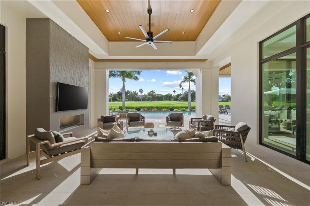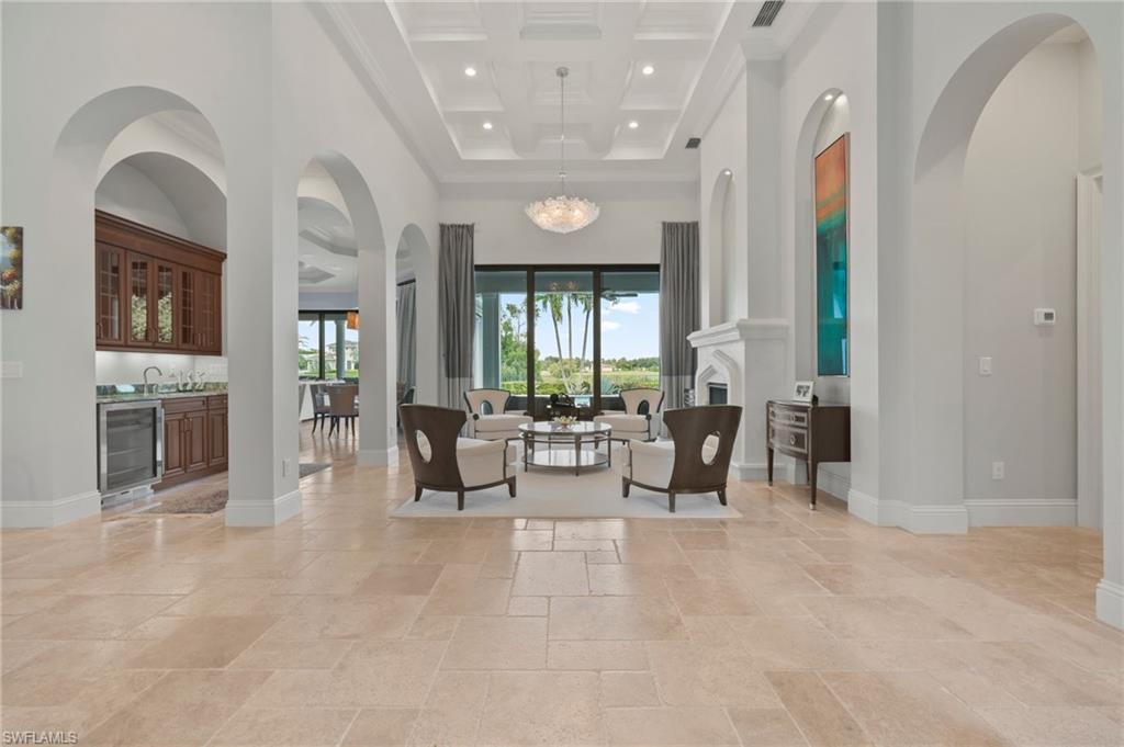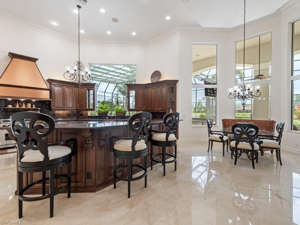 Exquisitely designed with soaring, coffered ceilings as you enter the double, glass paned front doors to the beautiful foyer offering stunning views of the craftsmanship details to the fabulous exterior views overlooking your lanai, pool/spa and to the golf course and lake beyond. Inside, you will be immersed in luxury as you enjoy a gas fireplace flanking the formal living room to the fabulous kitchen detailed with an abundance of workspace, island, and Wolf appliances and overlooking the breakfast nook and family room with zero corner sliders leading to the fantastic lanai. There you will appreciate the built in outdoor kitchen, seating area and the lovely, coffered ceiling. The pool/spa and gas fire pit are open for wonderful starry nights and fabulous entertaining. With 4 bedrooms, all ensuite, den and media room, you and your family and guests will appreciate the privacy of personal spaces and the 3-car garage with a portico allows plenty of spaces for your treasured vehicles.