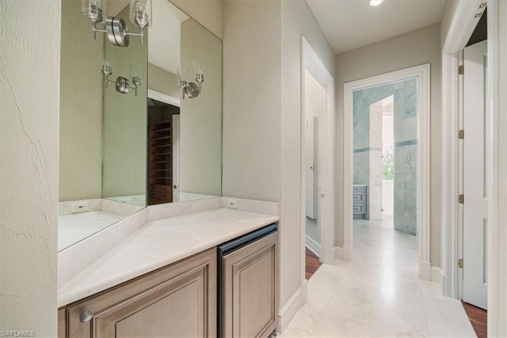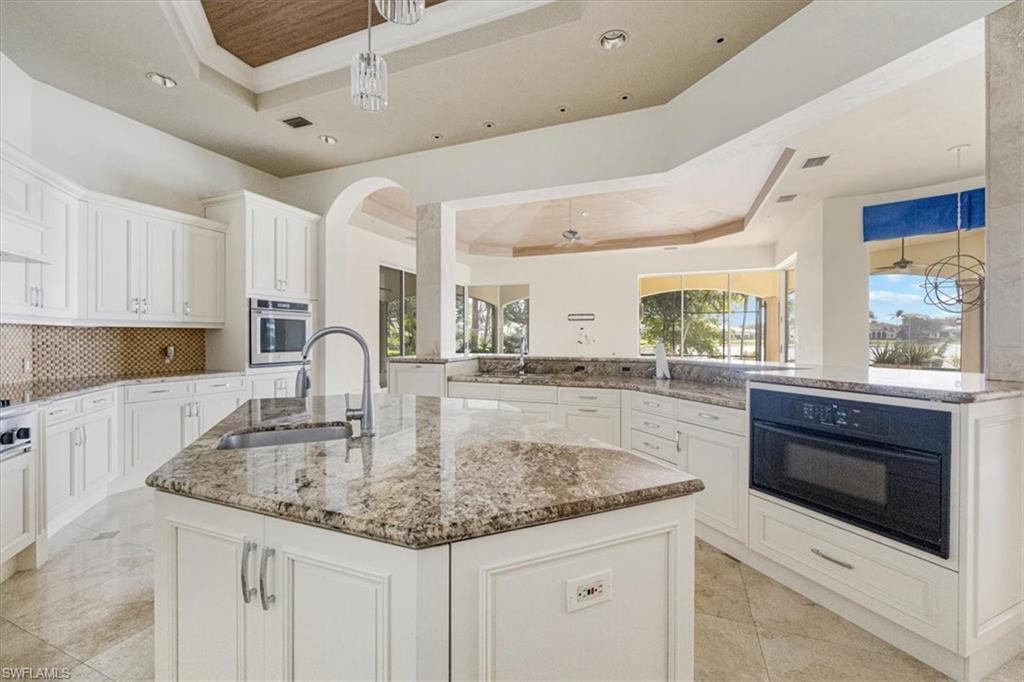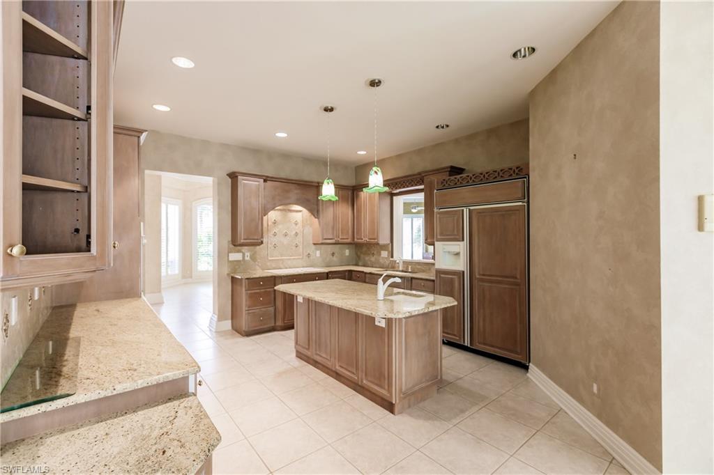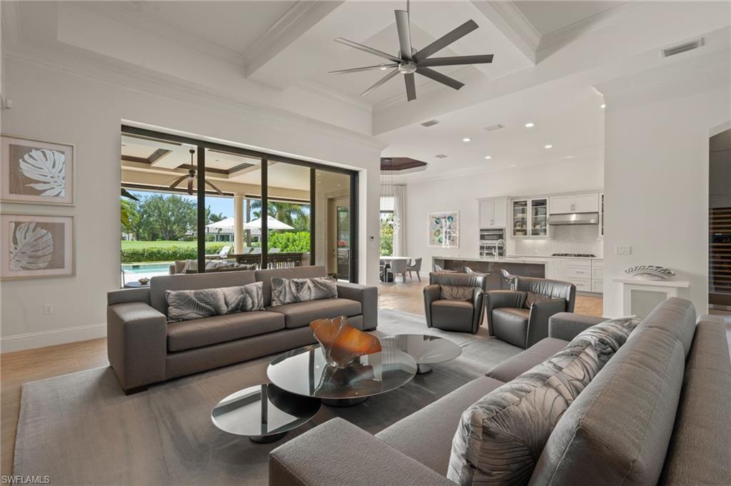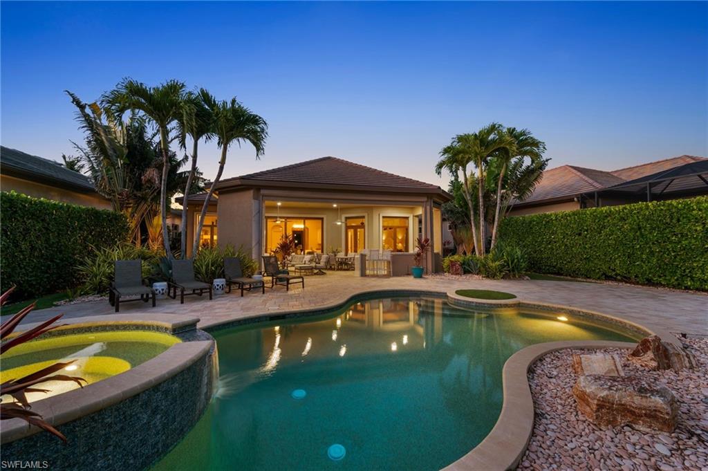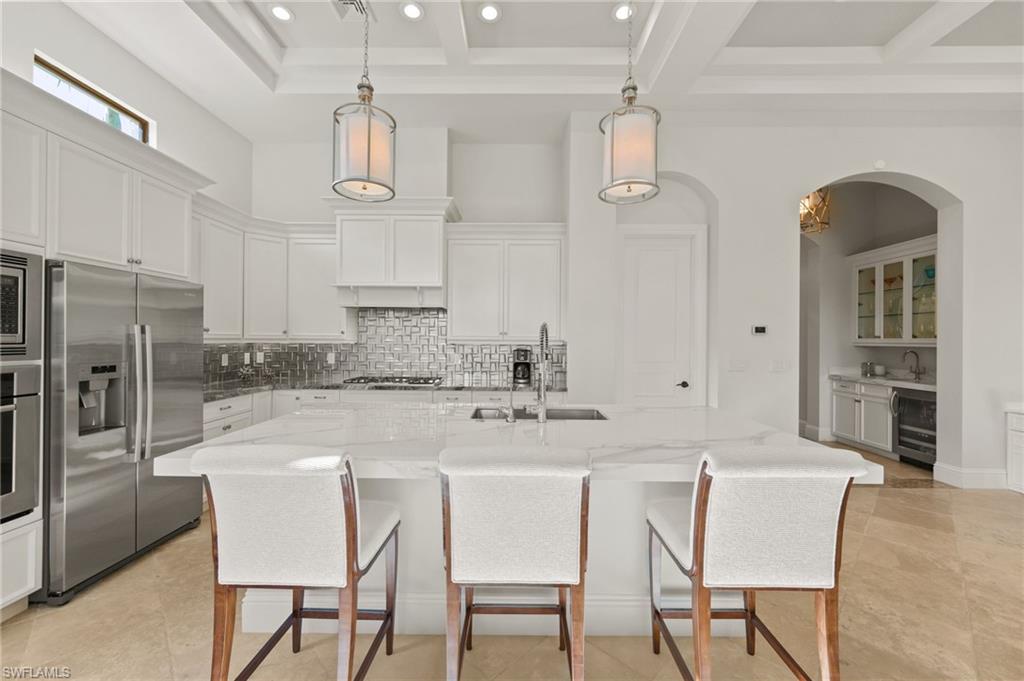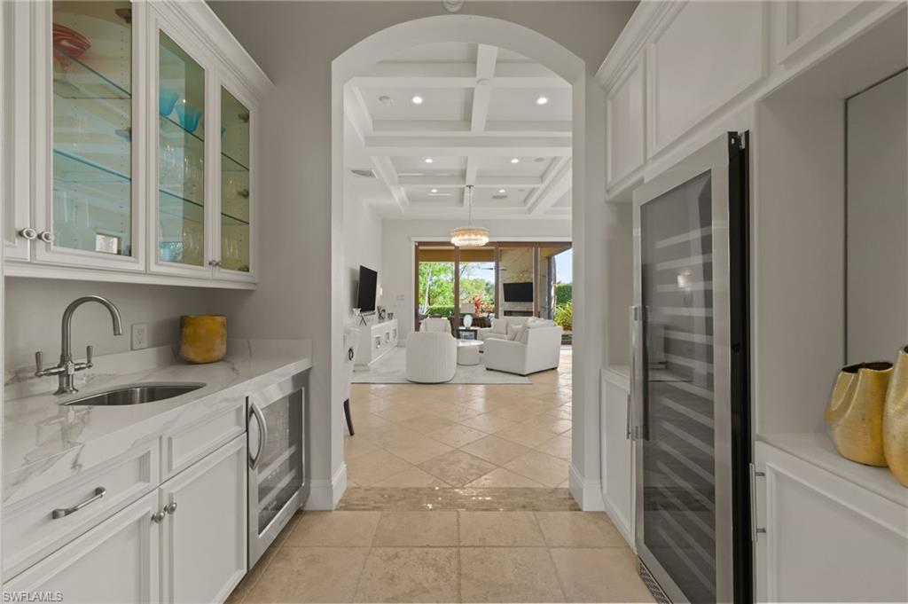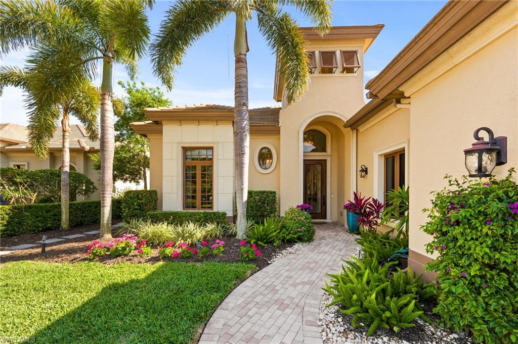 IMMEDIATE GOLF AVAILABLE - SKIP THE WAITLIST! Experience the timeless merging of chic elegance and clean lines all within the existing open spaces of this updated villa. Reimagined by Jorge Castillo Interiors/Miami, every detail has been meticulously curated to create a refined, tranquil space that’s both sophisticated and inviting. New floors were added to match the main area flooring so that each room merges effortlessly. The sleek, tailored millwork of the custom built-ins thoughtfully integrated throughout the home offers both aesthetic appeal and practical storage. The split floor plan features an open great room with gathering and dining areas as well as a gourmet kitchen boasting a large new island plus stainless steel appliances. The high design continues with a go-to wine room/game room anchored by built-in wine coolers. The primary suite has been redesigned with two re-styled walk-in closets, new shower tile and shower glass, new faucets and an enviable view. Many new designer light fixtures and fans are featured throughout as well as a renovated, air-conditioned 3-car garage with new epoxy flooring and insulated ceiling and doors. Take it outside for amazing sunset views from an expansive lanai that is the envy of the area. All new retractable screens, new tile surrounds for fireplace and grill backsplash, new cabinetry and waterfall countertops with a separate new counter for al fresco dining. Surrounded by new landscaping and open golf course views, there is no need to go inside!