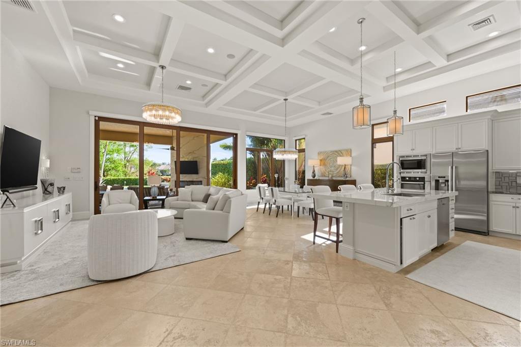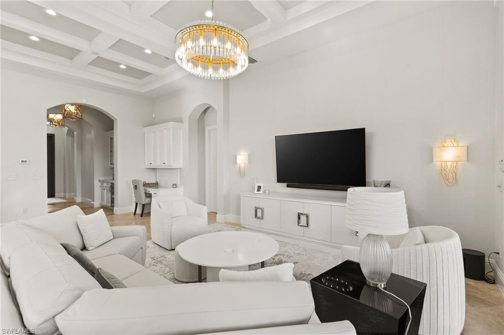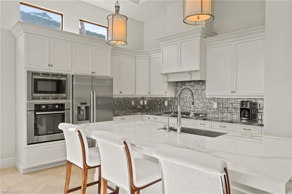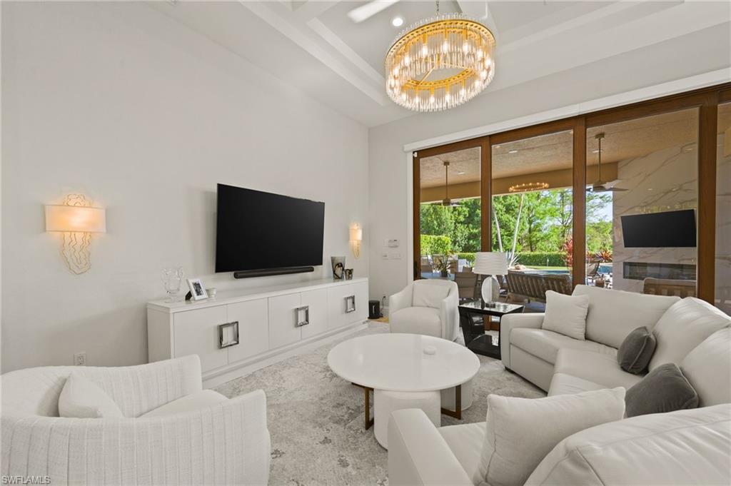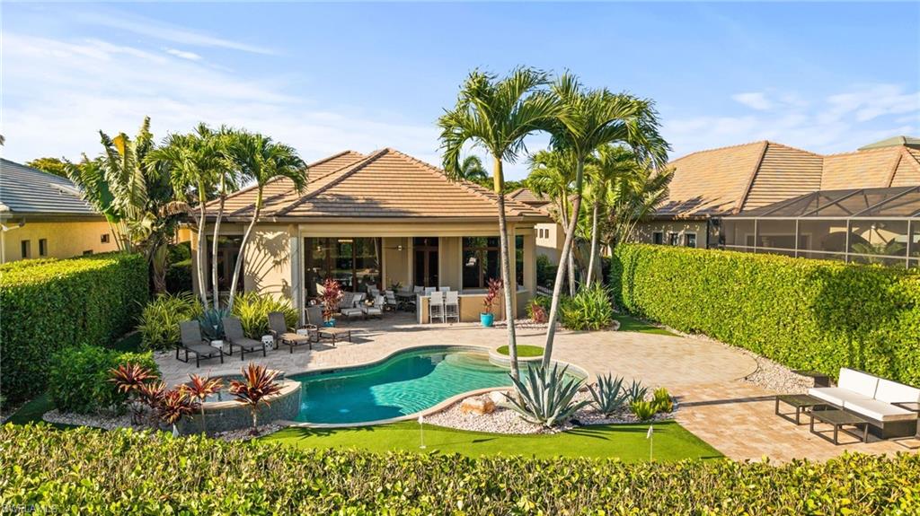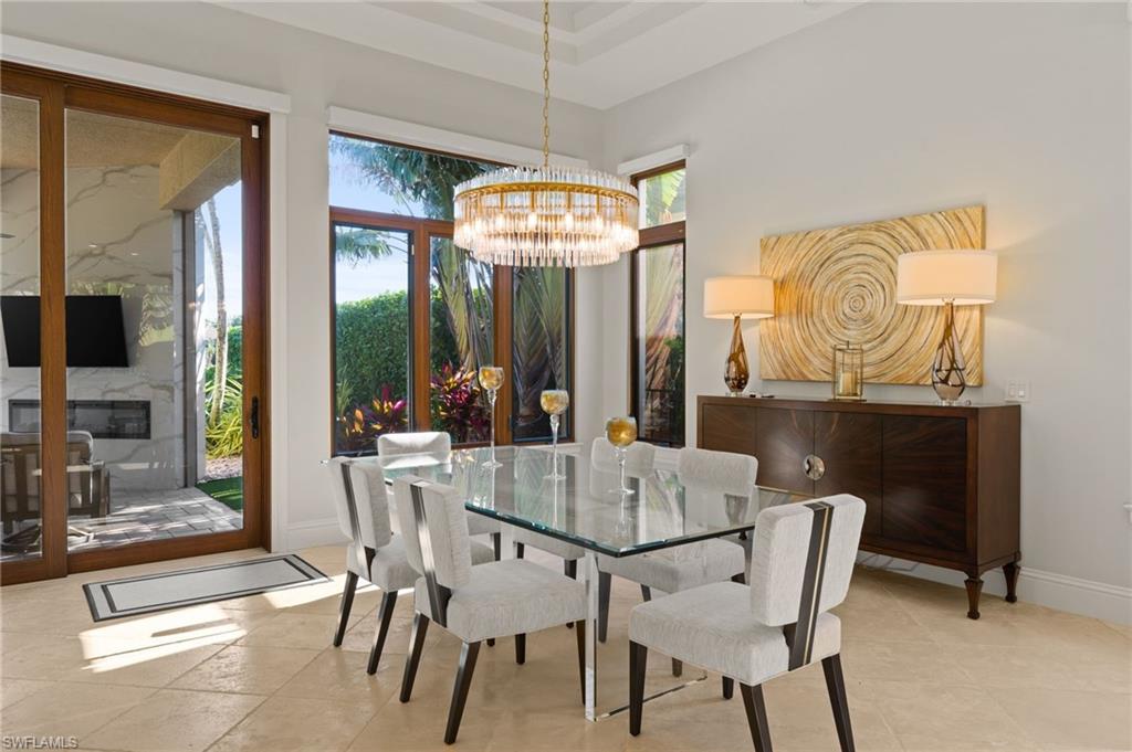 Step into this beautifully updated residence where classic architecture meets modern sophistication. Thoughtfully redesigned by Clive Daniels, this home blends Florida charm with contemporary flair. The open floor plan lends itself to entertaining with a bright and airy great room highlighted by a glamorous TV wall and opening to the gourmet kitchen with white cabinetry, stainless-steel appliances and a reverse osmosis system. The adjacent dining area offers spectacular outdoor views and features Clive Daniel custom-designed furniture and new chandelier lighting. As you tour the home, you will find that every detail has been curated with updated, upgraded elements to elevate the SWFL living experience such as spa-inspired bathrooms, room-darkening shades, stylish wallpaper, new window treatments and lighting. The emphasis is on living spaces for entertaining or simply a quiet retreat. Of course, the highlight of every Florida home is the outdoor space, and this home exceeds anyone’s wish list. Completely re-imagined by Clive Daniels is the new outdoor kitchen featuring a porcelain island and feature wall, new gas fireplace, television and outdoor furniture arranged to accommodate both dining and relaxation. New retractable screens and a new putting green add to this fun-filled space where you can drink in the water, golf and perfect southwest sunset views!