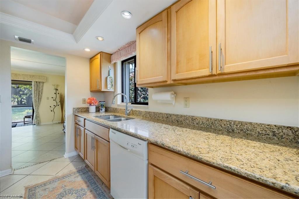 This move-in ready, turnkey furnished first-floor end unit offers beautiful lake views and a light, airy 3-bedroom, 2-bath layout designed for effortless living. A custom-installed closet now transforms the den into a true third bedroom—adding flexibility for guests, a home office, or hobby space. Wood-style tile flooring flows throughout for easy maintenance, while the eat-in kitchen features granite countertops, ample cabinetry, and a breakfast bar ideal for casual dining. The split-bedroom floor plan ensures privacy, and the primary suite offers an en-suite bath and generous closet space. Additional highlights include an in-unit laundry room with wash tub, side-by-side washer and dryer, and a detached one-car garage just steps from the front door. Lovingly maintained and ready for immediate enjoyment, this residence invites you to start living the Naples lifestyle from day one. The Retreat at Waterside offers resort-style amenities including a community pool, tennis courts, and scenic walking and biking trails—all within a secure, guard-gated community. Ideally located west of 41 and just minutes from world-class beaches, Delnor-Wiggins Pass State Park, and the upscale dining and shopping at Mercato, this lakefront condo perfectly blends comfort, convenience, and coastal charm.