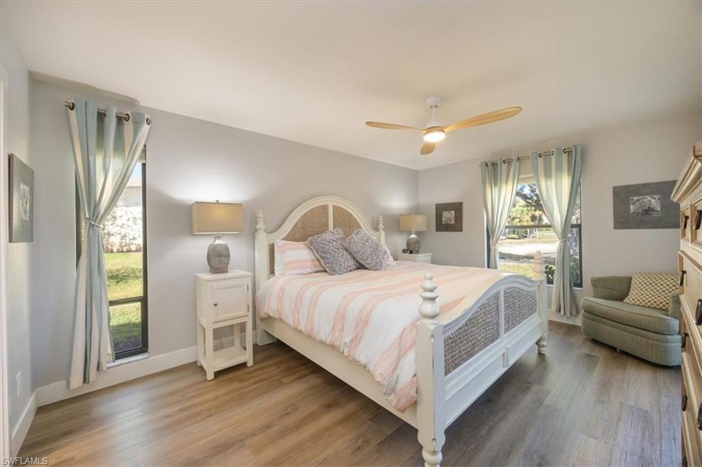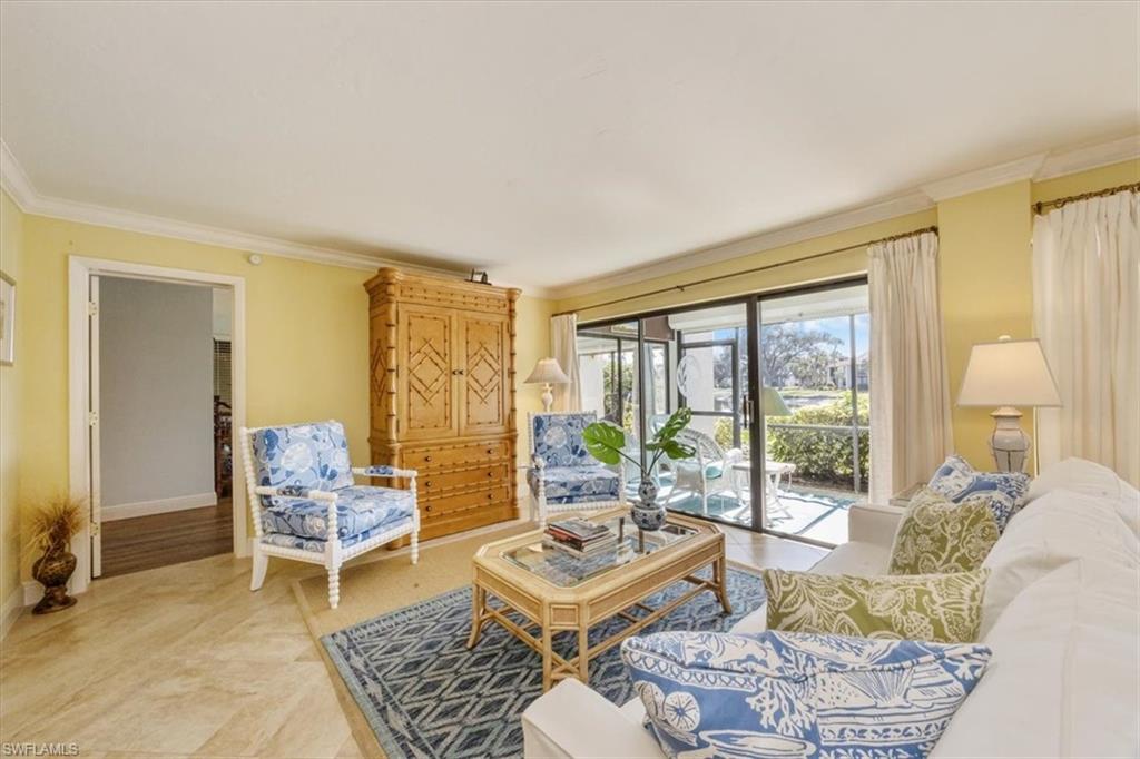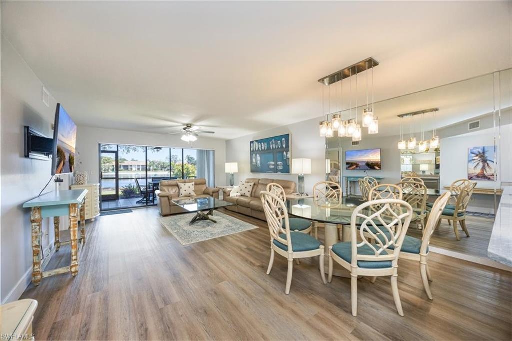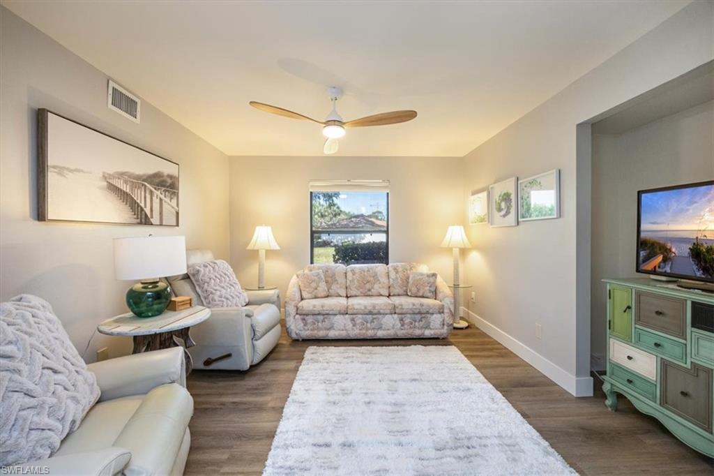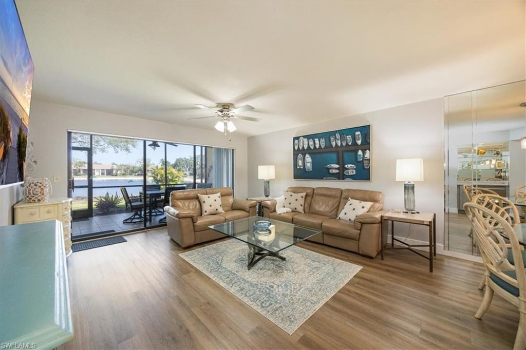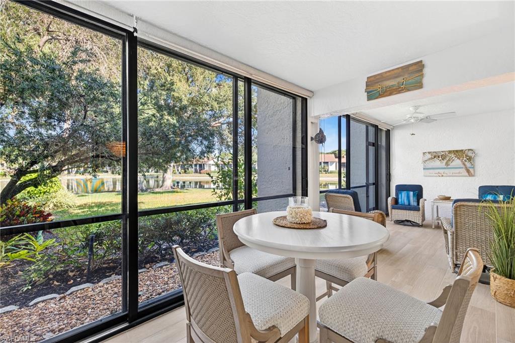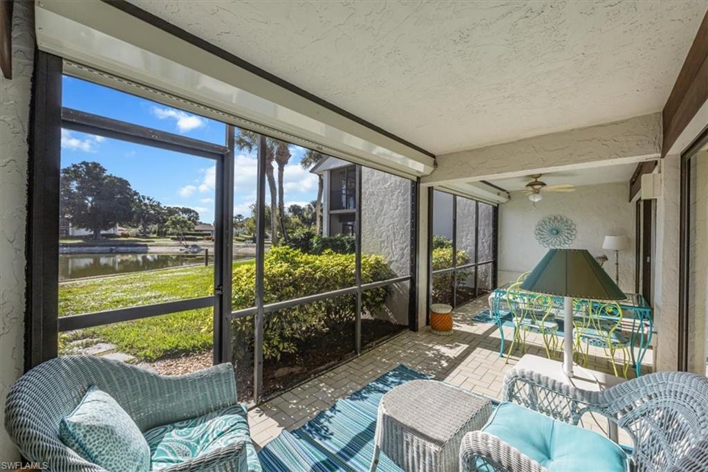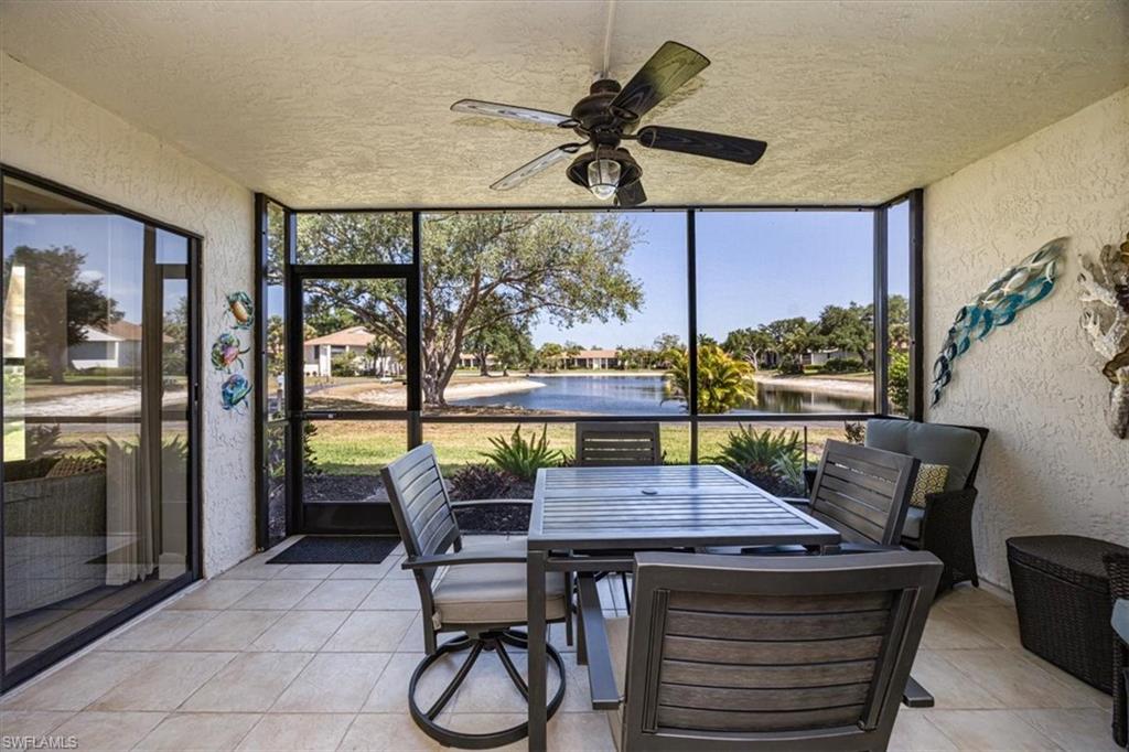 Spectacular panoramic lake views await at this rarely available, first-floor end unit located in the desirable community of The Retreat! Enjoy tranquil water views from nearly every room and a spacious, oversized screened lanai—perfect for morning coffee, evening sunsets, or effortless indoor-outdoor living. A charming garden entry with large private patio courtyard welcomes you home and offers direct access to the detached garage. THIS GARDEN PATIO OFFERS OUTDOOR LIVING FLEXIBILITY FOR THOSE BEAUTIFUL FLORIDA DAYS AND EVENING BBQ’s. Boasting 2 bedrooms plus a den, 2 baths, and 1,737 sq. ft. of light-filled living space (1,962 total sq. ft. WITH LANAI) this residence lives large. Nicely appointed and being sold fully furnished, it’s truly move-in ready from day one. The guest bedroom is as generously sized as the primary suite, and both bedrooms feature walk-in closets and picturesque lake views. Freshly painted interiors, updated bathrooms, and new luxury vinyl plank flooring throughout provide a modern, coastal-inspired feel. You’ll love the abundance of natural light, ample storage, and the flexible den—ideal for a home office, hobby room, or extra sleeping space. Step outside and enjoy The Retreat’s peaceful ambiance, where scenic wooden bridges wind through a natural wildlife estuary and connect to miles of bike and jogging paths. Located west of 41, just minutes from Vanderbilt Beach, Bonita Beach, Wiggins Pass State Park, and Barefoot Beach, this gated community offers 24-hour patrol, a convenient back gate to Vanderbilt Drive, and a saltwater community pool, spa, and grilling area just steps from your door. This is the perfect home for year-round living, a seasonal getaway, or a smart investment in one of Naples’ most sought-after locations. Come experience the beauty, serenity, and lifestyle of The Retreat—your new memories start here!