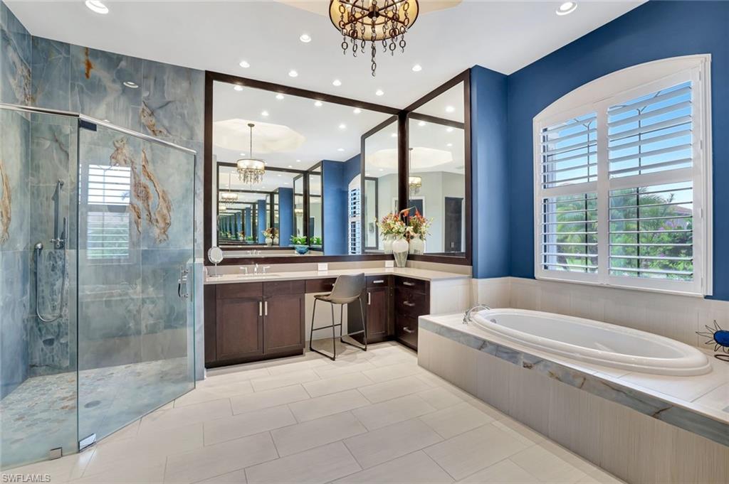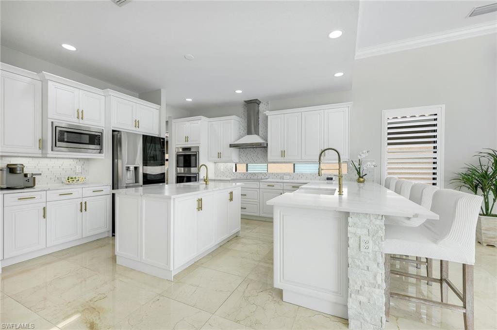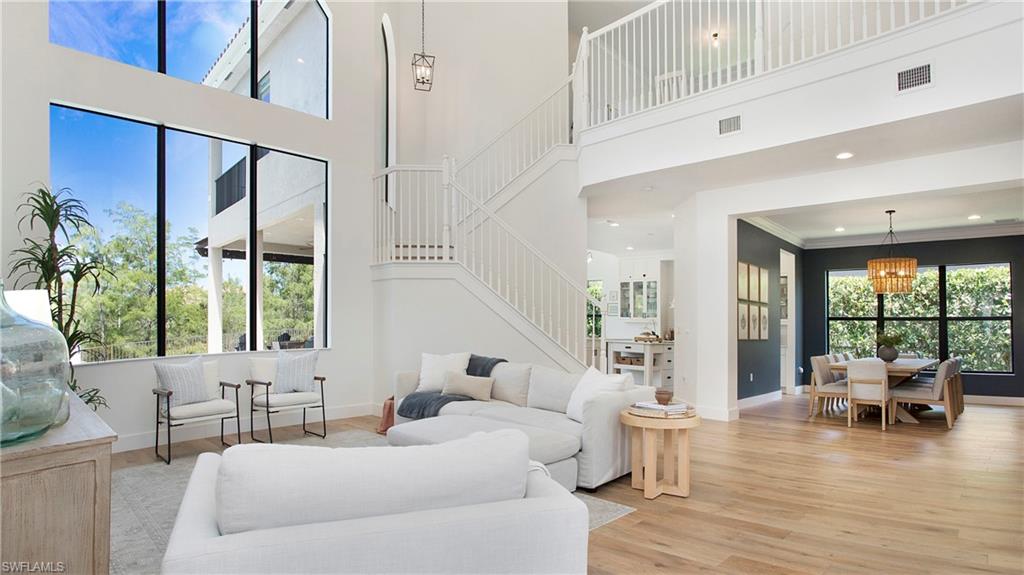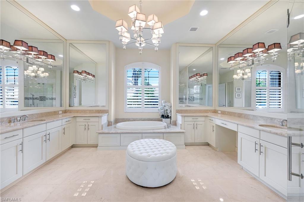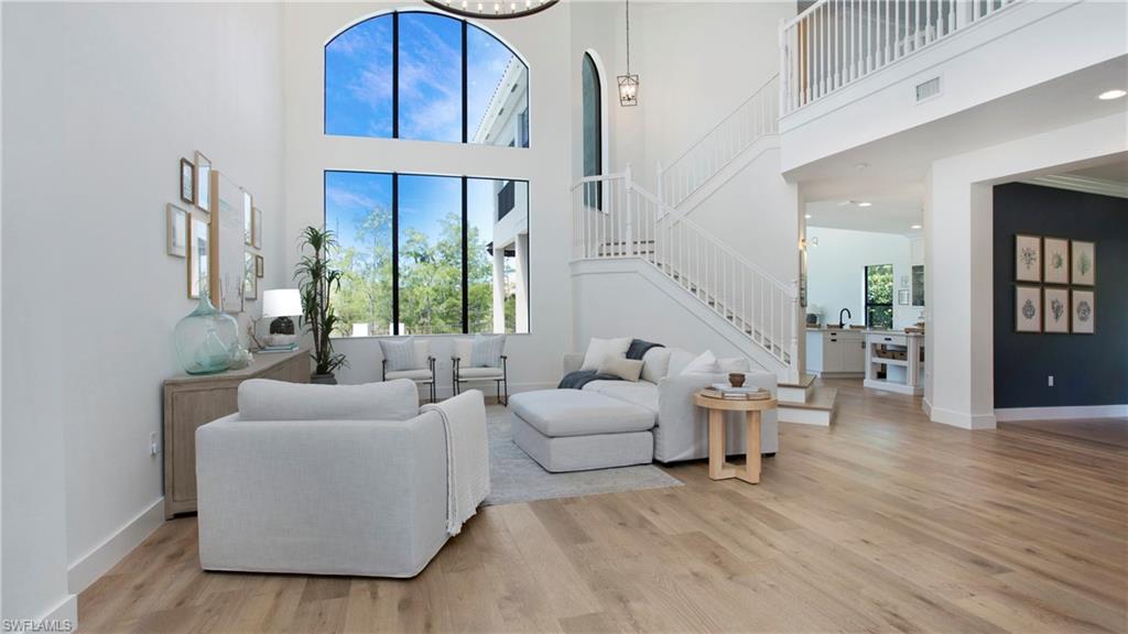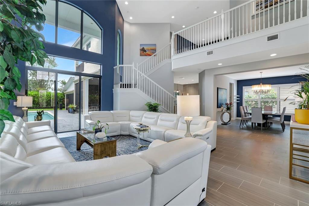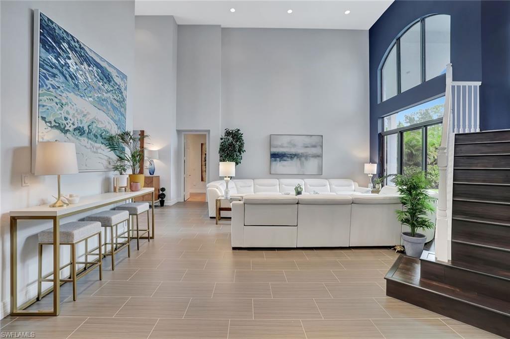 Discover the pinnacle of luxury living with the largest floor plan available in Riverstone of Naples. The Dubonnet Grande model seamlessly blends style, elegance, and functionality, offering a home that has been meticulously remodeled with exceptional attention to detail. As you enter, you are greeted by a grand foyer and soaring volume ceilings, with natural light cascading into the family room through expansive picture windows. The kitchen is a culinary masterpiece, featuring custom cabinetry, a functional island, GE Monogram appliances, glass front cabinets and stunning quartz countertops, all reminiscent of a magazine showroom. The pantry is a marvel, with its glass French door entry, subway tile backsplash, butcher block counters, and custom shelving designed to optimize every nook. The main living areas boast engineered hardwood flooring, enhanced with a thicker veneer for added durability and humidity resistance. The entryway leads to a mud/laundry room equipped with custom gray cabinets and a convenient bench seat. The crown jewel of the ground floor is the primary suite, featuring grand bay windows and a luxuriously remodeled primary bath that promises a spa-like retreat. Step outside to a vast, private outdoor space. Clusia hedges lined with fencing offer seclusion, while the preserve and trellis in the rear create the perfect backdrop for the western exposure. The pool area is a haven, with natural shell inlay pavers that stay cool underfoot, a smartly designed pool with a sun shelf, and a hot tub with a drip edge overlook. Ascend the grand staircase, accentuated with white risers, to reach the open loft/den area, which can be enclosed for an office. A few steps lead to the versatile bonus/media room, complete with built-in cabinets and a mini-fridge. The second floor also includes an open balcony, perfect for crafting your own Southwest Florida paradise, as well as three additional bedrooms and two and a half baths. Further enhancements include crown moldings throughout most of the home, three separate HVAC systems for personalized comfort, a 50-amp breaker for a generator, and a 240-amp breaker for your electric vehicle. This impeccably designed home is ready for you to move in and start living the dream.