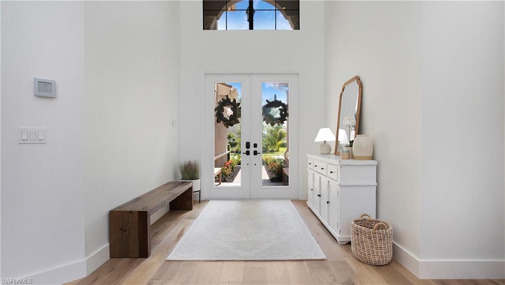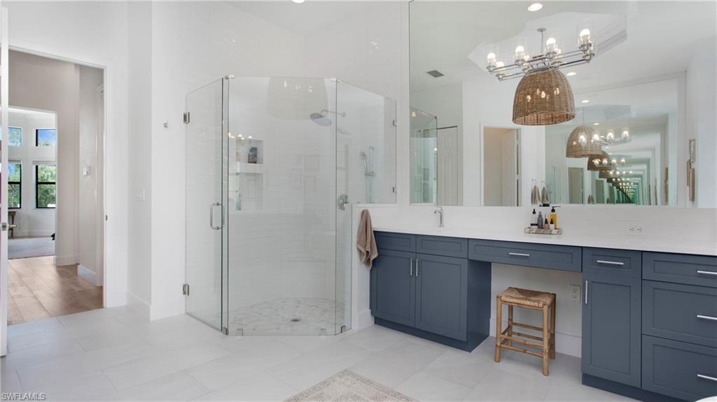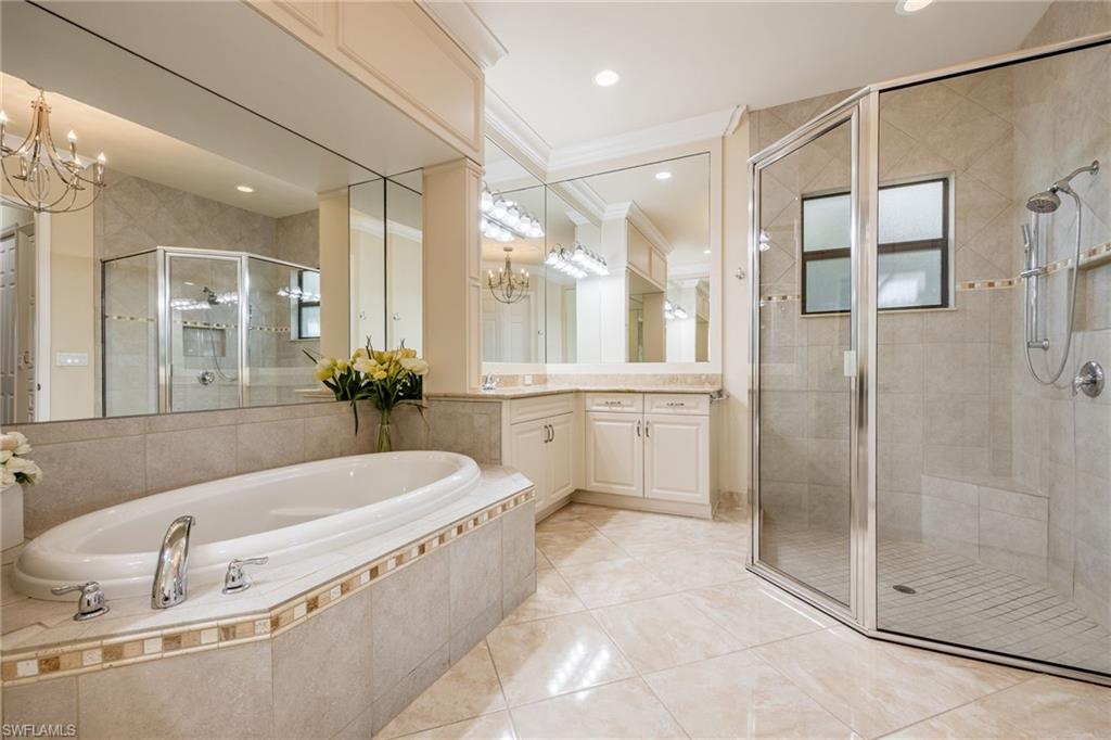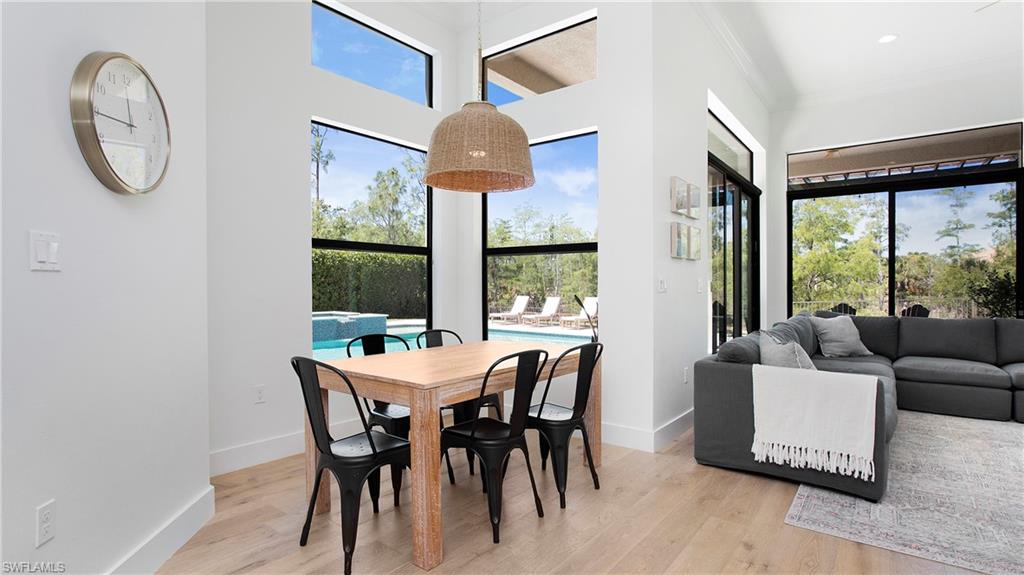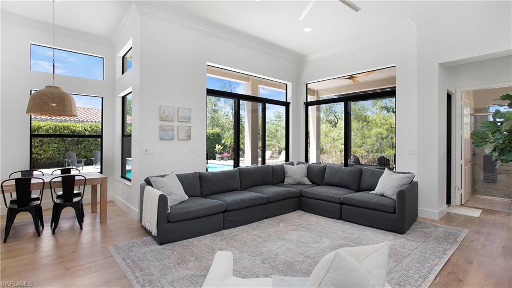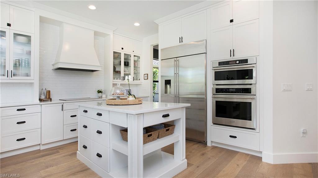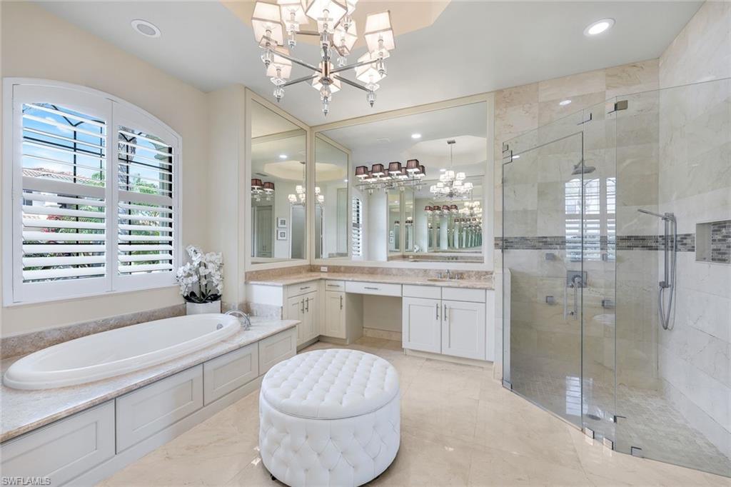 Discover the pinnacle of luxury living with the largest floor plan available in Riverstone of Naples. The Dubonnet Grande model seamlessly blends style, elegance, and functionality, offering a home that has been meticulously remodeled with exceptional attention to detail. As you enter, you are greeted by a grand foyer and soaring volume ceilings, with natural light cascading into the family room through expansive picture windows. The kitchen is a culinary masterpiece, featuring custom cabinetry, a functional island, GE Monogram appliances, glass front cabinets and stunning quartz countertops, all reminiscent of a magazine showroom. The pantry is a marvel, with its glass French door entry, subway tile backsplash, butcher block counters, and custom shelving designed to optimize every nook. The main living areas boast engineered hardwood flooring, enhanced with a thicker veneer for added durability and humidity resistance. The entryway leads to a mud/laundry room equipped with custom gray cabinets and a convenient bench seat. The crown jewel of the ground floor is the primary suite, featuring grand bay windows and a luxuriously remodeled primary bath that promises a spa-like retreat. Step outside to a vast, private outdoor space. Clusia hedges lined with fencing offer seclusion, while the preserve and trellis in the rear create the perfect backdrop for the western exposure. The pool area is a haven, with natural shell inlay pavers that stay cool underfoot, a smartly designed pool with a sun shelf, and a hot tub with a drip edge overlook. Ascend the grand staircase, accentuated with white risers, to reach the open loft/den area, which can be enclosed for an office. A few steps lead to the versatile bonus/media room, complete with built-in cabinets and a mini-fridge. The second floor also includes an open balcony, perfect for crafting your own Southwest Florida paradise, as well as three additional bedrooms and two and a half baths. Further enhancements include crown moldings throughout most of the home, three separate HVAC systems for personalized comfort, a 50-amp breaker for a generator, and a 240-amp breaker for your electric vehicle. This impeccably designed home is ready for you to move in and start living the dream.