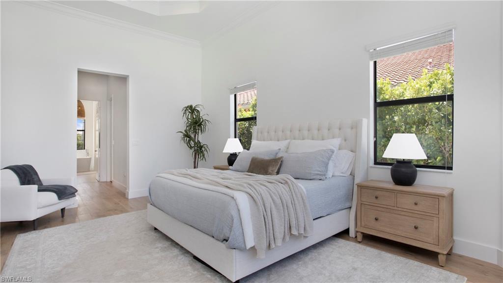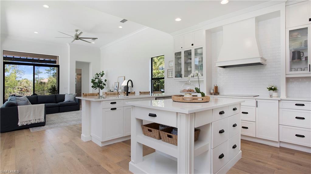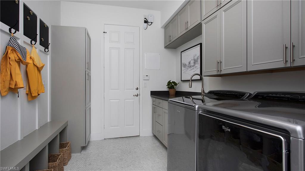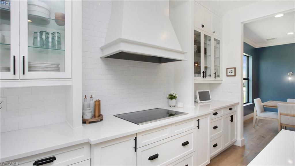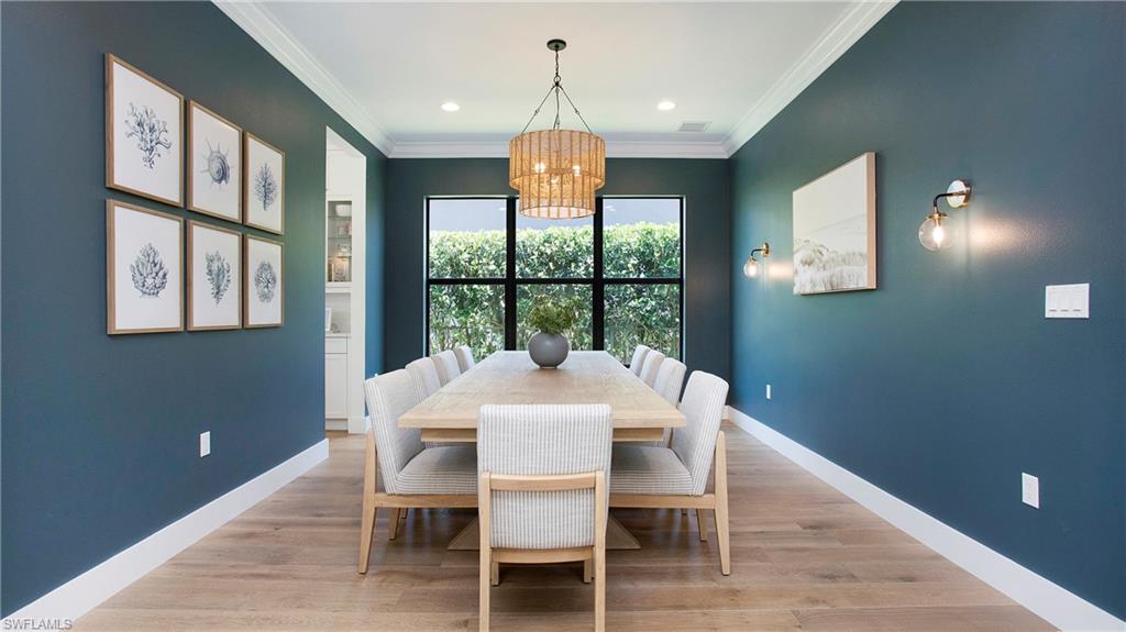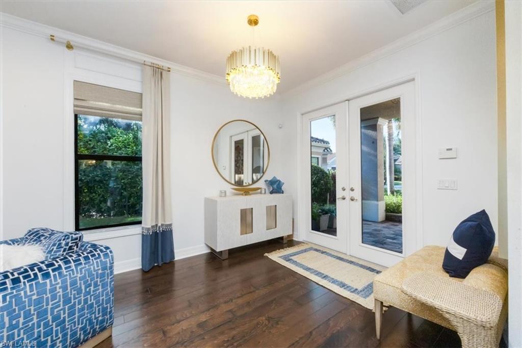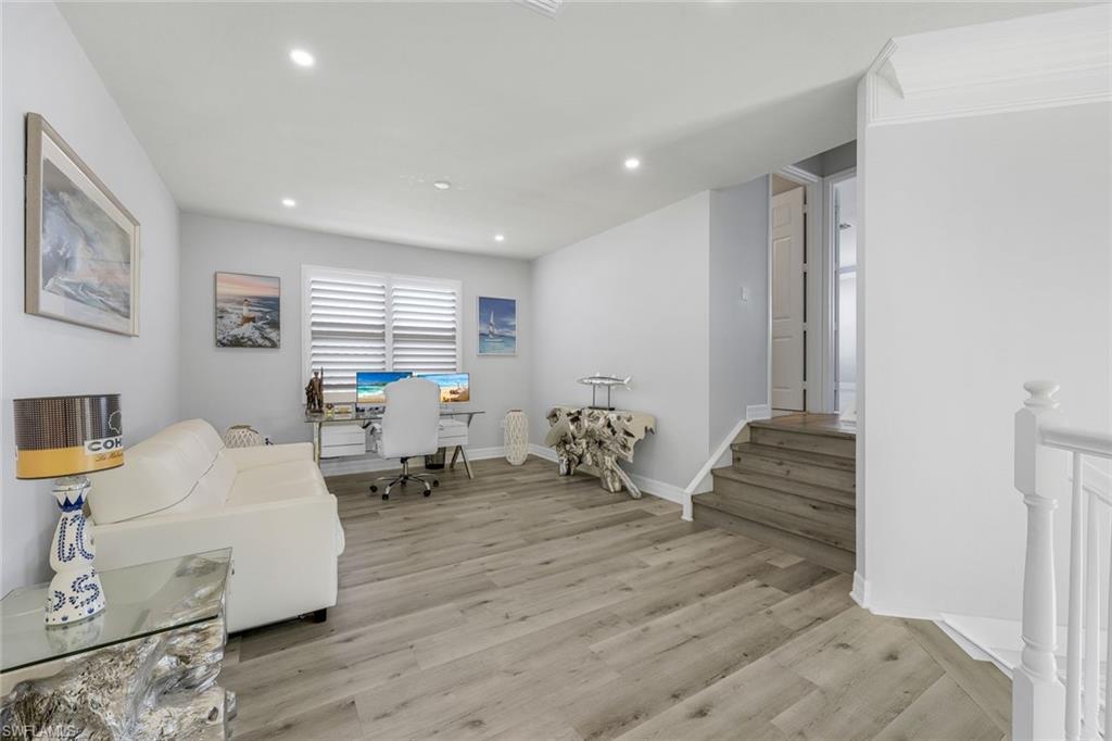 Discover the pinnacle of luxury living with the largest floor plan available in Riverstone of Naples. The Dubonnet Grande model seamlessly blends style, elegance, and functionality, offering a home that has been meticulously remodeled with exceptional attention to detail. As you enter, you are greeted by a grand foyer and soaring volume ceilings, with natural light cascading into the family room through expansive picture windows. The kitchen is a culinary masterpiece, featuring custom cabinetry, a functional island, GE Monogram appliances, glass front cabinets and stunning quartz countertops, all reminiscent of a magazine showroom. The pantry is a marvel, with its glass French door entry, subway tile backsplash, butcher block counters, and custom shelving designed to optimize every nook. The main living areas boast engineered hardwood flooring, enhanced with a thicker veneer for added durability and humidity resistance. The entryway leads to a mud/laundry room equipped with custom gray cabinets and a convenient bench seat. The crown jewel of the ground floor is the primary suite, featuring grand bay windows and a luxuriously remodeled primary bath that promises a spa-like retreat. Step outside to a vast, private outdoor space. Clusia hedges lined with fencing offer seclusion, while the preserve and trellis in the rear create the perfect backdrop for the western exposure. The pool area is a haven, with natural shell inlay pavers that stay cool underfoot, a smartly designed pool with a sun shelf, and a hot tub with a drip edge overlook. Ascend the grand staircase, accentuated with white risers, to reach the open loft/den area, which can be enclosed for an office. A few steps lead to the versatile bonus/media room, complete with built-in cabinets and a mini-fridge. The second floor also includes an open balcony, perfect for crafting your own Southwest Florida paradise, as well as three additional bedrooms and two and a half baths. Further enhancements include crown moldings throughout most of the home, three separate HVAC systems for personalized comfort, a 50-amp breaker for a generator, and a 240-amp breaker for your electric vehicle. This impeccably designed home is ready for you to move in and start living the dream.