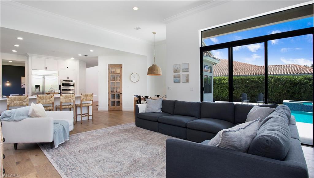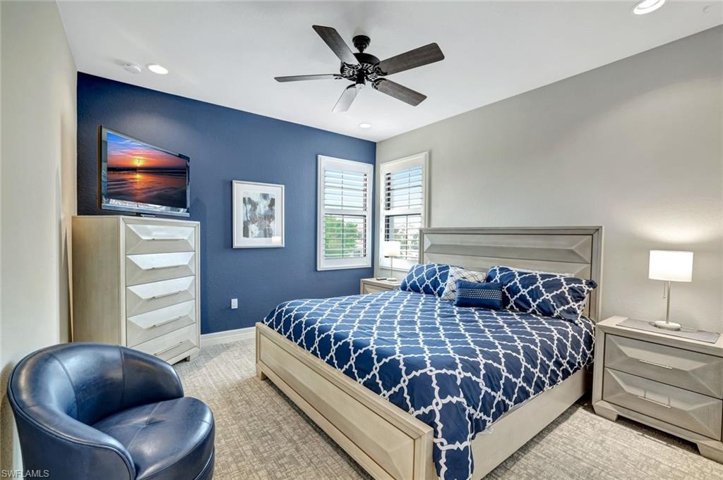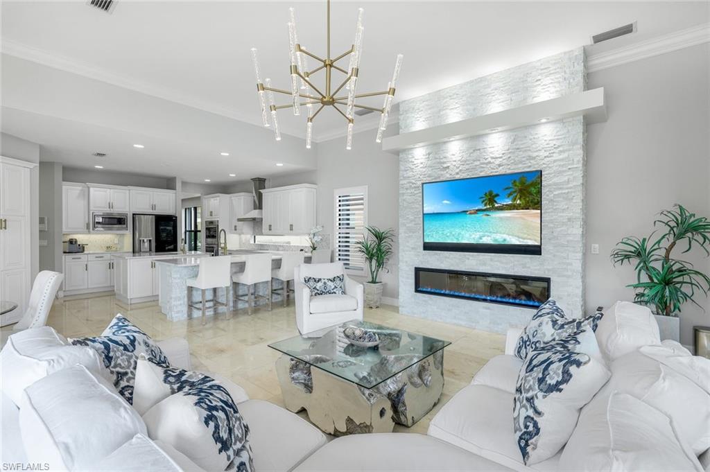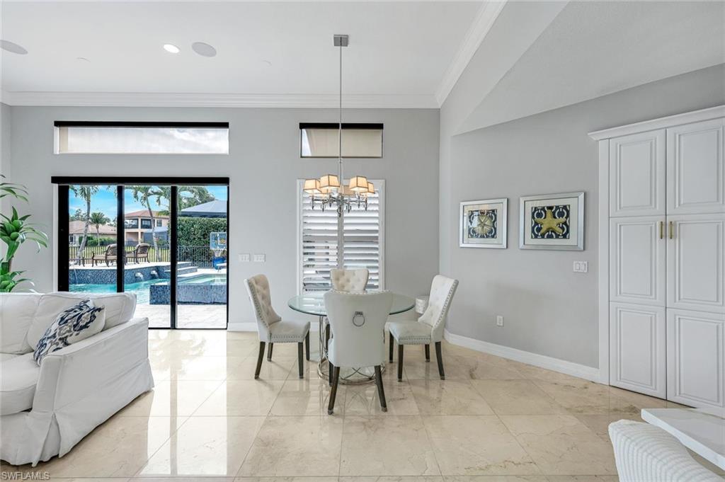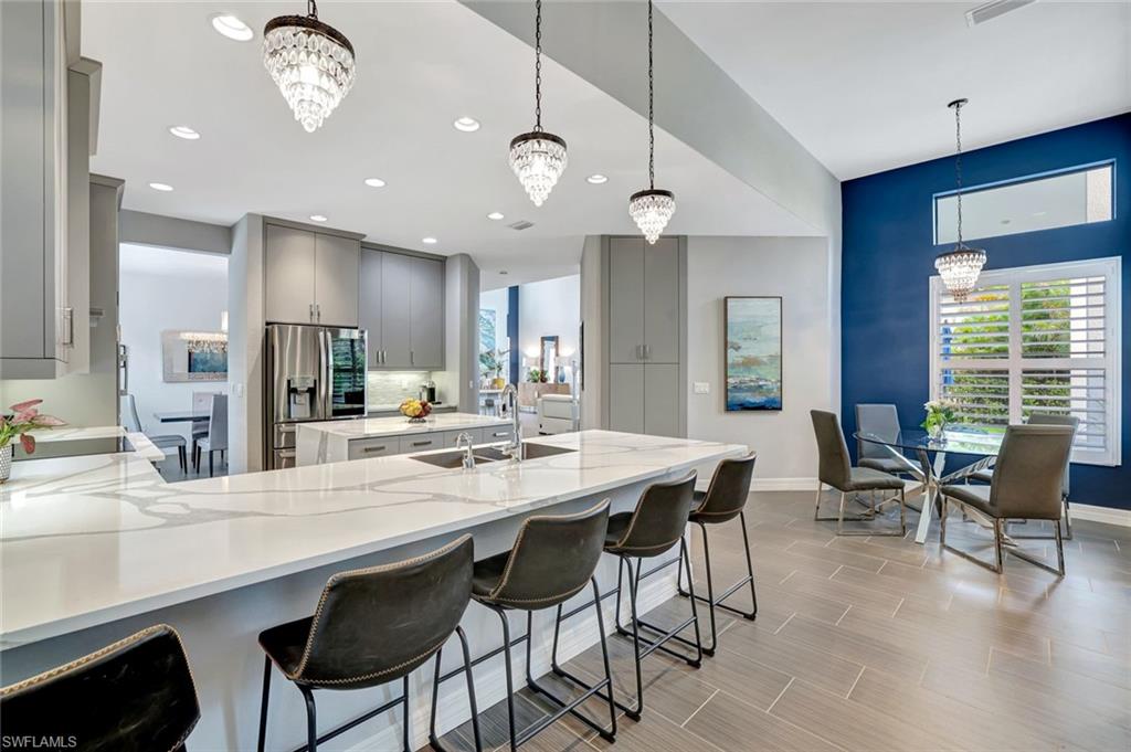 Behind the gated courtyard of this thoughtfully curated Carlyle lies a home designed for effortless living & unforgettable entertaining, where every day feels like a vacation. The interior has just been freshly painted, creating a crisp, inviting backdrop that complements the home’s refined finishes & sunlit spaces. Step through decorative glass entry doors into an expansive, entertainer’s dream layout, where the wet bar, great room, flexible dining area, and gourmet kitchen flow seamlessly to the outdoors. A sparkling lake view beckons you to the screened lanai, which offers ample room to relax or dine alfresco. Spend your days lounging by the saltwater pool, then prepare dinner in the outdoor kitchen—equipped with marine-grade cabinetry, a sink, granite surfaces, dual burners & a 60,000 BTU wok-capable burner, all powered by a buried 120-gallon propane tank. Inside, no detail has been overlooked. The chef’s kitchen features upgraded white cabinetry, granite counters, a new GE Café four-door refrigerator, double wall ovens, newer microwave, range with vented hood, custom pull-out shelves & a professionally painted island. Glass atrium doors with side panels enclose the dining space, adding elegance & allowing for flexible usage. The luxurious primary suite overlooking the lake includes dual custom closets, a serene sitting area & a renovated spa-like bath. The primary bath has been updated with a newly tiled walk-in shower with linear drain and new fixtures. Vanities feature new quartz counters, professionally painted cabinetry, framed mirrors & Rohl sinks. Both guest suites offer private baths & walk-in closets. One ensuite bath includes a remodeled shower with frameless glass doors & new tile. The versatile club room adapts to your needs—ideal as an office, den, or media space. Additional highlights include 18" porcelain tile throughout, plantation shutters, crown molding, Hunter Douglas Luminette sheers & built-in closets. A well-appointed laundry room offers a newer GE Profile washer and dryer, abundant cabinetry, a laundry tub, and a secondary refrigerator. The garage is equally refined with epoxy floors, insulated doors & built-in storage. Peace of mind comes standard with impact glass throughout, a Ring doorbell, fenced yard for pets, and a generator transfer switch. Additional upgrades include a new whole-house water softener system, UV lights on the A/C, & landscape lighting. Riverstone offers a vibrant, vacation-inspired lifestyle for all ages. Located in North Naples, just minutes from I-75 and zoned for "A"-rated schools, the community features a fitness center, social hall, resort-style pool, lap pool, spa, five lighted tennis courts, outdoor basketball and pickleball, a full indoor basketball court, tot lot, children’s water play area, game room, and an activities coordinator; making it easy to meet new friends. Whether hosting, relaxing, or simply enjoying the view, this home delivers the ideal setting for your Naples lifestyle.