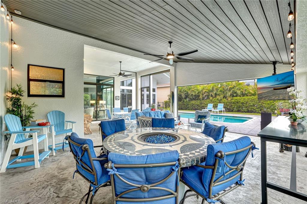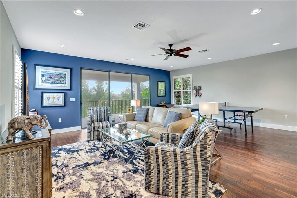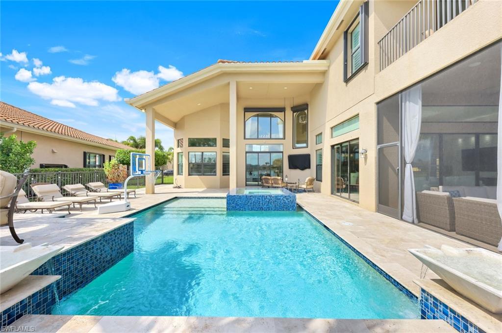 Live, Work & Play in Style – Exceptional Dubonnet Grande in Riverstone. Step into luxury with the highly sought-after Dubonnet Grande floorplan, thoughtfully designed for the way we live today—balancing work, relaxation, and entertainment, all under one roof. This expansive residence offers nearly 5,000 square feet of beautifully finished living space, including five spacious bedrooms, a versatile loft or den, a large game room, five and a half baths, and a three-car garage. From the moment you enter, soaring 20-foot ceilings and a bright, open-concept layout create an immediate sense of space and sophistication. Whether you're hosting gatherings or enjoying quiet moments at home, this inviting atmosphere sets the perfect stage for everyday life. The outdoor living area is equally impressive, featuring a large pool, three covered lanais, and a generous stamped concrete patio—all fully enclosed within a fenced yard that ensures privacy and tranquility. It’s a true backyard retreat, ideal for year-round enjoyment. Recent enhancements add to the home’s appeal, with a refreshed kitchen showcasing quartz countertops, updated tilework in the primary bathroom, and a complete interior and exterior repainting. A new paver driveway and walkway with raised stone planters, along with enhanced landscaping and upgraded exterior lighting, further elevate the home’s curb appeal. Impact-resistant doors and windows, paired with Storm Smart automatic shutters enclosing the expanded, screened lanai, provide peace of mind and comfort no matter the season. Located within the prestigious, amenity-rich Riverstone community, residents enjoy access to a state-of-the-art clubhouse, resort-style and lap pools, a hot tub, and a children’s water park. Fitness and recreation options abound with five Har-Tru tennis courts, pickleball and basketball courts, an indoor sports court, a dance studio, and a modern fitness center. Social spaces include lounges, a billiards room, and more—offering something for every member of the household. This exceptional home is nestled in an A-rated school district and ideally situated just minutes from I-75, upscale shopping, fine dining, and Naples’ renowned white-sand beaches. Discover the perfect blend of elegance, functionality, and lifestyle—schedule your private tour today!