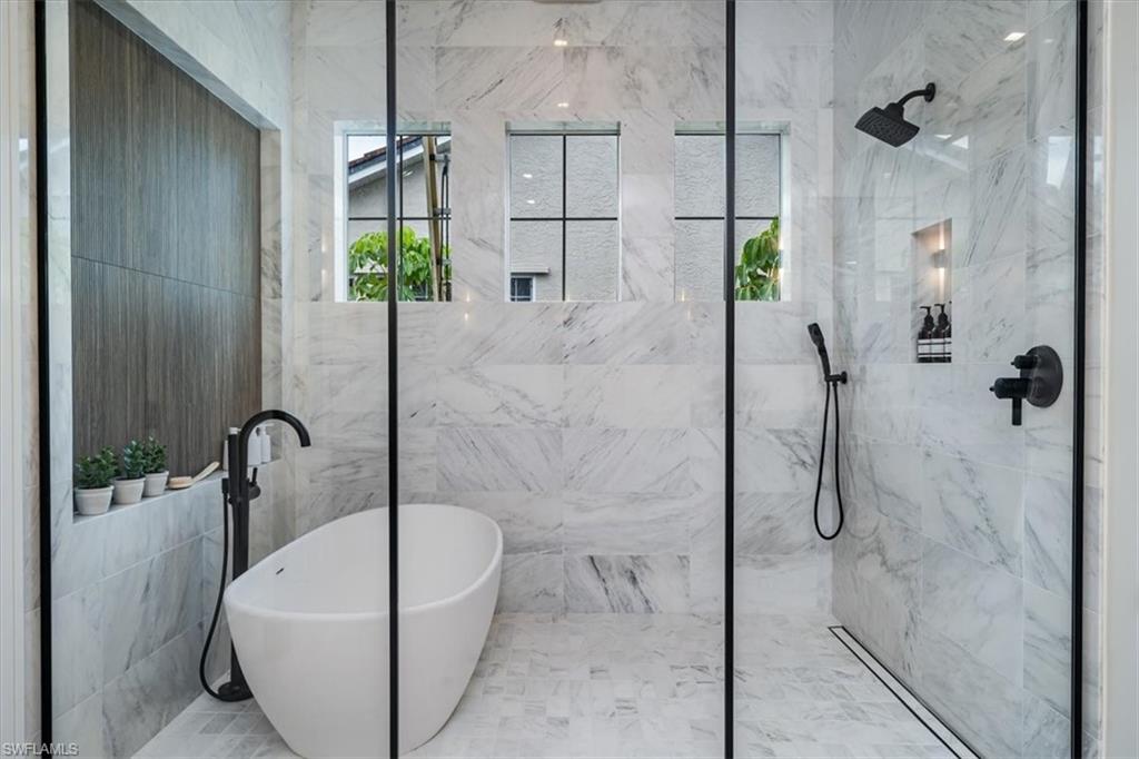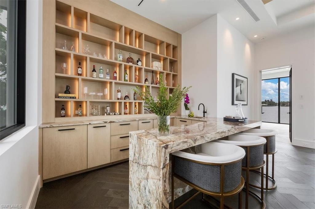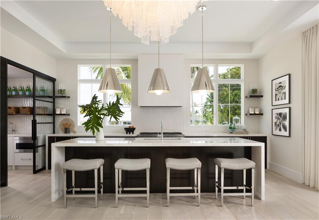 NO WATER from Helene or Milton - High and Dry **WINNER of the prestigious Sand Dollar Award for BEST Kitchen and BEST Design** Introducing the only opportunity of its kind in Naples: A chance to acquire a new construction, never-lived-in, exquisitely furnished residence on navigable water in this price range. Unparalleled luxury and design, as envisioned by Broad Avenue Studios, and brought to life by MHK Architecture and C&E Builders, awaits in this 4,470 sq. ft. waterfront haven in Royal Harbor, one of Naples’ most sought-after enclaves. Set mere minutes from the beach and downtown's vibrant 5th Avenue, this property brings together all of the qualities of a first-class Naples location where you can enjoy shopping, dining and sunsets within minutes of your front door. Your backyard becomes your launchpad to the Gulf of Mexico, plus you are just 6 minutes to Naples Executive Airport. Thoughtfully curated down to every detail, the interiors combine 4 ensuite bedrooms, a den and 6 baths with generous living spaces, a gourmet kitchen with butler's pantry and a striking bar with black metal and glass hanging shelves. Rich wood tones, architecturally-detailed ceilings, reeded cabinetry, bright marble coating on the counters, matte black metal accents, and polished chrome fixtures create an unforgettable backdrop for upscale living and entertaining by the sea. Beyond, a sun-drenched Florida room, summer kitchen, and heated pool/spa surrounded by a wood deck, complete the picture of this chic-yet-tranquil Naples retreat.