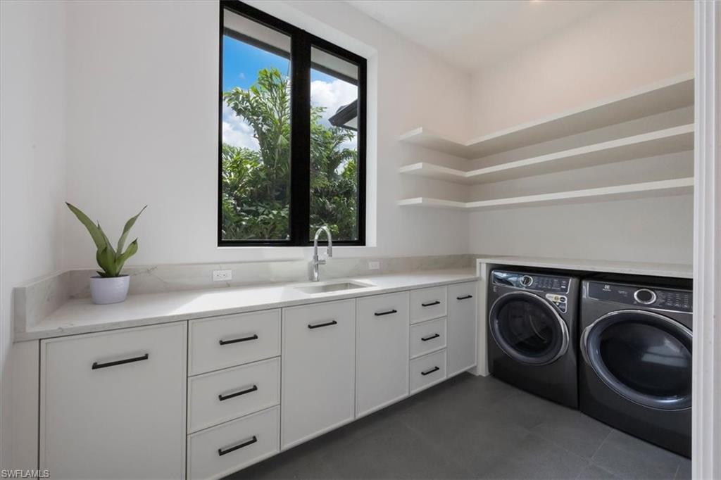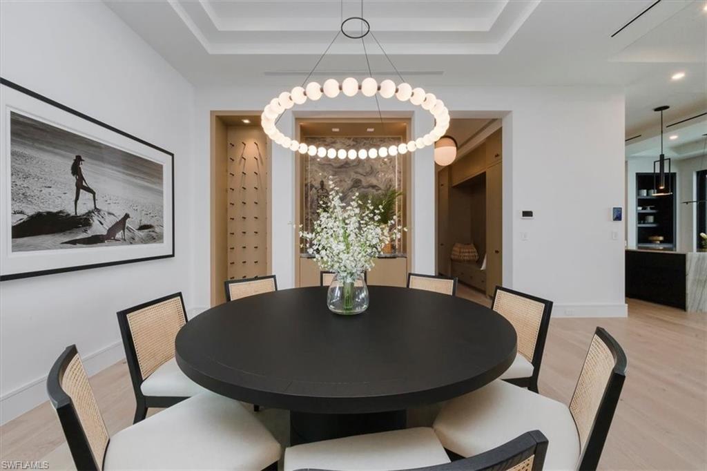 Step into the pinnacle of luxury waterfront living with this one-of-a-kind masterpiece, built to the newest base flood elevation code. Crafted by the acclaimed team of C&E Builders and renowned designer Ruta Menaghlazi of Theory Design. This stunning 6,500 square-foot custom estate is a testament to visionary design and unparalleled craftsmanship. Every inch of this home exudes sophistication and elegance, offering breathtaking panoramic water views that greet you the moment you step inside. As you enter, you are welcomed by an expansive living room bathed in natural light, with floor-to-ceiling windows framing sweeping vistas of the bay. This space is perfect for entertaining, where indoor-outdoor living is effortless, and every sunset becomes an event to be savored. Seamless flow leads you to the outdoor oasis, where a sun shelf, a custom spa, and a sparkling pool beckon you to soak up the western exposure sun or relax under the stars. The heart of this residence is the chef’s kitchen—a true showpiece with luxurious quartzite countertops. The oversized center island invites both grand celebrations and casual gatherings, while top-tier appliances await the culinary enthusiast. Tucked away, a tastefully concealed butler’s pantry offers generous prep and storage space, ensuring effortless entertaining. The primary suite on the main level is a serene sanctuary, designed for ultimate relaxation. Its spa-like en-suite bath boasts elegant finishes, a soaking tub, and an oversized shower with multiple showerheads, delivering a resort-like experience right at home. Upstairs, via your private elevator, you'll discover a versatile loft and morning kitchen, perfect for guests to enjoy their own slice of paradise. Each guest bedroom is ensuite, offering balconies with mesmerizing water views. Entertainment knows no bounds here, with a first-floor club room that has it all, including a luxury billiards table, a custom bar and a movie theatre-style TV sitting area. Attached to the club room is a fifth ensuite bedroom that could also be used as a study or workout room. For boating enthusiasts, the home's 157 feet of water frontage provides direct, bridge-free access to the Gulf of Mexico, making it a boater’s dream come true. This estate places you just minutes from the world-class shopping, dining, and pristine beaches of 5th Avenue South. This is more than a home—it’s an experience, a statement, and the epitome of Naples living.