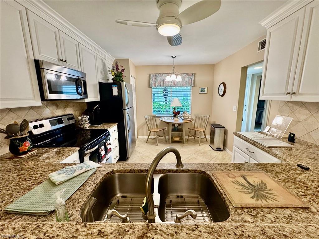Welcome to Cranbrook Colony! One of Royal Wood's finest condo villages. This FIRST FLOOR END UNIT WITH THREE BEDROOMS AND TWO BATHS PLUS ONE-CAR DETACHED GARAGE is perfectly priced and ready for you to move in and enjoy Season 2026! Upon entering, the remodeled eat-in kitchen is to the right with a window offering lots of Florida sunshine, granite countertops and stainless steel appliances. This unit is furnished with vinyl plank flooring and tile throughout the main living areas and carpet in the bedrooms. Additional highlights include an second window in 2 bedrooms allowing extra light, a walk-in primary bedroom closet and a large laundry room with washer, dryer, and plenty of storage for your beach supplies. Enjoy your morning coffee or your favorite beverage on your private screened-in lanai overlooking the golf course or meet your new neighbors at Cranbrook's pool, tennis courts w/pickleball lines, and bocce courts or bike or drive to the clubhouse to enjoy the restaurant, fitness center, pro-shop, library, fire pit, etc. Royal Wood offers an 18-hole championship golf course w/multiple tees, 2 practice areas & walk-on privileges. Golf memberships are immediate with no waitlist & 70 brand new golf carts add to the fun! Social activities include live music, happy hours, cards, trivia, bingo, cornhole games, golf scrambles, holiday dinner dances & more! Located just 6 miles from Naples' famous 5TH AVE South, 3RD ST South & beautiful Gulf beaches, Royal Wood is just a few short miles from Naples Pickleball Center, Celebration "food truck" Park, Tin City, Sugden Park, Naples Botanical Gardens, Physicians Regional Hospital & more. Take a 15 mile drive to beautiful Isles of Capri or Marco Island and enjoy your new hometown.