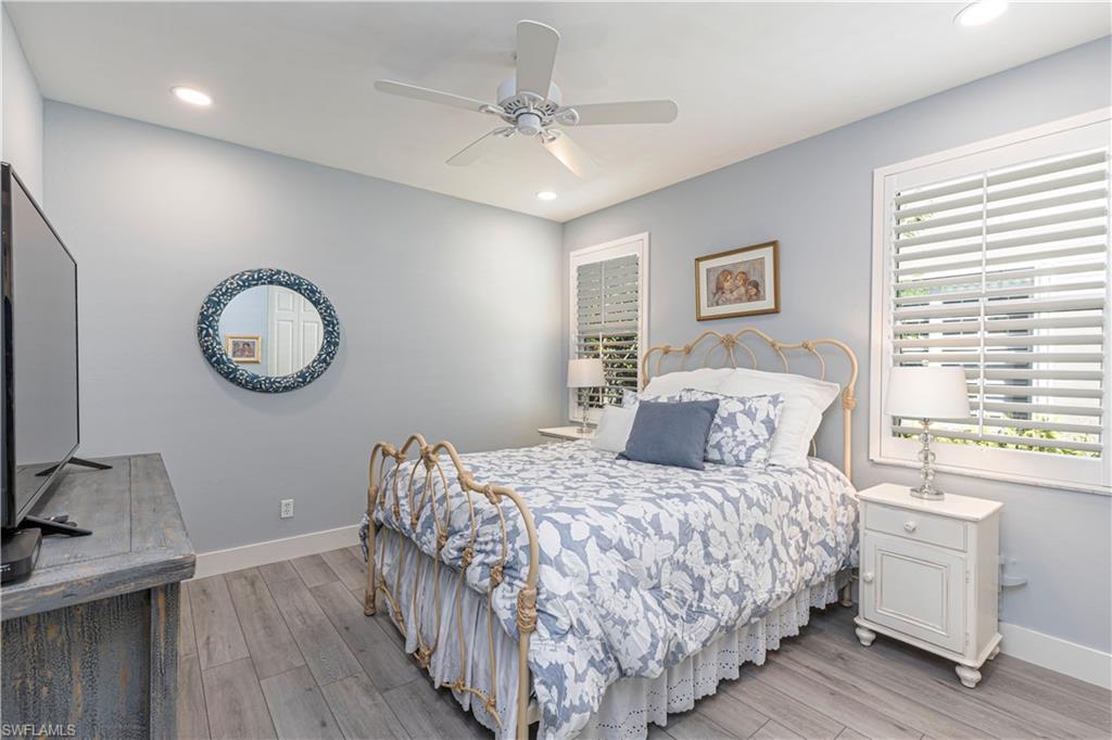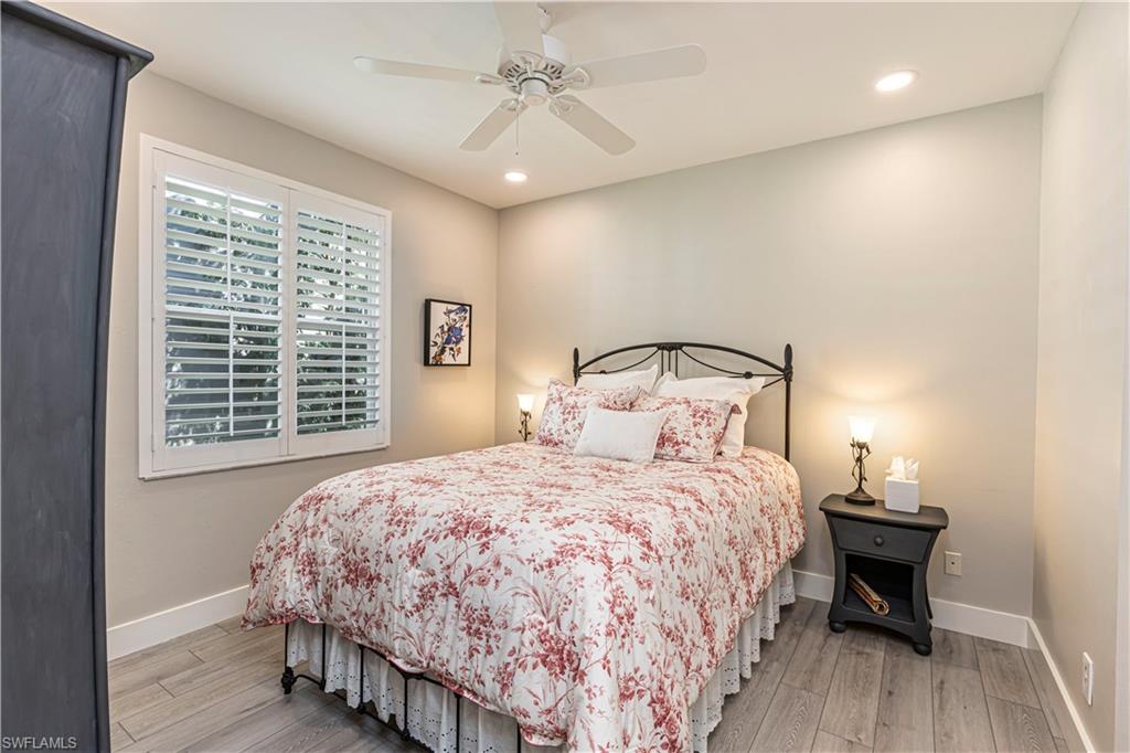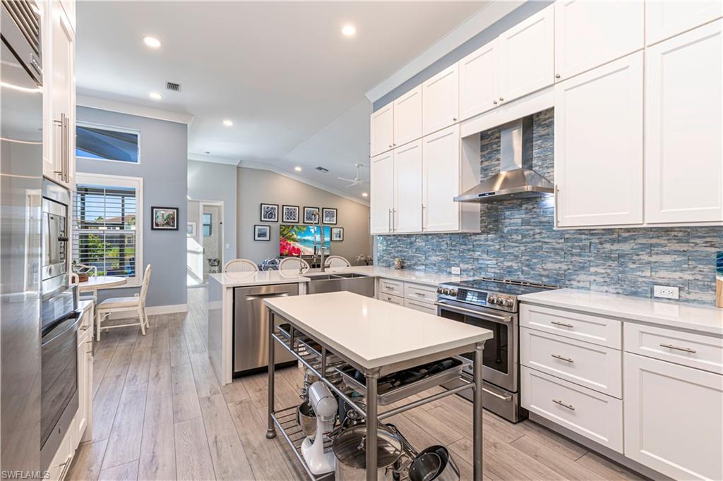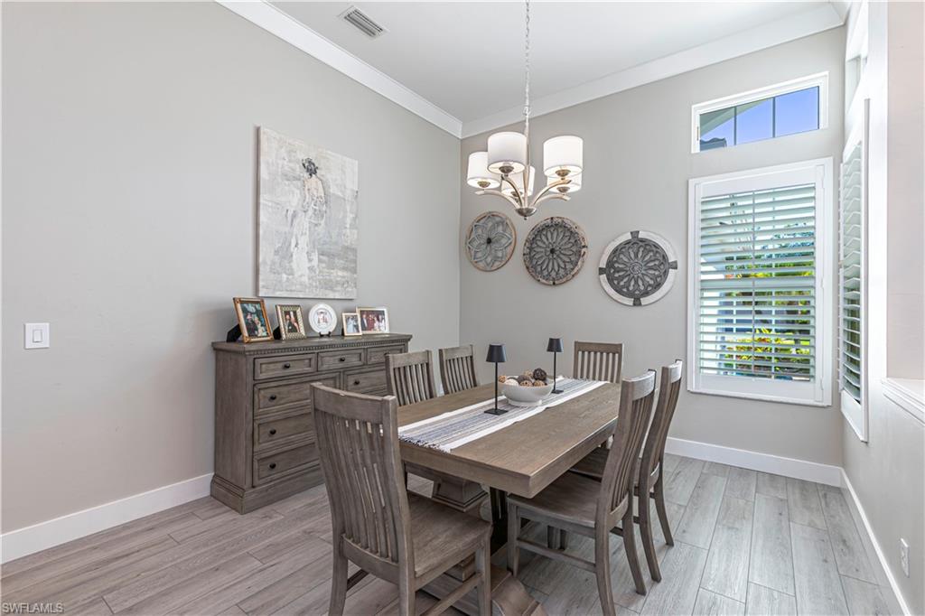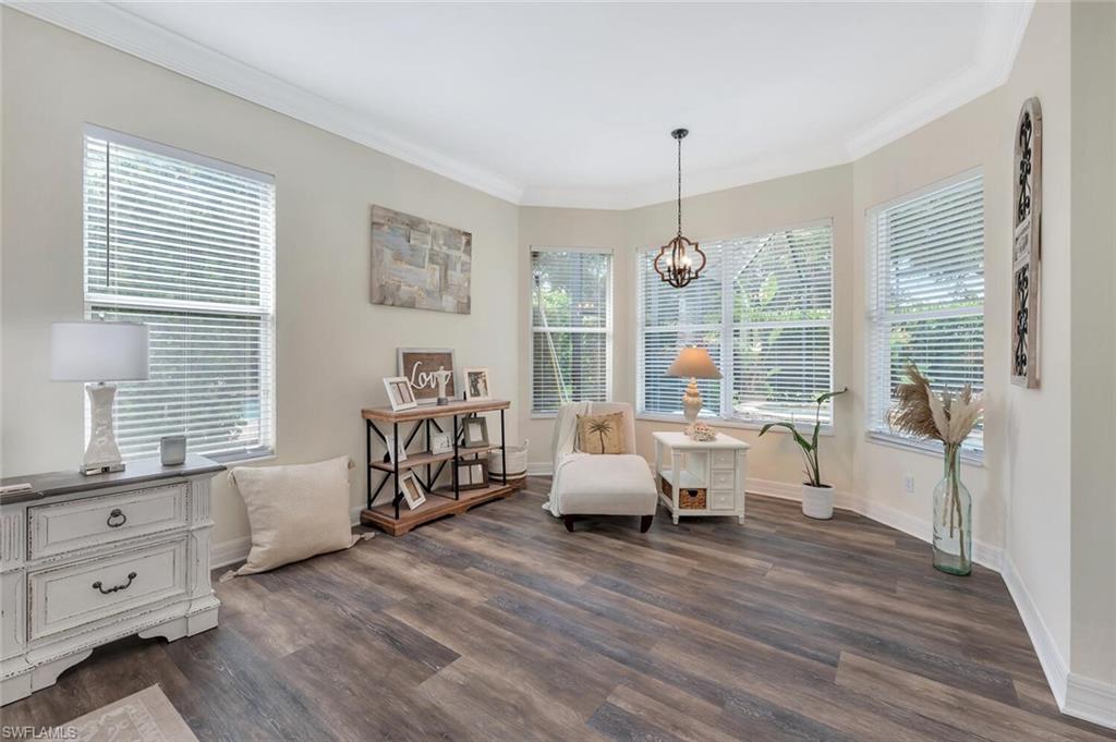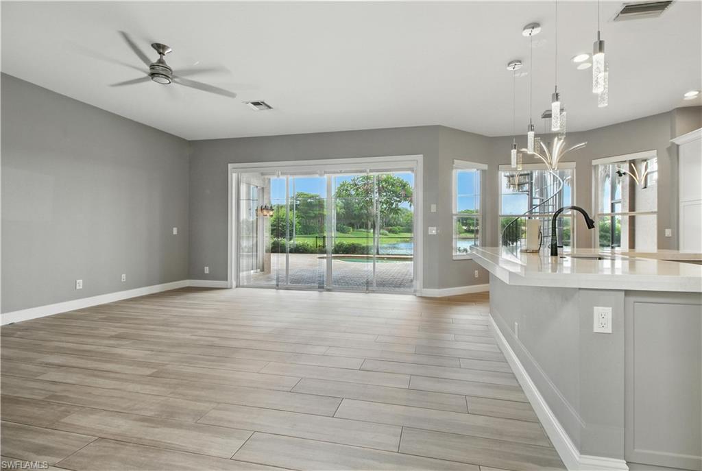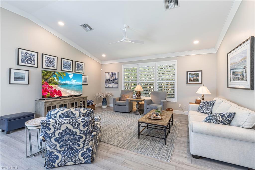 Beautifully updated 3 bed + den + loft, 3 bath pool home with western exposure in the gated community of Saturnia Lakes. This 2,735 sq ft home features engineered wood flooring throughout, custom 4” plantation shutters, and a fully remodeled kitchen with quartz countertops, a 10’ island, ceramic backsplash, and new LG appliances. All bathrooms have been tastefully renovated with quartz countertops and frameless glass showers. The den serves as a built-in home office with custom cabinetry, while additional upgraded features throughout the home include shiplap accents and enhanced LED lighting. Upstairs, a spacious loft offers a versatile bonus area that could be used as a fourth bedroom, media room, or playroom. It even has a large walk in closet! Enjoy stunning sunsets from the screened lanai with a saltwater pool, spa, fountains, LED lighting, and iAquaLink phone app control. The garage features kitchen-grade built-in cabinets for extra storage. Bedrooms and great room are pre-wired for wall-mounted TVs. This property is not in a flood zone! Saturnia Lakes offers resort-style amenities including a 12,000 sq ft clubhouse, fitness center, tennis courts, basketball, spa, pool, and more—plus 24-hour gated security and full lawn care. Ideally located just minutes from I-75 and Logan Blvd.