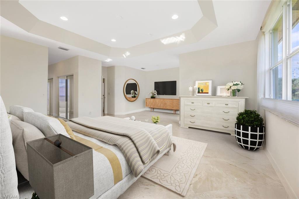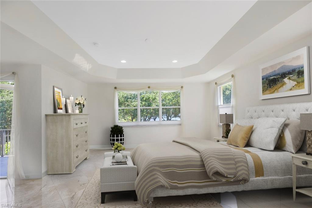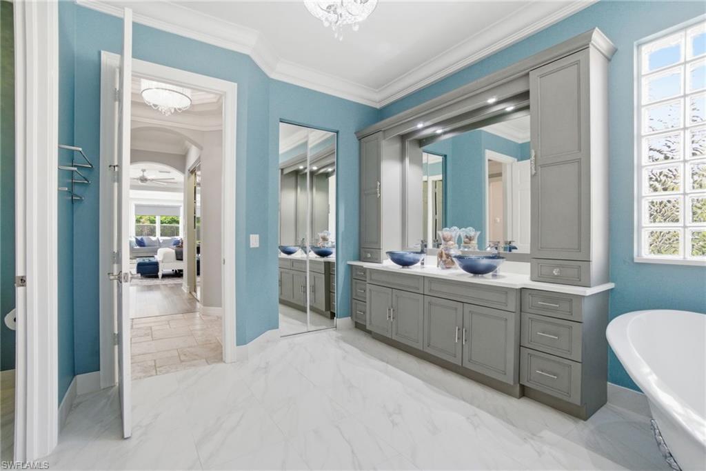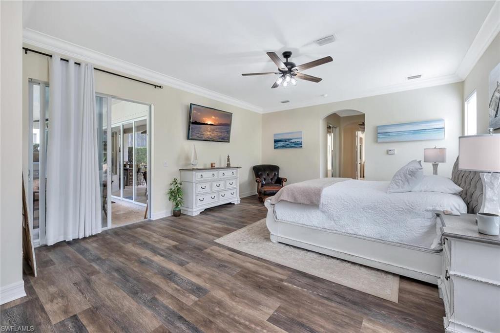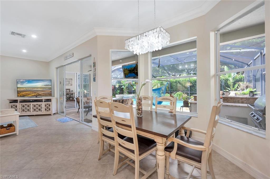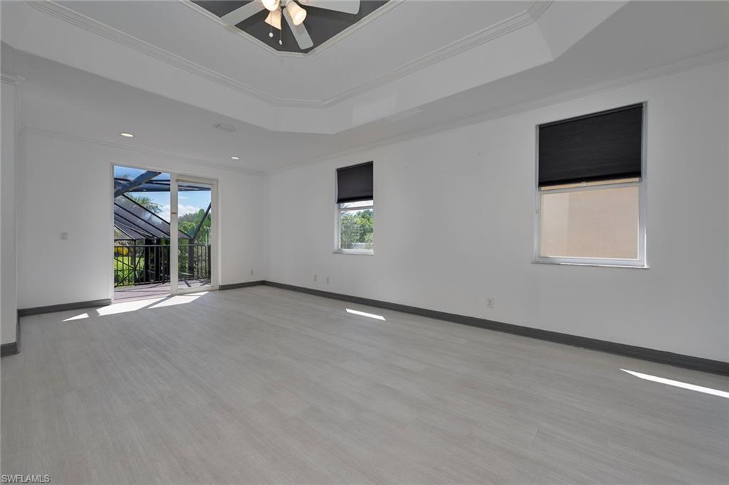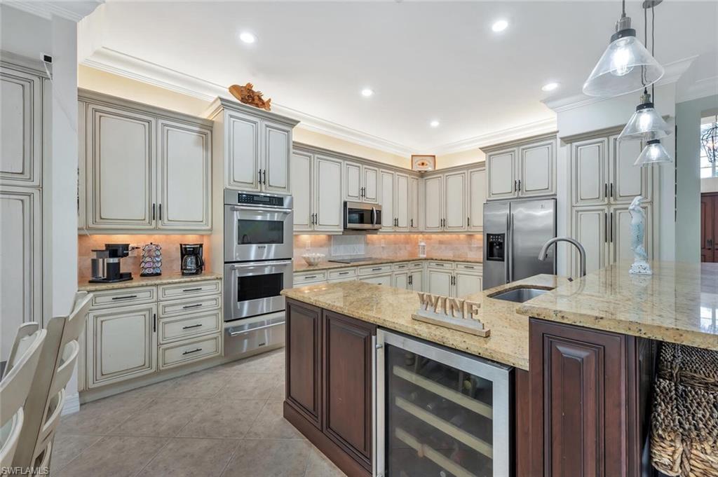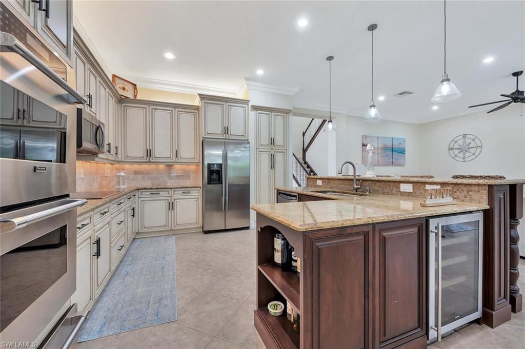 The view you’ve been dreaming of! This rare “Pink Diamond” model—one of the largest homes in Saturnia Lakes—sits on a premier cul-de-sac lot with 160 feet of lake frontage and breathtaking water views from three sides. Step through the leaded glass doors and immediately take in the wow-factor: an open, elegant layout that leads straight to those endless lake views. With 4,083 sq. ft., this home offers 5 bedrooms, 4 full baths, and 5 large walk-in closets, giving everyone space to relax. The expansive kitchen features wood cabinets, granite countertops, a center island, walk-in pantry, and a new 80-bottle wine fridge. The great room is perfect for movie nights, while the formal dining room easily seats ten. Outside, your private oasis awaits—picture-window lanai, lush palms, and a sparkling pool (with new heater) overlooking the lake, fountain, and bridge. Upstairs, the spacious primary suite includes an attached den/exercise room and French doors to a huge private veranda—the ideal spot for sunrise, sunset, and watching wildlife. Additional features include plantation shutters, crown molding, tray ceilings, updated fixtures, and a 3-car garage. Saturnia Lakes offers resort-style living with 3 pools, fitness center, yoga/dance studio, billiards, tennis, playground, and a vibrant clubhouse—plus top-rated schools and a short drive to Naples white sand beaches, world-class dining, and great shopping. A truly stunning home—don’t miss your chance to make it yours!