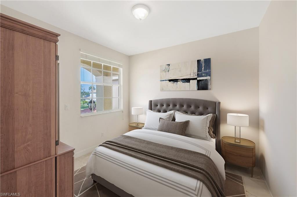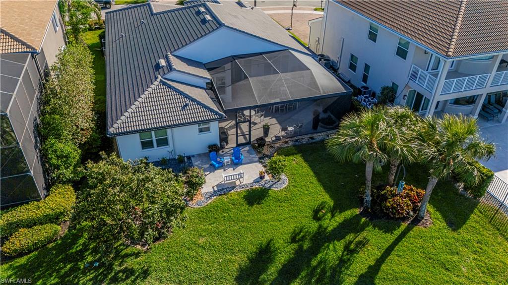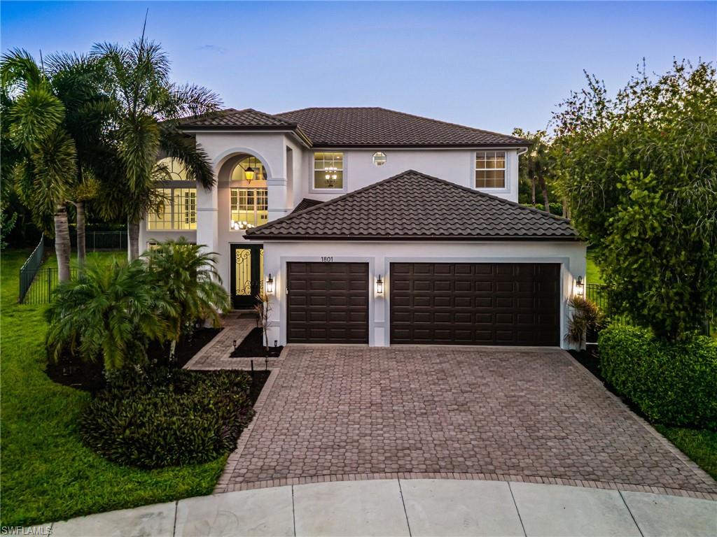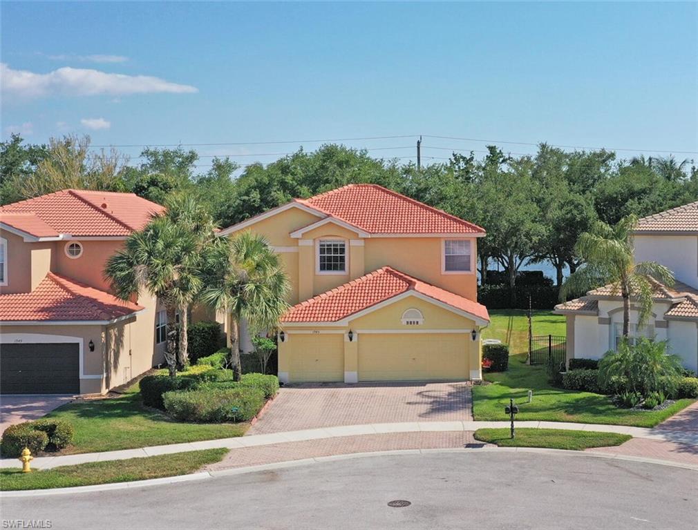 Cul de sac location boasts sweeping views down Isla de Palma Circle and water views from your opulent primary bedroom overlooking a lush oversized backyard. Sip your morning coffee or tea off the primary bedroom's balcony while soaking in the sun's southern exposure watching the light reflect off the lake. A three car garage and oversized driveway is perfect for multiple vehicles and storage. GL Homes five bedroom three bath Flamingo model floorplan creates a feeling of grandeur upon entry while keeping the home's flow cohesive and functional for family and entertaining. The interior has been freshly painted and boasts neutral warm 24x24 tile throughout. One bedroom is located on the first level of the home which could be used as an in law suite or office/den. Natural light floods the home, but recessed lighting has been added throughout. Roof was replaced in 2018, AC 2019, and hot water heater in 2021. Community amenities include lap pool, main pool, tot water area, clubhouse with 12,000 square feet which includes a grand ballroom, sports and billards room, card room, dance studio, fitness center, arts and crafts center, and an Internet Cafe. In addition to the clubhouse, Saturnia Lakes offers four lighted Har-Tru tennis courts complete with an onsite tennis pro, sandy beach, a basketball and pickleball court, men's and women's saunas, winding walking/jogging paths throughout, a tot lot playground, and a lakefront putting green complete with an A rated school system! Start living the SWFL lifestyle at 1945 Isla de Palma Circle today! *Some pictures are virtually staged to showcase the Flamingo floorplan's potential.*
