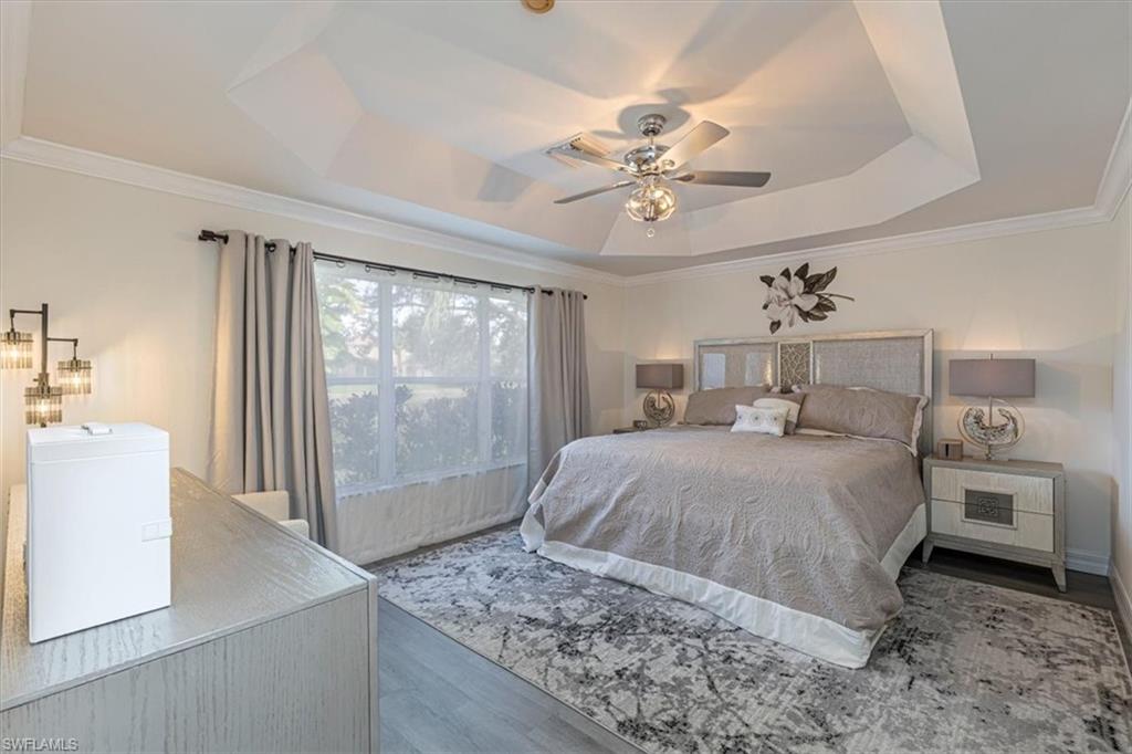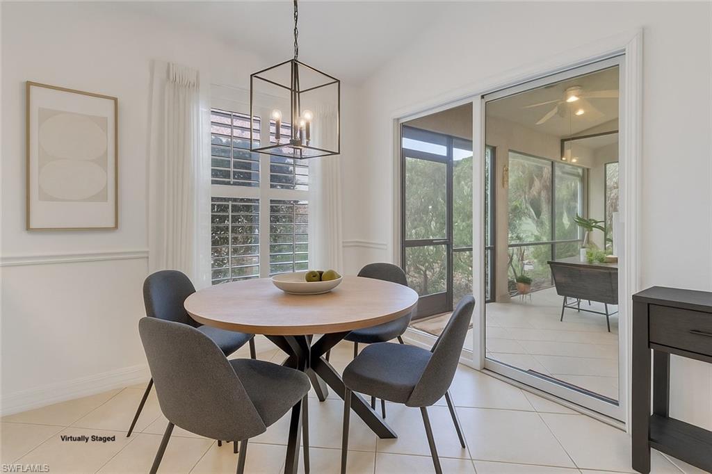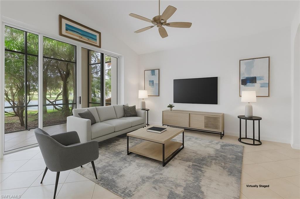 This beautifully upgraded single-family home is in a quiet street on wonderfully situated lake front lot offering a tranquil backyard sanctuary and excellent privacy. With two bedrooms, a den, two baths and a two-car garage, the home boasts an open floor plan and 1,926 square feet of living space. The interior features new seamless porcelain tile flooring throughout the main living areas, vaulted ceilings and an abundance of natural light from large windows protected by electric storm shutters for peace of mind. The gourmet kitchen features clean white cabinets with ample storage, solid state countertops with accenting backsplash. The adjacent breakfast nook offers views of the lake and access to the screened lanai. Being sold fully-furnished means you can just turn the key and unpack your bags.The owner’s suite is a private oasis, complete with a tray ceiling, Large windows and excellent closet space. The en-suite bath features a walk-in shower with floor-to-ceiling tile, and glass enclosure. The dual sink vanity, makeup counter and soaking tub complete the suite’s luxurious appeal. A spacious den/office or study can serve as a third bedroom. The guest bedroom is adjacent to a beautifully designed bath for convenience and privacy Additional features include a spacious 2-car garage. The laundry room is well-equipped with storage cabinets, a utility sink. In the award-winning Saturnia Lakes community, residents enjoy resort-style living with amenities such as two heated pools, a children’s only pool, a hot tub, fitness room, dance studio, internet café, tennis courts, saunas and more. With A-rated schools and proximity to shopping and restaurants, you don’t buy a home, you buy a lifestyle. The Naples lifestyle.