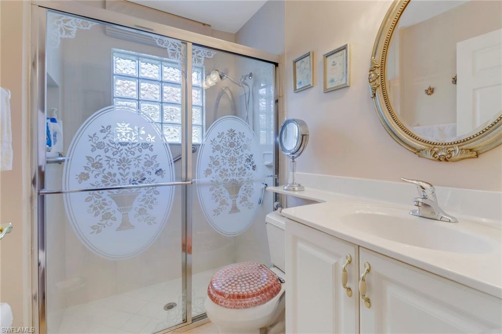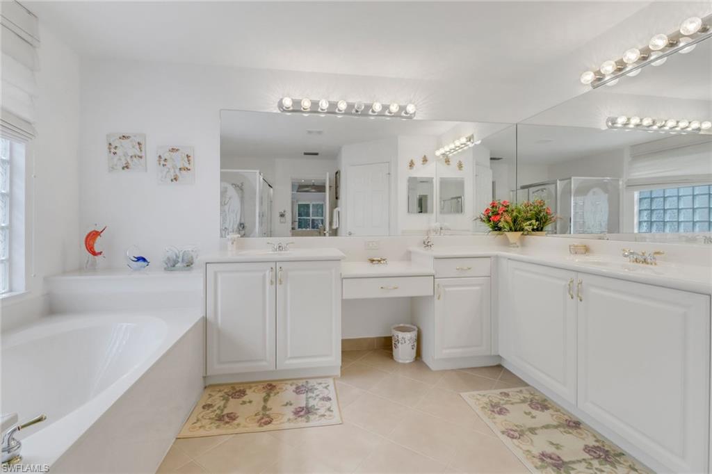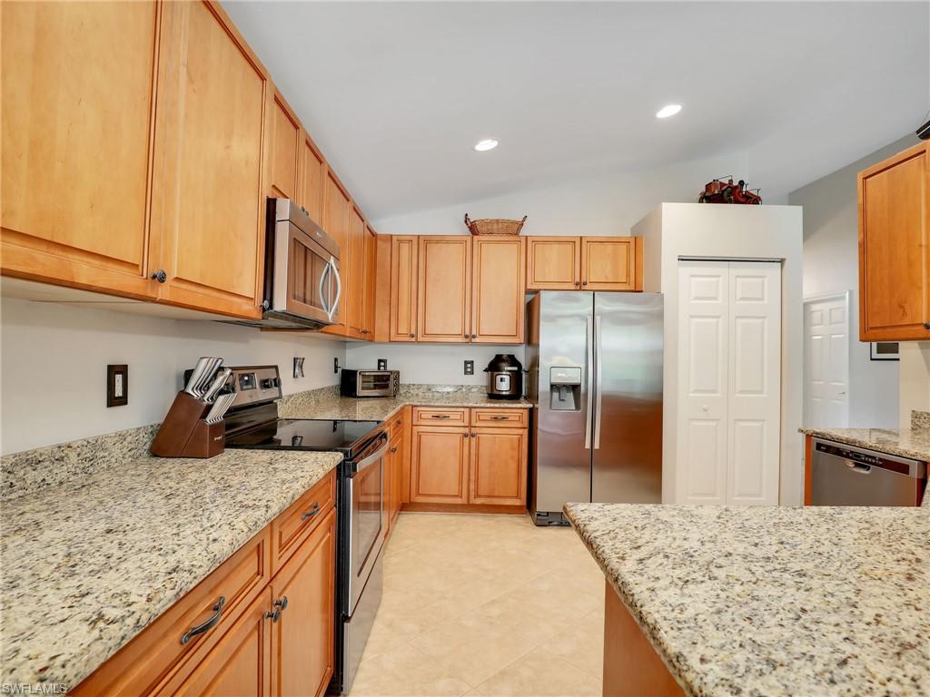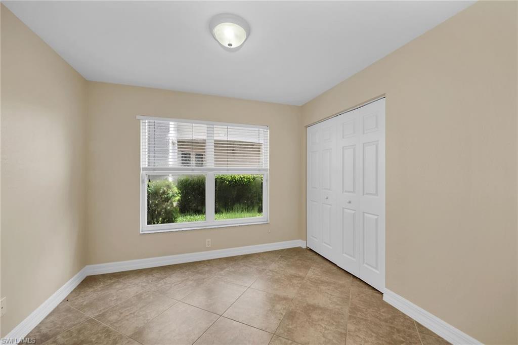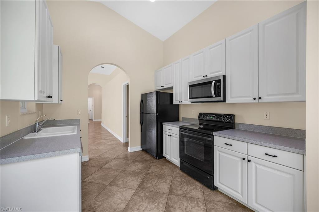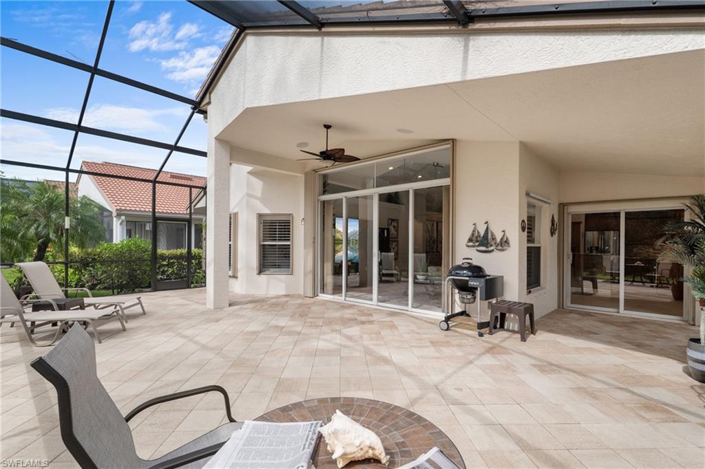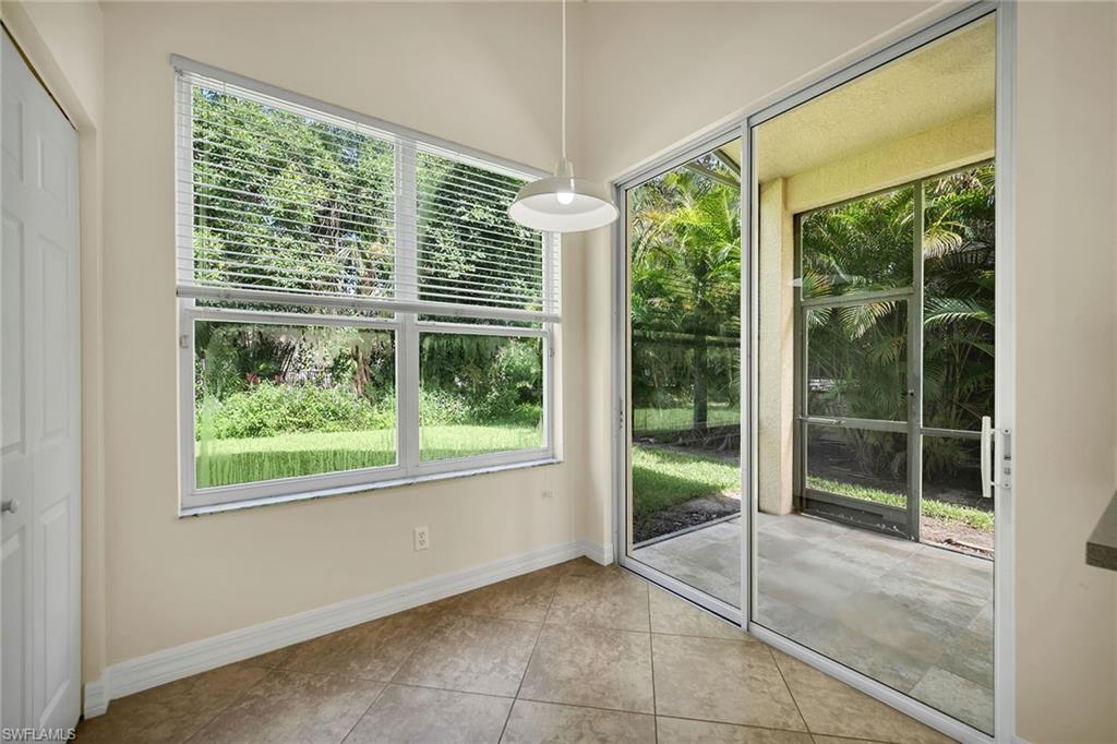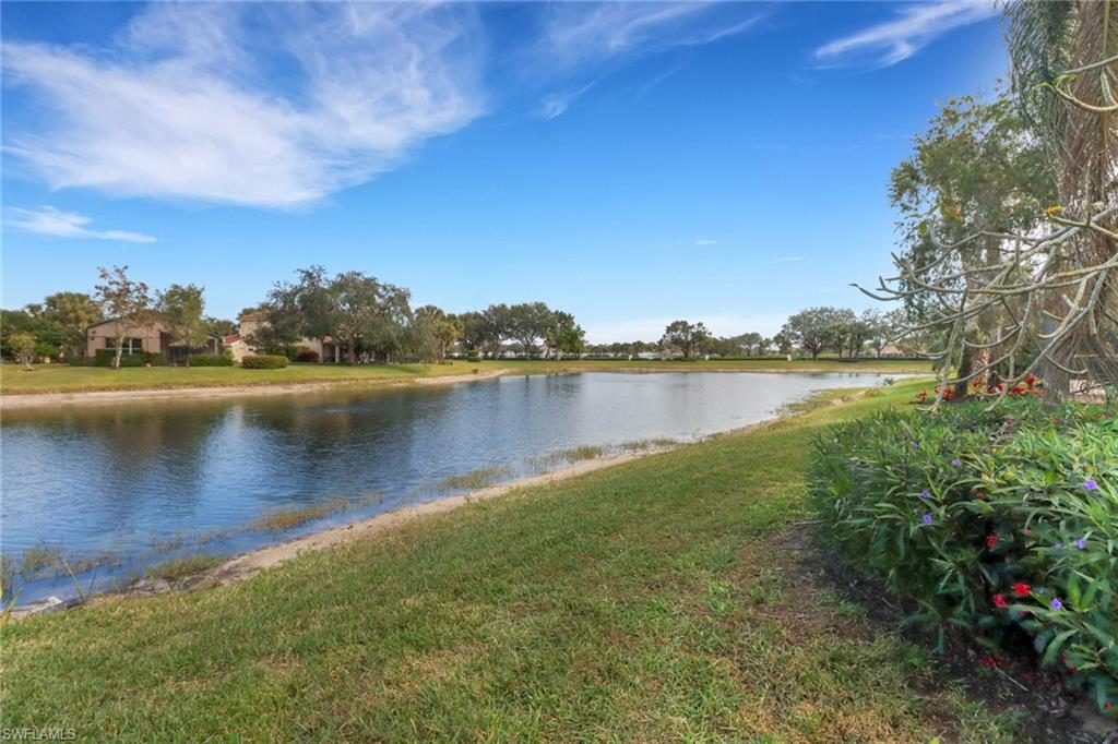 Tucked away on a quiet cul-de-sac in Saturnia Lakes, this well-maintained residence offers western exposure and private garden views, all in a prime North Naples location just minutes from world-class shopping, dining, Gulf beaches, and with quick, convenient access to I-75. Surrounded by lush landscaping and bathed in natural light, this 3-bedroom, 2-bath home features vaulted ceilings, arched walkways, and a bright, welcoming ambiance perfect for relaxed Florida living. The screened lanai offers a peaceful retreat with tranquil views, while manual shutters provide added storm protection. Inside, the home features diagonal tile flooring throughout and large windows that fill the space with natural light. The kitchen is both functional and inviting, offering shaker-style cabinetry, recessed lighting, a pantry, and a charming window above the sink. Appliances include a range, newer microwave, refrigerator/freezer, and dishwasher. An adjacent dining area overlooks the garden through a picture window and offers direct lanai access via sliding glass doors. The living room continues the indoor-outdoor flow with its own glass sliders opening to the lanai. The owner’s suite is a serene haven with tray ceilings, two walk-in closets with built-in shelving, and lush tropical garden views. The en-suite bath includes a dual sink vanity, a full-width mirror, and a floor-to-ceiling tiled walk-in shower with glass enclosure. Two guest bedrooms are thoughtfully positioned near a full bath featuring a shower/tub combo with matching floor-to-ceiling tile. Additional features include a GE washer and dryer with overhead cabinetry and a spacious 2-car garage. Just steps from your front door, the Saturnia Lakes clubhouse offers an impressive array of resort-style amenities. Enjoy the heated resort pool, lap pool, relaxing spa, fully equipped fitness center, saunas, tennis and basketball courts, billiards room, ballroom, playground, and more. With low HOA fees, 24-hour manned security, and services like landscaping, irrigation, and high-speed fiber optic internet included, Saturnia Lakes provides a low-maintenance, high-comfort lifestyle in one of North Naples’ most convenient and amenity-rich communities. Whether you're commuting, heading to downtown Naples, or catching a flight, the proximity to I-75 makes reaching Southwest Florida International Airport, medical centers, and surrounding areas fast and effortless.