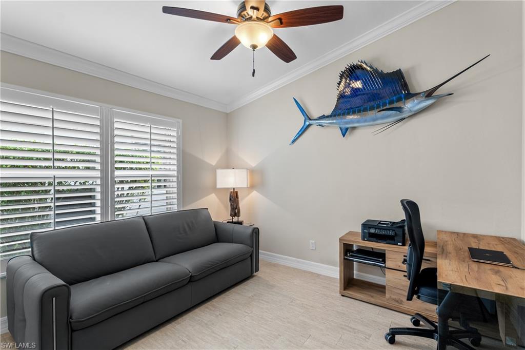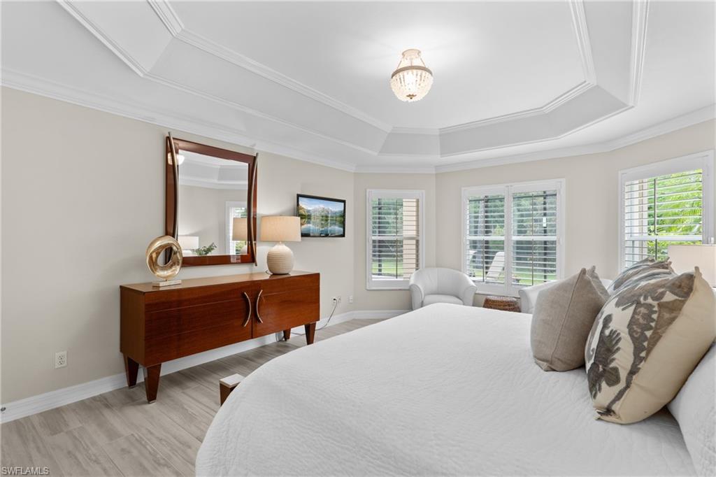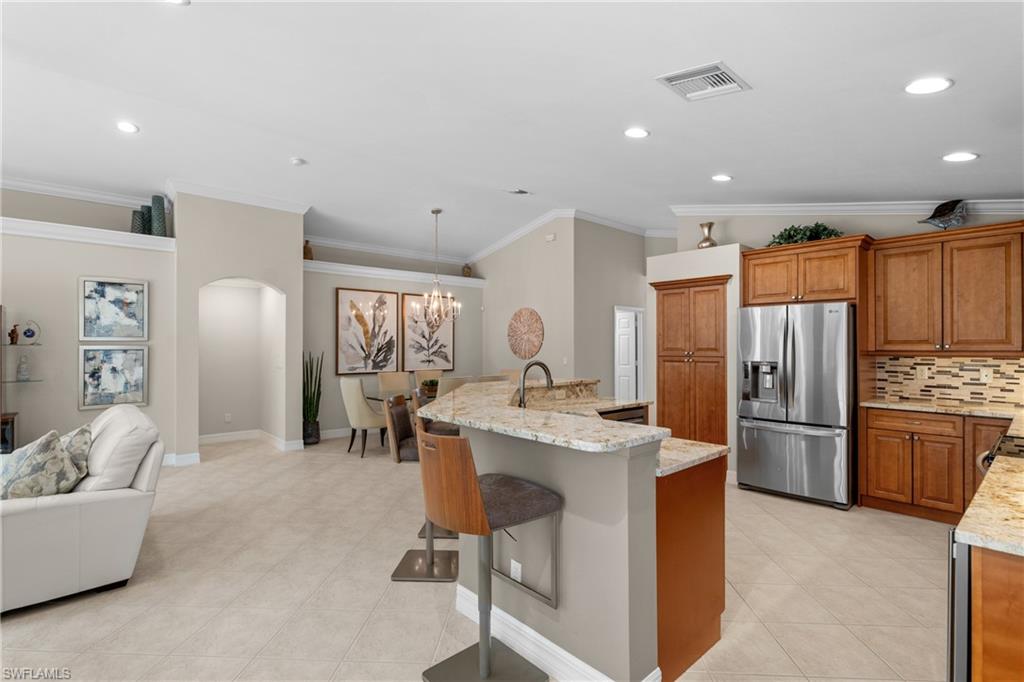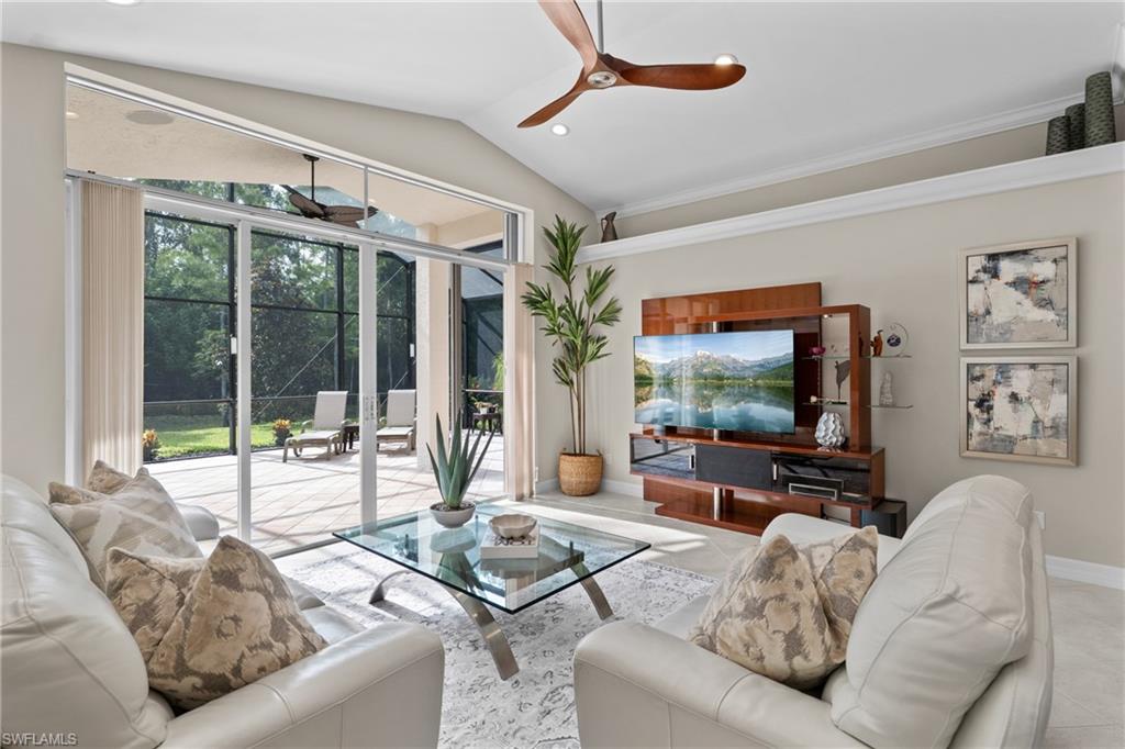This immaculate and lovingly cared for "Egret" is situated at the end of a quiet cul-de-sac street in the amenity rich community of Saturnia Lakes in North Naples. From the moment you walk in the double glass front doors, you are greeted with a bright and airy open concept floorplan with 13 foot vaulted ceilings and two sliding glass doors leading to the extended screened lanai overlooking a tranquil preserve. The updated kitchen features a large island with bar seating for six, solid wood cabinetry, and stainless steel appliances including a built-in wine cooler. The master suite features his & hers walk in closets, and bath with dual vanities, soaking tub, and a recently retiled walk in shower with frameless shower enclosure. A long list of special features include: NEW ROOF (2021); new wood look tile floors throughout the den, primary suite & bathroom; new bathroom cabinetry, quartz countertops, fixtures, and frameless shower enclosure in the primary bathroom; primary bedroom closet built-ins; plantation shutters on all widows; accordion style hurricane shutters on all windows and doors; electric roll down hurricane shutter on the front door & transom window; crown molding throughout; fresh interior & exterior paint; finished garage floor; and more! Saturnia Lakes offers a resort pool, hot tub, lap pool, kiddie pool, saunas, fitness center, billiards room, ball room, 4 tennis courts, basketball court, and more! HOA fees include home landscaping/irrigation, all clubhouse amenities, 4 tennis courts, basketball courts, playground, manned gate, alarm monitoring, cable TV, internet, & home phone line! Convenient North Naples location close to I75/Seed to Table/Beaches!